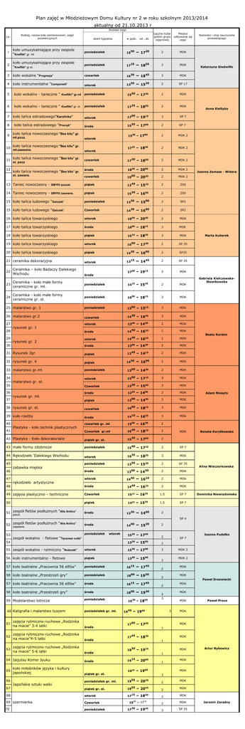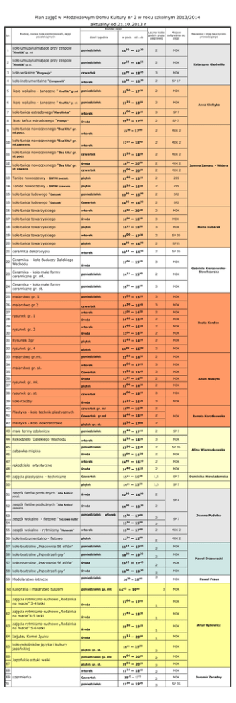 Plan zajęć w Młodzieżowym Domu Kultury nr 2 w roku szkolnym 2013/2014 aktualny od 21.10.2013 r Rozkład zajęć Rodzaj, nazwa koła zainteresowań, zajęć pozalekcyjnych Lp. dzień tygodnia w godz. od …do Łączna liczba godzin grupy zajęciowej Miejsce odbywania się zajęć 1 koło umuzykalniające przy zespole "Knefliki" gr. mł poniedziałek 15 50 – 1720 2 MDK 2 koło umuzykalniające przy zespole "Knefliki" gr.st. poniedziałek 17 25 – 1855 2 MDK 3 koło wokalne "Progresja" czwartek 16 30 – 1845 3 MDK 4 koło instrumentalne "Campanelli" wtorek 13 50 – 1520 2 SP 17 5 koło wokalno - taneczne " Knefliki" gr.mł poniedziałek 15 50 – 1720 2 MDK 6 koło wokalno - taneczne " Knefliki" gr. st. poniedziałek 17 25 – 1855 2 MDK wtorek 17 00 – 1915 3 SP 7 środa 15 30 – 1700 2 SP 7 1530 - 1700 2 MDK 2 1710 – 1840 2 MDK 2 7 koło tańca estradowego"Karolinka" 8 koło tańca estradowego "Promyk" 9 10 11 12 koło tańca nowoczesnego "Bez kitu" gr. mł.pocz. wtorek koło tańca nowoczesnego "Bez kitu" gr. mł.zaawans. koło tańca nowoczesnego "Bez kitu" gr. st. pocz koło tańca nowoczesnego "Bez kitu" gr. st. zawans. wtorek czwartek 17 20 – 1850 2 MDK 2 środa 1830 – 2000 2 MDK 2 – 20 30 2 MDK 2 czwartek 19 00 13 Taniec nowoczesny - SMYKI poczat. piątek 13 40 – 1510 2 ZSS 14 Taniec nowoczesny - SMYKI zaawans. piątek 15 20 – 1650 2 ZSS 15 koło tańca ludowego "Gaiczek" poniedziałek 13 30 – 1500 2 SP2 15 koło tańca ludowego "Gaiczek" Czwartek 14 30 – 1600 2 SP2 16 koło tańca towarzyskiego wtorek 1850 – 2020 2 MDK 17 koło tańca towarzyskiego środa 1600 – 1815 3 MDK 18 koło tańca towarzyskiego piątek 1615 – 1830 3 MDK 19 koło tańca towarzyskiego wtorek 16 00 – 1730 2 SP 35 20 koło tańca towarzyskiego piątek 14 30 – 1600 2 SP35 21 ceramika dekoracyjna wtorek 13 15 – 1445 2 SP 35 3 MDK 22 Ceramika – koło Badaczy Dalekiego Wschodu – 1915 1700 środa Ceramika - koło małe formy 23 ceramiczne gr. mł. poniedziałek 1415 – 1545 2 MDK Ceramika - koło małe formy ceramiczne gr. st. poniedziałek 1600 – 1815 3 MDK 25 malarstwo gr. 1 poniedziałek 13 00 – 1515 3 MDK 26 malarstwo gr.2 czwartek 14 30 – 1645 3 MDK 27 wtorek 1300 – 1430 2 MDK środa 14 40 – 1610 2 MDK wtorek 14 40 – 1610 2 MDK środa 1300 – 1430 2 MDK 31 Rysunek 3gr piątek 12 45 – 1415 2 MDK 32 rysunek gr. 4 piątek 14 30 – 1600 2 MDK 33 malarstwo gr.mł. poniedziałek 13 00 – 1430 2 MDK 34 wtorek 15 00 – 1715 3 MDK Czwartek 13 30 – 1545 3 MDK środa 1230 – 1400 2 MDK piątek 13 00 – 1430 2 MDK 38 rysunek gr. st. czwartek 16 00 – 1815 3 MDK 39 koło rzeźby środa 14 10 – 1625 3 MDK 40 czwartek gr. mł 1500 – 1630 2 Czwartek gr.mł 16 40 – 1810 2 42 Plastyka - Koło dekoratorskie piątek gr. st. 15 30 – 1700 2 43 małe formy zdobnicze poniedziałek 15 40 – 1710 2 SP 7 44 Rękodzieło 'Dalekiego Wschodu wtorek 16 20 – 1835 3 MDK 45 poniedziałek 13 50 – 1520 2 SP 35 00 - 14 30 2 MDK 40 – 1610 2 MDK 24 28 29 30 35 36 37 41 46 rysunek gr. 1 rysunek gr. 2 malarstwo gr. st. rysunek gr. mł. Plastyka - koło technik plastycznych zabawka miękka MDK 13 wtorek 14 środa 14 40 – 1610 2 MDK 49 zajęcia plastyczno – techniczne Czwartek 1515 – 1625 1,5 SP 7 50 piątek 1425 – 1535 1,5 SP 7 48 rękodzieło artystyczne 51 zespół fletów podłużnych "Alla Antico" poczt. środa 12 30 – 1400 Katarzyna Giedwiłło Anna Kieltyka Joanna Zamasz - Widera Marta Kubarek Gabriela KiełczewskaSłowikowska Beata Kordon środa 47 Nazwisko i imię nauczyciela prowadzącego Adam Niesyto Renata Korytkowska Alina Wieczorkowska Dominika Niewiadomska 2 SP 4 52 zespół fletów podłużnych "Alla Antico" środa 53 poniedziałek zaawans. 54 14 wtorek zespół wokalno - fletowe "Tęczowe nutki" 00 – 1530 1530 – 1700 2 1330 – 1500 2 2 55 zespół wokalno - rytmiczny "Nuteczki" wtorek 1530 – 1700 56 koło instrumentalno - fletowe piątek 1330 – 1500 57 koło teatralne „Pracownia 56 elfów” poniedziałek 16 58 koło teatralne „Przestrzeń gry” poniedziałek 18 57 koło teatralne „Pracownia 56 elfów” środa 58 koło teatralne „Przestrzeń gry” środa 59 Modelarstwo lotnicze poniedziałek 60 Kaligrafia i malarstwo tuszem 61 62 63 zajęcia rytmiczno-ruchowe „Rodzinka na macie” 3-4 latki środa zajęcia rytmiczno-ruchowe „Rodzinka na macie”4-5 latki środa zajęcia rytmiczno-ruchowe „Rodzinka na macie” 5-6 latki środa 64 Iaijutsu Komei Jyuku 65 poniedziałek gr. mł. koło miłośników języka i kultury japońskiej środa piątek gr. st. 2 – 1745 2 00 – 1930 2 16 15 – 17 18 00 – 1930 - 1845 1630 16 45 17 17 18 – 1745 45 – 1830 30 – 1915 15 – 2000 1645 – 1900 19 MDK 2 MDK MDK Paweł Drzewiecki MDK 2 MDK 2 3 – 1900 00 MDK 2 2 15 45 Joanna Pudełko SP 7 MDK 3 MDK MDK 1 MDK 1 MDK 1 MDK MDK 3 19 05 – 2035 2 piątek gr. st. 19 05 – 2035 2 68 wtorek 1710 – 1840 2 MDK 69 szermierka Czwartek – 1710 2 MDK – 1945 3 SP 35 67 70 Japońskie sztuki walki poniedziałek Artur Rybowicz 1 poniedziałek gr. mł. 66 Paweł Praus 1540 1730 MDK MDK Jaromir Zaradny