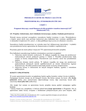 PROGRAM UCZENIE SIE PRZEZ CAŁE śYCIE PRZEWODNIK DLA WNIOSKODAWCÓW 2011 CZĘŚĆ I Fragment dotyczący zasad finansowych dla projektów transferu innowacji LdV1 (tłumaczenie NA) 4.F. Projekty wielostronne, sieci i działania towarzyszące, analizy i badania porównawcze Wnioski muszą zawierać szczegółowy szacunkowy budŜet wyraŜony w euro. Wnioskodawcy z krajów spoza strefy euro powinni zastosować przy kalkulacji kurs wymiany opublikowany w dzienniku Urzędowym UE, seria C, w dniu publikacji Zaproszenia do składania wniosków. Szacunkowy budŜet przedstawiony we wniosku musi być zbilansowany (przychody = wydatki) oraz przedstawiać koszty uprawnione do finansowania ze środków wspólnotowych. Przyznany grant nie moŜe pokryć więcej niŜ 75% uprawnionych kosztów projektu. Przy kalkulacji szacunkowego budŜetu wnioskodawcy powinni uwzględnić: 1. Faktyczne stawki kosztów osobowych. W Ŝadnym wypadku nie mogą one przekroczyć maksymalnych stawek podanych poniŜej w Tabeli 5. Wszelkie przekroczenia będą uznane za koszty nieuprawnione. Prawdziwość tych kosztów moŜe być przedmiotem audytu; 2. Faktyczne dzienne stawki pobytu. W Ŝadnym wypadku nie mogą one przekroczyć maksymalnych dziennych stawek opublikowanych na stronie internetowej Agencji Wykonawczej. Wszelkie przekroczenia będą uznane za koszty nieuprawnione. 3. Faktyczne koszty w doniesieniu do innych kategorii budŜetu, zgodnie z wnioskiem aplikacyjnym. KOSZTY UPRAWNIONE W ocenie uprawnienia kosztów uwzględniany będzie ogólny kontekst, rodzaj i kwota wydatków. Następujące kryteria stosuje się do kategorii kosztu, dla której szacuje się koszt: albo liczbę jednostek (która, przy zastosowaniu odpowiedniego wzoru, daje szacowany koszt) albo szacowany koszt jako taki (całkowity). Aby mogły być uznane za uprawnione koszty projektu muszą spełnić następujące ogólne kryteria: • muszą wiązać się z projektem, w którym udział biorą kraje uprawnione w Programie. Nie są uprawnione Ŝadne koszty związane z działaniami podejmowanymi poza tymi krajami, albo 1 Pełny tekst Przewodnika dla wnioskodawców 2011 w języku angielskim dostępny jest pod adresem: http://www.leonardo.org.pl/index.php/ida/144/. Program „Uczenie się przez całe Ŝycie” – Przewodnik dla wnioskodawców 2011CZĘŚĆ I Fragment dotyczący zasad finansowych dla projektów transferu innowacji LdV- tłumaczenie robocze NA 1 podejmowanymi przez organizacje, które nie są zarejestrowane w kraju uprawnionym, chyba, Ŝe działania takie są niezbędne do realizacji projektu i naleŜycie uzasadnione we wniosku i w sprawozdaniu; • muszą być poniesione przez podmioty posiadające osobowość prawną a w przypadku konsorcjów, przez oficjalnych partnerów konsorcjum2; • muszą wiązać się z projektem (tj. muszą być istotne dla projektu i bezpośrednio wiązać się z realizacją projektu zgodnie z planem pracy); • muszą być niezbędne dla zrealizowania projektu; • muszą być racjonalne i uzasadnione oraz muszą być poniesione zgodnie z zasadami racjonalnego zarządzania finansowego3, w szczególności w sensie adekwatności usług i produktów do ich kosztu i w sensie efektywności wydatków; • muszą być poniesione w trakcie realizacji projektu4 • muszą być faktycznie poniesione przez beneficjenta i członków konsorcjum oraz być udokumentowane w ich księgach rachunkowych zgodnie ze stosownymi zasadami księgowości i zgłoszone zgodnie z wymogami odpowiednich przepisów podatkowych i ubezpieczeń społecznych; • muszą być identyfikowalne i weryfikowalne. Wnioskodawca musi mieć wewnętrzne procedury księgowości i audytu pozwalające na bezpośrednie potwierdzenie zgodności kosztów i wpływów deklarowanych w zakresie projektu z odpowiadającymi im zapisami księgowymi i dokumentami finansowymi do których się odnoszą. Dla dofinansowania obliczanego wg kosztów jednostkowych oznacza to, Ŝe „liczba jednostek” musi być zapisana w odpowiednich dokumentach (tj. kartach pracy ekspertów, listach obecności itd.). Jeśli krajowe przepisy podatkowe i rachunkowo-księgowe nie wymagają przedłoŜenia faktury, wówczas naleŜy przedstawić dokument finansowo-księgowy równorzędnej wartości, tzn. kaŜdy dokument zgodny z odpowiednimi prawnymi przepisami księgowymi stworzony w celu udowodnienia Ŝe zapis w księgach jest prawidłowy. Podatek VAT Podatek VAT jest kosztem uprawnionym tylko wtedy, jeśli wnioskodawca jest w stanie wykazać, Ŝe nie moŜe go odzyskać. 2 Decyzja ustanawiająca Program Uczenia się przez całe Ŝycie definiuje dla projektów z “koordynatorem projektu” i “partnerami w projekcie” projekcie “ugrupowanie wielostronne”, będące ekwiwalentem “konsorcjum”. 3 Koszty będą określone zgodnie z zasada racjonalnego zarządzania finansowego, a konkretnie zgodnie z zasadami ekonomiczności, wydajności i skuteczności. Zasada ekonomiczności wymaga by koszty były określone we właściwym czasie, w odpowiedniej ilości i jakości i w najlepszej cenie. Zasada wydajności dotyczy najlepszej relacji miedzy wykorzystanymi zasobami a osiągniętymi rezultatami. Zasada skuteczności dotyczy osiągnięcia określonych załoŜonych celów i zamierzonych rezultatów. 4 Tzn. wytworzone przez działanie, które realizowane jest w trakcie trwania projektu. Działania prowadzone przed lub po okresie określonym w umowie nie są uprawnione do finansowania. Program „Uczenie się przez całe Ŝycie” – Przewodnik dla wnioskodawców 2011CZĘŚĆ I Fragment dotyczący zasad finansowych dla projektów transferu innowacji LdV- tłumaczenie robocze NA 2 KOSZTY NIEUPRAWNIONE W Ŝadnym wypadku nie mogą być uznane za uprawnione następujące koszty: • dochód z kapitału; • poŜyczka i koszty obsługi poŜyczki; • zabezpieczenia od strat lub potencjalnej przyszłej odpowiedzialności (ubezpieczenie od odpowiedzialności wynikającej z umów czy odpowiedzialności cy