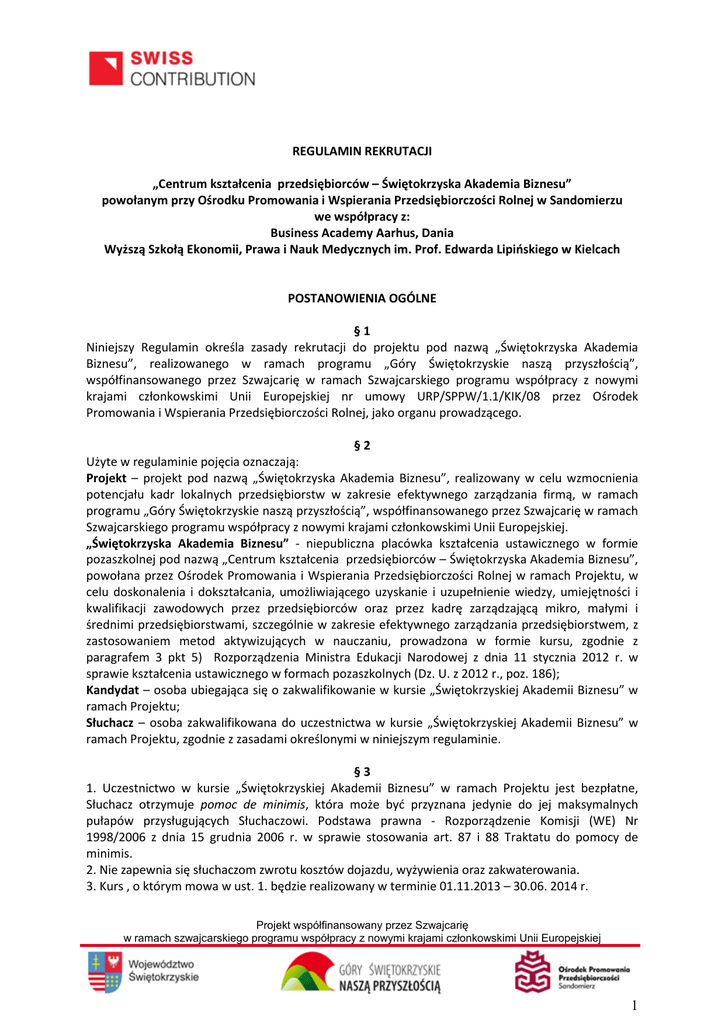 REGULAMIN REKRUTACJI „Centrum kształcenia przedsiębiorców – Świętokrzyska Akademia Biznesu” powołanym przy Ośrodku Promowania i Wspierania Przedsiębiorczości Rolnej w Sandomierzu we współpracy z: Business Academy Aarhus, Dania Wyższą Szkołą Ekonomii, Prawa i Nauk Medycznych im. Prof. Edwarda Lipińskiego w Kielcach POSTANOWIENIA OGÓLNE §1 Niniejszy Regulamin określa zasady rekrutacji do projektu pod nazwą „Świętokrzyska Akademia Biznesu”, realizowanego w ramach programu „Góry Świętokrzyskie naszą przyszłością”, współfinansowanego przez Szwajcarię w ramach Szwajcarskiego programu współpracy z nowymi krajami członkowskimi Unii Europejskiej nr umowy URP/SPPW/1.1/KIK/08 przez Ośrodek Promowania i Wspierania Przedsiębiorczości Rolnej, jako organu prowadzącego. §2 Użyte w regulaminie pojęcia oznaczają: Projekt – projekt pod nazwą „Świętokrzyska Akademia Biznesu”, realizowany w celu wzmocnienia potencjału kadr lokalnych przedsiębiorstw w zakresie efektywnego zarządzania firmą, w ramach programu „Góry Świętokrzyskie naszą przyszłością”, współfinansowanego przez Szwajcarię w ramach Szwajcarskiego programu współpracy z nowymi krajami członkowskimi Unii Europejskiej. „Świętokrzyska Akademia Biznesu” - niepubliczna placówka kształcenia ustawicznego w formie pozaszkolnej pod nazwą „Centrum kształcenia przedsiębiorców – Świętokrzyska Akademia Biznesu”, powołana przez Ośrodek Promowania i Wspierania Przedsiębiorczości Rolnej w ramach Projektu, w celu doskonalenia i dokształcania, umożliwiającego uzyskanie i uzupełnienie wiedzy, umiejętności i kwalifikacji zawodowych przez przedsiębiorców oraz przez kadrę zarządzającą mikro, małymi i średnimi przedsiębiorstwami, szczególnie w zakresie efektywnego zarządzania przedsiębiorstwem, z zastosowaniem metod aktywizujących w nauczaniu, prowadzona w formie kursu, zgodnie z paragrafem 3 pkt 5) Rozporządzenia Ministra Edukacji Narodowej z dnia 11 stycznia 2012 r. w sprawie kształcenia ustawicznego w formach pozaszkolnych (Dz. U. z 2012 r., poz. 186); Kandydat – osoba ubiegająca się o zakwalifikowanie w kursie „Świętokrzyskiej Akademii Biznesu” w ramach Projektu; Słuchacz – osoba zakwalifikowana do uczestnictwa w kursie „Świętokrzyskiej Akademii Biznesu” w ramach Projektu, zgodnie z zasadami określonymi w niniejszym regulaminie. §3 1. Uczestnictwo w kursie „Świętokrzyskiej Akademii Biznesu” w ramach Projektu jest bezpłatne, Słuchacz otrzymuje pomoc de minimis, która może być przyznana jedynie do jej maksymalnych pułapów przysługujących Słuchaczowi. Podstawa prawna - Rozporządzenie Komisji (WE) Nr 1998/2006 z dnia 15 grudnia 2006 r. w sprawie stosowania art. 87 i 88 Traktatu do pomocy de minimis. 2. Nie zapewnia się słuchaczom zwrotu kosztów dojazdu, wyżywienia oraz zakwaterowania. 3. Kurs , o którym mowa w ust. 1. będzie realizowany w terminie 01.11.2013 – 30.06. 2014 r. Projekt współfinansowany przez Szwajcarię w ramach szwajcarskiego programu współpracy z nowymi krajami członkowskimi Unii Europejskiej 1 ZASADY REKRUTACJI 1. 2. 3. 4. 5. 6. 7. 8. 9. 10. §4 Do uczestnictwa w kursie „Świętokrzyskiej Akademii Biznesu” może zostać przyjęty mikro, mały i średni przedsiębiorca w rozumieniu ustawy o swobodzie działalności gospodarczej (Dz. U. z 2013, poz.672, j.t.). W kursie może uczestniczyć sam przedsiębiorca będący osobą fizyczną prowadzącą działalność gospodarczą lub wydelegowana przez mikro, małego lub średniego przedsiębiorcę kadra zarządzająca mikro, małym lub średnim przedsiębiorstwem. Okres prowadzenia działalności gospodarczej lub okres zatrudnienia na stanowisku kierowniczym osób wskazanych w ust. 1 musi być dłuższy niż 6 miesięcy, licząc do dnia ogłoszenia naboru do „Świętokrzyskiej Akademii Biznesu”. Siedziba Kandydata do uczestnictwa w kursie „Świętokrzyskiej Akademii Biznesu” musi być zlokalizowana na terenie realizacji Projektu, to jest w powiatach: sandomierskim, opatowskim, ostrowieckim i kieleckim, z wyłączeniem miast: Kielce i Ostrowiec Św. Rekrutacja Kandydatów do uczestnictwa w kursie „Świętokrzyskiej Akademii Biznesu” rozpoczyna się wraz z ogłoszeniem naboru do uczestnictwa w kursie „Świętokrzyskiej Akademii Biznesu” w ramach Projektu. Zgłoszenia przyjmowane są na podstawie Formularza rekrutacyjnego znajdującego się na stronie internetowej Projektu www.swietokrzyskieswiss.pl. Formularz rekrutacyjny należy przesłać na adres pocztowy: Ośrodek Promowania i Wspierania Przedsiębiorczości Rolnej, pl. Ks. J. Poniatowskiego 2, 27-600 Sandomierz lub dostarczyć osobiście pod wskazany adres w terminie do 28 października 2013 r. Wraz z Formularzem rekrutacyjnym Kandydat zobowiązany jest złożyć następujące dokumenty: 1) wpis do CEIDG lub aktualny wypis z KRS, a w przypadku zgłoszenia kadry zarządzającej ponadto zaświadczenie potwierdzające rodzaj zajmowanego stanowiska kierowniczego zgłaszanej osoby, podpisane przez osobę upoważnioną do reprezentowania firmy, 2) formularz informacji przedstawianych przy ubieganiu się o pomoc de minimis, 3) deklaracja uczestnictwa w kursie „Świętokrzyskiej Akademii Biznesu” w ramach Projektu i jej ukończenia w terminie określonym w niniejszym regulaminie. Kwalifikacja Kandydatów odbędzie się na podstawie przedłożonych dokumentów rekrutacyjnych. Kwalifikacja Kandydatów będzie dokonana z zachowaniem zasady równych szans udziału w Projekcie. Kandydat zakwalifikowany do uczestnictwa w kursie „Świętokrzyskiej Akademii Biznesu” staje się Słuchaczem, z chwilą podpisania umowy uczestnictwa w kursie „Świętokrzyskiej Akademii Biznesu” w ramach Projektu. Umowa uczestnictwa w kursie „Świętokrzyskiej Akademii Biznesu” jest zawierana z osobą fizyczną prowadzącą jednoosobową działalność gospodarczą lub innym podmio