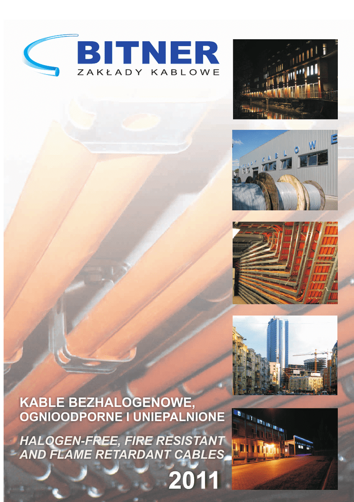 KABLE BEZHALOGENOWE, OGNIOODPORNE I UNIEPALNIONE HALOGEN-FREE, FIRE RESISTANT AND FLAME RETARDANT CABLES 2011 Skontaktuj sie z nami: Contact with us: Zakłady Kablowe BITNER 30-009 Kraków, ul. Friedleina 3/3 adres korespondencyjny: Zakład produkcyjny 32-353 Trzyciąż k/Krakowa tel.: +48 12 389 40 24 fax: +48 12 380 17 00 www.bitner.com.pl e-mail: [email protected] Eksport/Export: + 48 12 389 40 24 w. 199, 198 • kom./mobil tel.no: +48 516 204 002 e-mail: [email protected] Porady techniczne: +48 12 389 40 24 w. 160 Nasi przedstawiciele/ Our representatives: województwo/voivodeship Dolnośląskie Kujawsko-Pomorskie Lubelskie Lubuskie Łódzkie Małopolskie Mazowieckie Opolskie Podkarpackie Podlaskie Pomorskie Śląskie Świętokrzyskie Warmińsko-Mazurskie Wielkopolskie Zachodniopomorskie numer telefonu/telephone number 509 502 502 502 502 502 502 509 502 502 502 509 500 500 502 502 200 436 436 436 436 436 436 200 436 436 436 200 044 044 436 436 777 360 361 360 363 361 363 777 361 363 363 777 924 921 360 360 • 500 044 922 • 500 044 924 • 500 044 923 • • • • • 502 500 500 500 500 436 044 044 044 044 374 922 924 921 921 • 502 436 361 • 500 044 926 • 500 044 923 Szanowni Państwo, Dear Customers, Z przyjemnością oddajemy w Państwa ręce katalog kabli bezhalogenowych oraz kabli do systemów bezpieczeństwa pożarowego. Znajdziecie w nim Państwo rozwiązania problemów, jakie pojawiają się na etapie projektowania i instalacji bezpiecznych systemów zasilania. Tematyką bezpieczeństwa podczas pożaru zajmujemy się od 2002 roku. W przeciągu tych lat opracowaliśmy różne rodzaje konstrukcji kabli (według norm zakładowych oraz norm VDE), poddaliśmy je testom ogniowym, uzyskując odpowiednie certyfikaty i klasyfikacje ognioodporności wyrobów. By zagwarantować Odbiorcy najwyższą jakość i niezawodność naszych wyrobów, w szczególności tych przeznaczonych do instalacji przeciwpożarowych, zespół doświadczonych specjalistów stale pracuje nad doskonaleniem istniejących konstrukcji, materiałów oraz technologii wytwarzania. Procesy opracowywania nowych typów kabli, uruchamiania produkcji, badań w laboratorium zakładowym, kwalifikacji surowców i ich dostawców oraz produkcji seryjnych, prowadzone i kontrolowane są zgodnie z procedurami certyfikowanych systemów jakości ISO 9001:2000 i ISO 14001:2004 Zapraszamy Państwa do korzystania z katalogu. Mamy nadzieję, iż niniejsza publikacja spełni Państwa oczekiwania w zakresie sposobu prezentacji wyrobów oraz dostarczenia przydatnych informacji. It is our pleasure to present you with our catalogue of halogen-free cables and cables for fire safety systems. We hope that you will find it helpful in developing solutions to problems in the design and installation of safe power systems. We have been active in the fire safety sector since 2002. Over the years we have developed a variety of cable structures (complying with corporate and VDE standards), tested their fire resistance, and received confirmation through the appropriate classifications and certificates. In order to provide our customers with top-quality products of the highest level of reliability, in particular those intended for fire systems, our team of experts continuously works to improve our existing structures, materials and production technologies. Our processes, including the development of new types of cables, production start-ups, laboratory research laboratory, classification of raw materials and their suppliers, as well as production, are carried out and controlled using ISO 9001:2000 and ISO 14001:2004 certified quality systems. We invite you to make use of our catalogue, and hope that it you will find all the product listings and other useful information presented in a manner that is convenient and easy to read. Jakość, Innowacja i Ochrona Środowiska Quality, Innovation and Environmental Protection Strategia rozwoju firmy, wymagania odbiorców, rosnąca konkurencja spowodowały, że Zakłady Kablowe BITNER od kilku lat posiadają całkowicie wdrożony System Zarządzania Jakością ISO 9001, ISO 14001 oraz AQAP 2110. System Zarządzania Jakością obejmuje cały zakres działalności firmy od przygotowania produkcji, poprzez produkcję, magazynowanie, logistykę, zarządzanie firmą i gospodarkę odpadami. A few years ago the Cable Factory Bitner - taking into consideration its development strategy, customer requirements and the steady increase in competition - conducted a complete implementation of an ISO 9001, ISO 14001 and AQAP 2110 Quality Management System. The Quality Management System covers the entire scope of the company's operations, from the preparation of production, through manufacturing, warehousing, logistics, right up to corporate governance and waste management. O Firmie About the Company ZAKŁADY KABLOWE BITNER to nowoczesny zakład produkcyjny posiadający: - 17 tysięcy metrów kwadratowych powierzchni produkcyjnej, magazynowej i biurowej; - tereny o powierzchni kilku hektarów; - nowoczesny park maszynowy: linie izolacyjne, linie powłokowe, linie do produkcji kabli gumowych, skręcarki, oplatarki, pełne wyposażenie metalowni do produkcji żył miedzianych i aluminiowych; - doświadczoną 300-osobową załogę; - doskonale wyposażone zakładowe laboratoria; - doświadczony dział technologii i rozwoju; - certyfikaty jakości oraz certyfikaty dla produktów; - w ciągłej produkcji posiadamy kilkanaście grup asortymentowych obejmujących pełny zakres kabli do 3,6/6 kV, o powłokach i izolacji z tworzyw sztucznych oraz gumy. Kilkanaście lat działania Zakładów Kablowych BITNER ugruntowały naszą pozycję jako jednego z największych producentów kabli i przewodów na rynku polskim. Dzisiejsza pozycja firmy jest wynikiem dynamicznego rozwoju osiągniętego dzięki zrealizowanym projektom inwestycyjnym oraz intensywnej pracy całej załogi. Potwierdzeniem jakości i skuteczności funkcjonowania fir
