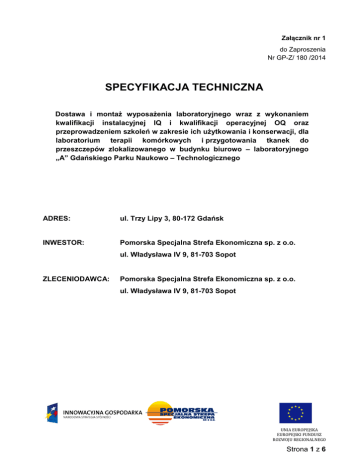Załącznik nr 1 do Zaproszenia Nr GP-Z/ 180 /2014 SPECYFIKACJA TECHNICZNA Dostawa i montaż wyposażenia laboratoryjnego wraz z wykonaniem kwalifikacji instalacyjnej IQ i kwalifikacji operacyjnej OQ oraz przeprowadzeniem szkoleń w zakresie ich użytkowania i konserwacji, dla laboratorium terapii komórkowych i przygotowania tkanek do przeszczepów zlokalizowanego w budynku biurowo – laboratoryjnego „A” Gdańskiego Parku Naukowo – Technologicznego ADRES: ul. Trzy Lipy 3, 80-172 Gdańsk INWESTOR: Pomorska Specjalna Strefa Ekonomiczna sp. z o.o. ul. Władysława IV 9, 81-703 Sopot ZLECENIODAWCA: Pomorska Specjalna Strefa Ekonomiczna sp. z o.o. ul. Władysława IV 9, 81-703 Sopot UNIA EUROPEJSKA EUROPEJSKI FUNDUSZ ROZWOJU REGIONALNEGO Strona 1 z 6 Spis treści Część opisowa : Wyszczególnienie i opis urządzeń laboratoryjnych, wymagania ogólne 1. PAKIET NR 1 ............................................................................................................... 3 1.1 SEPARATORY FRAKCJI KOMÓRKOWYCH .............................................................. 3 2. PAKIET NR 2 ............................................................................................................... 4 2.1 CZYTNIK DO OZNACZANIA ENDOTOKSYN BAKTERYJNYCH ............................... 4 3. PAKIET NR 3 ............................................................................................................... 5 3.1 SCHŁADZACZE LABORATORYJNE POWIETRZNE ................................................. 5 4. WYMAGANIA OGÓLNE (DODATKOWE) DLA URZĄDZEŃ LABORATORYJNYCH . 5 Część rysunkowa: Rysunek nr 1 : Rzut pomieszczeń laboratoryjnych na I p. budynku A z lokalizacją urządzeń Strona 2 z 6 PAKIET NR 1 1.1 SEPARATORY FRAKCJI KOMÓRKOWYCH Przedmiotem zamówienia są dwa separatory frakcji komórkowych. Urządzenia będą umieszczone w pomieszczeniu LK1.11 Wymagania techniczne jednostka wirująca z elastycznej membrany; hydrauliczny system pompowania płynów (płyn hydrauliczny- glikol etylenowy); możliwość dodawania oraz mieszania roztworu płuczącego; zestaw operacyjny składający się z worka operacyjnego o pojemności 630mL, pięciu segmentów, worka na odpadki; prowadzenie procesów składających się z następujących etapów: o wirowanie, o usuwanie supernatantu, o mieszanie/przemywanie; dwa panele sterujące umożliwiające programowanie urządzenia; pięć zaworów zaciskowych; detektor czerwonych krwinek; blokada zatrzasku pokrywy; pokrywa przezroczysta umożliwiająca obserwację procesu; możliwość prowadzenia następujących procesów: o deglikozylacja wcześniej zamrożonych produktów, o obróbka szpiku kostnego, o zbieranie, zagęszczanie i przemywanie komórek z hodowli płynnych, o przemywanie komórek dużą ilością roztworu, o rozdział w gradiencie stężeń wraz z przemywaniem poszczególnych frakcji; szybkość wirowania w zakresie 0-3000 rpm, szybkość usuwania supernatantu w zakresie 0-450 mL/min, minimalny czas mieszania w zakresie 30-100 s, objętość usuwanego supernatantu w zakresie 40-600 mL, regulacja szybkości pompy (450mL/min lub 700mL/min); możliwość przedłużenia czasu pomiędzy momentem detekcji czerwonych krwinek a zatrzymaniem usuwania supernatantu w zakresie 1,5-7 s; Panel sterujący Dwa panele sterujące: Główny panel sterujący (wyświetlacz cyfrowy: czas, numer programu oraz cyklu): o Możliwość samodzielnego wprowadzenia i zapamiętania do 10 programów składających się z min. 7 cyklów lub wybór programu automatycznego; o regulacja szybkości wirowania, usuwania supernatantu, minimalnego czasu mieszania, objętości usuwanego supernatantu, wybór segmentu: Dodatkowy panel sterujący: regulacja szybkości pompy, regulacja czasu pomiędzy detekcją czerwonych krwinek a zatrzymaniem usuwania supernatantu, Możliwość aktualizacji oprogramowania sterującego pracą komory poprzez łącze USB lub RS232, Wbudowane funkcje diagnostyczne (menu serwisowe), Alarm akustyczny. Lista mediów Zasilanie nr 1 Parametr 230V, 50Hz Granice dostawy Gniazdko Strona 3 z 6 PAKIET NR 2 2.1 CZYTNIK DO OZNACZANIA ENDOTOKSYN BAKTERYJNYCH Przedmiotem zamówienia jest przenośny czytnik do oznaczania endotoksyn bakteryjnych testem LAL wraz z drukarką termiczną umożliwiającą wydruk wyników pomiaru. Urządzenie będzie umieszczone w pomieszczeniu LK1.27 Wymagania techniczne Urządzenie przenośne, niewielkich rozmiarów, łatwe w użyciu; Szybki wynik, możliwy do uzyskania w miejscu poboru próbki; Wynik ilościowy uzyskiwany maksymalnie w 25 minut; Wszystkie składniki testu niezbędne do jakościowego i ilościowego oznaczenia endotoksyn, w tym kontrole, dostępne w gotowej jednorazowej kasecie (brak konieczności przygotowywania rozcieńczeń standardów; Kasety pozwalające na oznaczenie endotoksyn w zakresach stężeń: o 0,01-1,0 EU/ml, o 0,05-5,0 EU/ml, o 0,10-10,0 EU/ml W dostawie zestaw początkowy (starting kit) zawierający po dwa opakowania do oznaczania poziomu endotoksyny w zakresie: o 0,01-1,0 EU/ml, o 0,05-5,0 EU/ml, o 0,10-10,0 EU/ml Możliwość zastosowania urządzenia do identyfikacji bakterii Gram+, Gram-, drożdży i pleśni w czasie 3-8 minut. Maksymalna objętość próbki użytej w jednym oznaczeniu: 150 µl; Urządzenie zasilane baterią z możliwością ładowania, min. czas pracy po naładowaniu baterii: 4 godz. Urządzenie pracuje w temperaturze 15-27oC płytki do kwalifikacji zestawu zgodne ze standardem farmaceutycznym (oznaczenie F) o czułości co najmniej 0.05 jednostek endotoksyny (20 sztuk) Sterowanie i zbieranie danych Panel sterujący w postaci klawiatury z wyświetlaczem cyfrowym; Możliwość odczytania pomiaru wprost z wyświetlacza; Przechowywanie wyników z min 50 pomiarów; Możliwość tworzenia raportów; Interfejs umożliwiający podłączenie drukarki lub komputera; Możliwość wydruku ostatniego wyniku, wyniku z wybranej daty lub wszystkich wyników; Na wydruku powinny znaleźć się prz