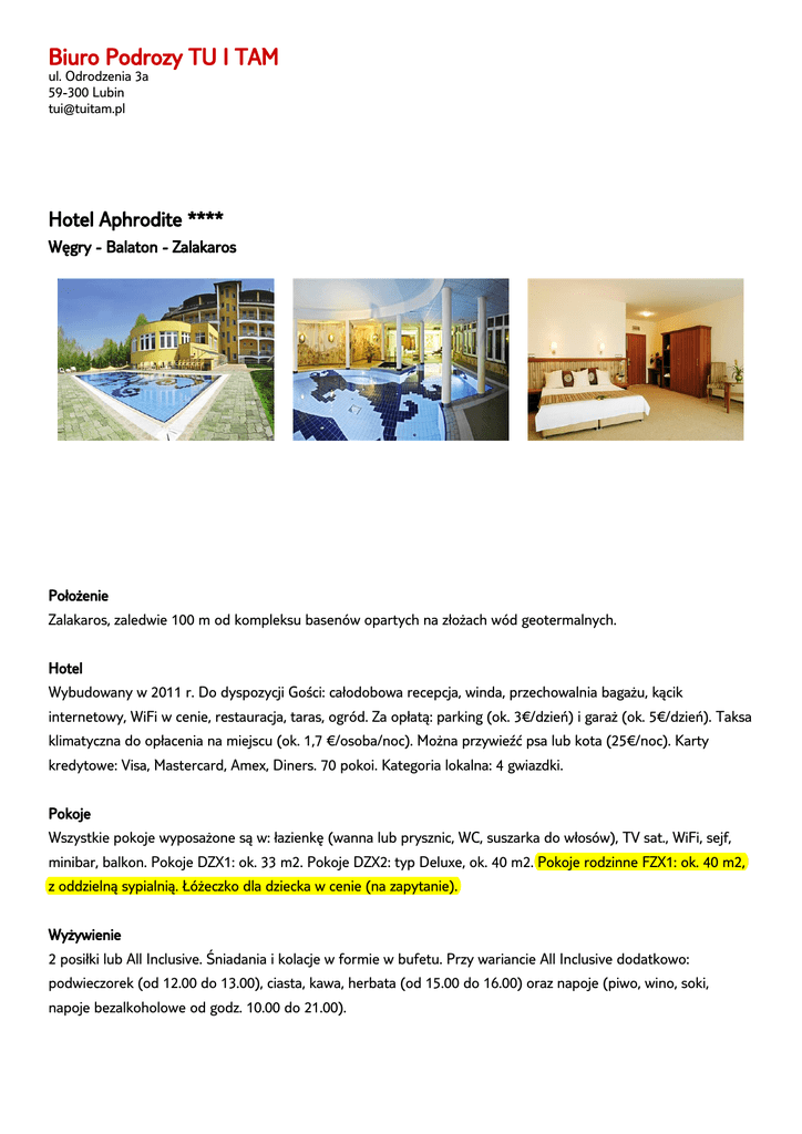 2 lipca 2014 Biuro Podrozy TU I TAM ul. Odrodzenia 3a 59-300 Lubin [email protected] Hotel Aphrodite **** Węgry - Balaton - Zalakaros Termin: 2014-07-14 - 2014-07-21 Pokój rodzinny (FZX1), All inclusive Państwa konsultant: Krzysztof Raczkowiak e-mail: [email protected] suma: 4 848,00 PLN MOCNE STRONY HOTELU Położenie Zalakaros, zaledwie 100 m od kompleksu basenów opartych na złożach wód geotermalnych. Hotel Wybudowany w 2011 r. Do dyspozycji Gości: całodobowa recepcja, winda, przechowalnia bagażu, kącik internetowy, WiFi w cenie, restauracja, taras, ogród. Za opłatą: parking (ok. 3€/dzień) i garaż (ok. 5€/dzień). Taksa klimatyczna do opłacenia na miejscu (ok. 1,7 €/osoba/noc). Można przywieźć psa lub kota (25€/noc). Karty kredytowe: Visa, Mastercard, Amex, Diners. 70 pokoi. Kategoria lokalna: 4 gwiazdki. Pokoje Wszystkie pokoje wyposażone są w: łazienkę (wanna lub prysznic, WC, suszarka do włosów), TV sat., WiFi, sejf, minibar, balkon. Pokoje DZX1: ok. 33 m2. Pokoje DZX2: typ Deluxe, ok. 40 m2. Pokoje rodzinne FZX1: ok. 40 m2, z oddzielną sypialnią. Łóżeczko dla dziecka w cenie (na zapytanie). Wyżywienie 2 posiłki lub All Inclusive. Śniadania i kolacje w formie w bufetu. Przy wariancie All Inclusive dodatkowo: podwieczorek (od 12.00 do 13.00), ciasta, kawa, herbata (od 15.00 do 16.00) oraz napoje (piwo, wino, soki, napoje bezalkoholowe od godz. 10.00 do 21.00). Dla dzieci Plac zabaw, pokoik zabaw, wysokie krzesełko do posiłków, podgrzewacz na butelki. Sport i Wellness W cenie: siłownia, kompleks saun (fińska, parowa, na podczerwień), jacuzzi. Za opłatą: wypożyczalnia rowerów, masaże, zabiegi kosmetyczne.