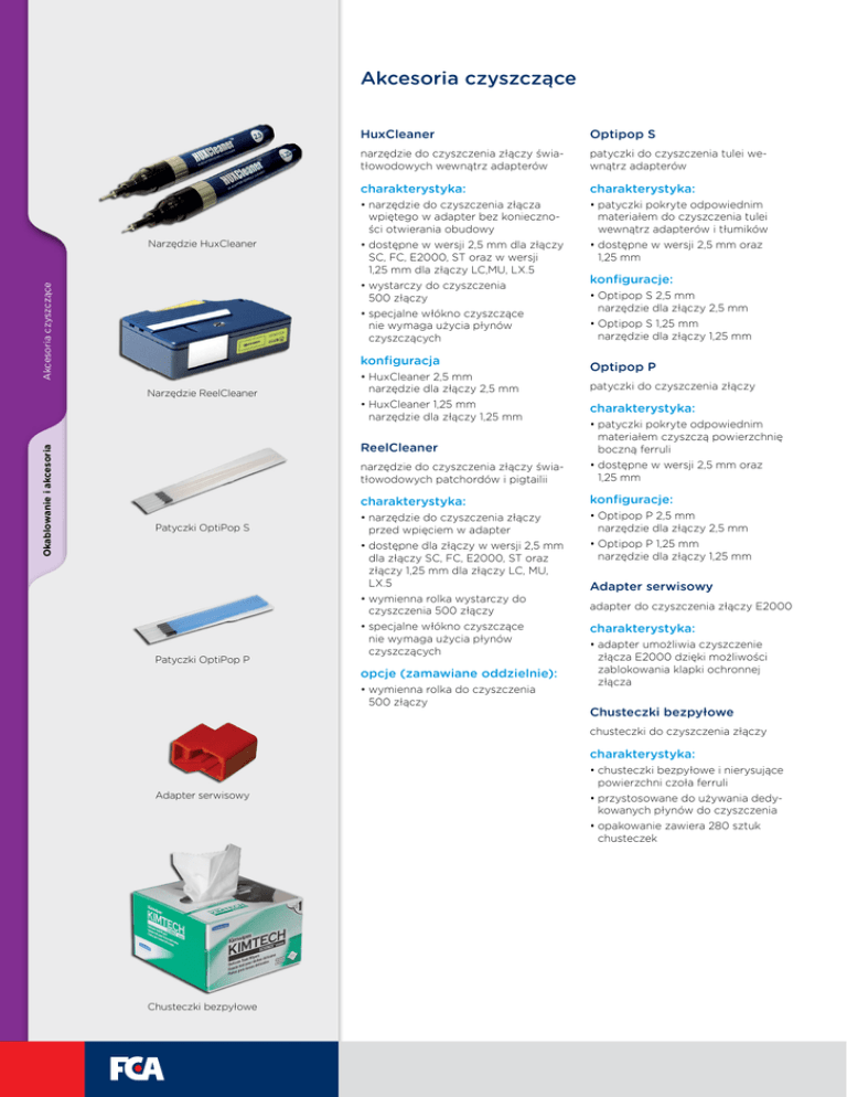 Akcesoria czyszczące Akcesoria czyszczące Narzędzie HuxCleaner Optipop S narzędzie do czyszczenia złączy światłowodowych wewnątrz adapterów patyczki do czyszczenia tulei wewnątrz adapterów charakterystyka: charakterystyka: •narzędzie do czyszczenia złącza wpiętego w adapter bez konieczności otwierania obudowy •dostępne w wersji 2,5 mm dla złączy SC, FC, E2000, ST oraz w wersji 1,25 mm dla złączy LC,MU, LX.5 •wystarczy do czyszczenia 500 złączy •specjalne włókno czyszczące nie wymaga użycia płynów czyszczących •patyczki pokryte odpowiednim materiałem do czyszczenia tulei wewnątrz adapterów i tłumików •dostępne w wersji 2,5 mm oraz 1,25 mm konfiguracja Narzędzie ReelCleaner Okablowanie i akcesoria OptiNode HuxCleaner Patyczki OptiPop S Patyczki OptiPop P •HuxCleaner 2,5 mm narzędzie dla złączy 2,5 mm •HuxCleaner 1,25 mm narzędzie dla złączy 1,25 mm konfiguracje: •Optipop S 2,5 mm narzędzie dla złączy 2,5 mm •Optipop S 1,25 mm narzędzie dla złączy 1,25 mm Optipop P patyczki do czyszczenia złączy charakterystyka: ReelCleaner •patyczki pokryte odpowiednim materiałem czyszczą powierzchnię boczną ferruli narzędzie do czyszczenia złączy światłowodowych patchordów i pigtailii •dostępne w wersji 2,5 mm oraz 1,25 mm charakterystyka: konfiguracje: •narzędzie do czyszczenia złączy przed wpięciem w adapter •dostępne dla złączy w wersji 2,5 mm dla złączy SC, FC, E2000, ST oraz złączy 1,25 mm dla złączy LC, MU, LX.5 •wymienna rolka wystarczy do czyszczenia 500 złączy •specjalne włókno czyszczące nie wymaga użycia płynów czyszczących Adapter serwisowy opcje (zamawiane oddzielnie): •wymienna rolka do czyszczenia 500 złączy •Optipop P 2,5 mm narzędzie dla złączy 2,5 mm •Optipop P 1,25 mm narzędzie dla złączy 1,25 mm adapter do czyszczenia złączy E2000 charakterystyka: •adapter umożliwia czyszczenie złącza E2000 dzięki możliwości zablokowania klapki ochronnej złącza Chusteczki bezpyłowe chusteczki do czyszczenia złączy charakterystyka: Adapter serwisowy Chusteczki bezpyłowe •chusteczki bezpyłowe i nierysujące powierzchni czoła ferruli •przystosowane do używania dedykowanych płynów do czyszczenia •opakowanie zawiera 280 sztuk chusteczek