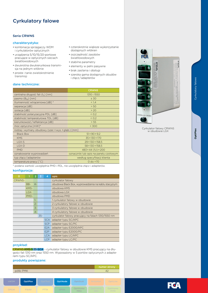 Cyrkulatory falowe Seria CRWNS charakterystyka: Cyrkulatory falowe •czterokrotnie większe wykorzystanie dostępnych włókien •oszczędność zasobów światłowodowych •stabilne parametry •elementy w pełni pasywne •brak zasilania i obsługi •szeroka gama dostępnych obudów i złącz / adapterów dane techniczne: CRWNS centralna długość fali (λc) [nm] 1310 i 1550 ± 30 tłumienność wtrąceniowa [dB] * < 1,4 separacja [dB] > 50 izolacja [dB] > 20 stabilność polaryzacyjna PDL [dB] < 0,2 stabilność temperaturowa TDL [dB] < 0,2 kierunkowość / reflektancja [dB] OptiNode pasmo (BW) [nm] > 55 moc optyczna [mW]* < 300 Cyrkulator falowy CRWNS w obudowie LGX rodzaj i wymiary obudowy (szer. × wys. × głęb.) [mm] Black Box 51 × 90 × 9,2 KMS 35 × 130 × 170 LGX-S 29 × 130 × 158,5 LGX-D 58 × 130 × 158,5 PMD 483 × 44 (1U) × 200 oznakowanie wyprowadzeń oznaczniki lub opis na panelu czołowym typ złącz / adapterów według specyfikacji klienta temperatura pracy [˚C] 0 do +70 * podana wartość uwzględnia PMD i PDL, nie uwzględnia złącz i adapterów. konfiguracje: 0 1 2 3 4 CRWNS- opis cyrkulator falowy BB- K- obudowa Black Box, wyprowadzenia na kablu stacyjnym KMS- obudowa KMS LGX- obudowa LGX PMD- obudowa PMD 1- 1 cyrkulator falowy w obudowie 2- 2 cyrkulatory falowe w obudowie 3- 3 cyrkulatory falowe w obudowie 4- 4 cyrkulatory falowe w obudowie 35- cyrkulator falowy pracujący na falach 1310/1550 nm SCA adapter typu SC/APC SCP adapter typu SC/PC E2A adapter typu E2000/APC E2P adapter typu E2000/PC LCA adapter typu LC/APC LCP adapter typu LC/PC przykład: CRWNS-KMS-1-35-SCA – cyrkulator falowy w obudowie KMS pracujący na długości fali 1310 nm oraz 1550 nm. Wyposażony w 5 portów optycznych z adapterami typu SC/APC. produkty powiązane: numer strony półki PMK 42 xWDM OptiPlex OptiTest OptiNode OptiDukt MikroKan OptiLine OPGW FibAir FTTA GPON OptiHome MDU OptiHome SDU OptiHome FITH OptiPlex •kombinacja sprzęgaczy WDM i cyrkulatorów optycznych •urządzenia 5/10/15/20-portowe pracujące w optycznych sieciach światłowodowych •dwukrotna dwukierunkowa transmisja na jednym włóknie •proste i tanie zwielokrotnienie transmisji