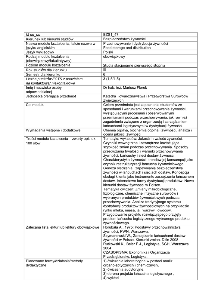 M uu_uu Kierunek lub kierunki studiów Nazwa modułu kształcenia, także nazwa w języku angielskim Język wykładowy Rodzaj modułu kształcenia (obowiązkowy/fakultatywny) Poziom modułu kształcenia Rok studiów dla kierunku Semestr dla kierunku Liczba punktów ECTS z podziałem na kontaktowe/ niekontaktowe Imię i nazwisko osoby odpowiedzialnej Jednostka oferująca przedmiot Cel modułu Wymagania wstępne i dodatkowe Treści modułu kształcenia – zwarty opis ok. 100 słów. Zalecana lista lektur lub lektury obowiązkowe Planowane formy/działania/metody dydaktyczne BZS1_47 Bezpieczeństwo żywności Przechowywanie i dystrybucja żywności Food storage and distribution Polski obowiązkowy Studia stacjonarne pierwszego stopnia III 6 3 (1,5/1,5) Dr hab. inż. Mariusz Florek Katedra Towaroznawstwa i Przetwórstwa Surowców Zwierzęcych Celem przedmiotu jest zapoznanie studentów ze sposobami i warunkami przechowywania żywności, występującymi procesami i obserwowanymi przemianami podczas przechowywania, jak również zagadnienia związane z organizacją i zarządzaniem łańcuchami logistycznymi w dystrybucji żywności. Chemia ogólna, biochemia ogólna i żywności, analiza i ocena jakości żywności Tematyka wykładów: Jakość i trwałość żywności. Czynniki wewnętrzne i zewnętrzne kształtujące szybkość zmian podczas przechowywania. Sposoby przedłużania trwałości i warunki przechowywania żywności. Łańcuchy i sieci dostaw żywności. Charakterystyka żywności i trendów jej konsumpcji jako czynnik restrukturyzacji łańcucha żywnościowego. Geneza śledzenia i zapewniania bezpieczeństwa żywności w łańcuchach i sieciach dostaw. Koncepcja obsługi klienta jako instrumentu zarządzania łańcuchem dostaw. Internetowe formy dystrybucji produktów. Nowe kierunki dostaw żywności w Polsce. Tematyka ćwiczeń: Zmiany mikrobiologiczne, fizjologiczne, chemiczne i fizyczne surowców i wybranych produktów żywnościowych podczas przechowywania. Analiza tradycyjnego systemu dystrybucji produktów żywnościowych na przykładzie rynku mleka, mięsa, jaj, warzyw i owoców. Przygotowanie projektu rozwiązującego przyjęty problem łańcucha logistycznego wybranego produktu żywnościowego. Horubała A., 1975: Podstawy przechowalnictwa żywności, PWN, Warszawa; Szymanowski W., Zarządzanie łańcuchami dostaw żywności w Polsce. Kierunki zmian. Difin 2008 Rutkowski K., Beier F.J., Logistyka, SGH, Warszawa 2004 CZASOPISMA: Ekonomika i Organizacja Przedsiębiorstw, Logistyka. 1) ćwiczenia laboratoryjne w postaci analiz organoleptycznych i chemicznych, 2) ćwiczenia audytoryjne, 3) obrona projektu łańcucha logistycznego , 4) wykład