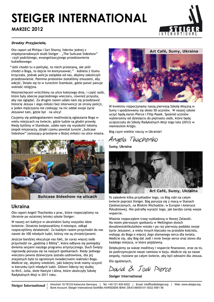 STEIGER INTERNATIONAL Marzec 2012 Drodzy Przyjaciele, Oto raport od Philipa i Sari Shorey, liderów jednej z międzynarodowych służb Steiger – „The Suitcase Sideshow” – czyli podróżnego, ewangelizacyjnego przedstawienia kukiełkowego: Art Café, Sumy, Ukraina “Jeśli chodzi tu o politykę, to niech przestaną, ale jeśli chodzi o Boga, to dajcie im kontynuować.” – kobieta z tłumu krzyczała, jednak policja zażądała od nas, abyśmy zakończyli przedstawienie. Pomimo protestów zostaliśmy zmuszeni, aby odejść. Działo się to w tureckim Stambule, gdzie ponoć panuje wolność religijna. Niezniechęceni wróciliśmy na ulice kolejnego dnia, i część osób, które były obecne poprzedniego wieczoru, również przyszła, aby nas oglądać. Za drugim razem udało nam się przedstawić historię Jezusa i Jego miłości bez interwencji ze strony policji, a jeden mężczyzna nie czekając na nic oddał swoje życie Jezusowi tam, gdzie był – na ulicy! Czujemy się pobłogosławieni możliwością ogłaszania Boga w wielu miejscach na świecie, gdzie ludzie są głodni prawdy. Kiedy byliśmy w Stambule, udało nam się wyszkolić lokalny zespół misjonarzy, dzięki czemu powstał turecki „Suitcase Sideshow” zanoszący przesłanie o Bożej miłości na ulice miasta. W kwietniu rozpoczynamy naszą pierwszą Szkołę Misyjną w Sumy i spodziewamy się około 50 uczniów. W naszej szkole uczyć będą Aaron Pierce i Filip Pasek. Spośród uczniów wybierzemy od dziesięciu do piętnastu osób, które będą uczęszczały do Szkoły Radykalnych Misji tego lata (2012) w niemieckim Krögis. Bóg czyni wielkie rzeczy w Ukrainie! Angela Tkachenko Sumy, Ukraina Art Café, Sumy, Ukraina Suitcase Sideshow na ulicach Ukraina Oto raport Angeli Tkachenko z prac, które rozpoczęlismy na Ukrainie po ostatniej letniej szkole Steiger: W naszej art kafejce w ukraińskim Sumy wszystko idzie świetnie. Ostatnio świętowaliśmy 4 miesiące, odkąd rozpoczęliśmy działalność. Za każdym razem przychodzi do nas nawet do 100 młodych ludzi, którzy nie są chrześcijanami. Jeszcze bardziej ekscytuje nas fakt, że coraz więcej osób przychodzi na „godzinę z Biblią”, która odbywa się pomiędzy dwiema sesjami naszego programu artystycznego. Duch Święty naprawdę porusza się na naszych spotkaniach. Kiedy jednego wieczoru pewna dziewczyna została uzdrowiona, dla jej znajomych było to ogromnym świadectwem realności Boga. Módlcie się, abyśmy wiedzieli, jaki kolejny krok mamy uczynić w kierunku tych młodych ludzi. Główni liderzy tej służby to Kiril, Julia, dwie Nastyie i Alina, które ukończyły Szkołę Radykalnych Misji w 2011 roku. Steiger International To zaledwie kilka przykładów tego, co Bóg robi na całym świecie poprzez Steiger. Bóg porusza się z mocą w Stanach Zjednoczonych, na Bliskim Wschodzie, w Europie i Ameryce Południowej. Nie potrafię wyrazić tego, jak bardzo cenię wasze wsparcie. Właśnie rozpocząłem trasę wykładową w Nowej Zelandii. Na moim pierwszym spotkaniu w Wellington dwóch dwudziestokilkulatków wstało i po raz pierwszy poddało swoje życie Jezusowi, a wielu innych klęczało na przedzie kościoła, wołając do Boga o więcej Jego złamanego serca dla świata. Módlcie się, aby Bóg dał Jodi i mnie Swoje serce oraz słowo dla każdego miejsca, w które pójdziemy. Dziękujemy za wasze modlitwy i wsparcie finansowe, oraz za to, że podtrzymujecie nasze ramiona w boju. Módlcie się za nasze zespoły, rozsiane po całym świecie, aby byli odważni dla Jezusa. Dla zgubionych, David & Jodi Pierce Steiger International | Hirschstr 19 76133 Karlsruhe Germany | Tel: +49 721 830 6202 | Email: [email protected] | Web: www.steiger.org | Bank Account: Steiger International Swift/Bic KARSDE66 IBAN: DE43 66050101 0022 4561 56 Prośby Modlitewne 1.Książka Davida Pierce “Rockowy Kapłan” jest obecnie tłumaczona na język rosyjki i za miesiąc będzie gotowa do druku. Potrzebujemy tylko US$2, 000, aby wydrukować 1000 książek. Proszę, rozważ czy mógłbyś pomóc w realizacji tego projektu. Ta książka ma być częścią programu szkoleniowego oraz posyłania rosyjskich mówców-misjonarzy na cały obszar byłego ZSRR i inne części świata rosyjskojęzycznego. Potrzebna Ciężarówka – Steiger Brazylia Steiger Brazylia pilnie potrzebuje ciężarówki do wsparcia służb w São Paulo, takich jak Alegorica (Południowoamerykański zespół No Longer Music) i Kościół Steiger (Projeto 242). Pojazd ma służyć lokalnej wspólnocie oraz pomagać w docieraniu do bezdomnych i uzależnionych od narkotyków oraz prostytucji. Jeden ofiarodawca wpłacił wstępny ‘matching fund’ w wysokości USD 10,000. Potrzebują zebrać dwa razy tyle, aby każdy dolar dopłacony do tej kwoty był pomnożony przez ten fundusz. Datki można wpłacać do 30 marca (patrz: szczegóły dokonywania wpłat na dole strony). Aby uzyskać więcej informacji, skontaktuj się z brasil@steiger. org . 2.Módlcie się za Sandro Baggio, lidera Stegier w Brazylii i pastora kościoła „Projeto 242.” Módlcie się o Bożą ochronę nad nim i jego rodziną, podczas gdy wykonują pracę w samym sercu São Paulo, ogromnego miasta pełnego wielkich potrzeb i nie mniejszych wyzwań. 3.Módlcie się za Jodi Pierce oraz Luke Greenwood, którzy przygotowują się do Szkoły Radykalnych Misji w Krögis. Módlcie się o potencjalnych młodych liderów z całego świata, którzy będą uczęszczać do Szkoły. 4.Módlcie się za Davida (Spock) Mettler, który jest pastorem kościoła Steiger w niemieckim Karlsruhe. Módlcie się, by mógł odważnie prowadzić ten kościół, i aby był pełen Ducha Świętego. Módlcie się za Johannes Vorherr, który dźwiga dużą odpowiedzialność przywódczą nad programem uczniowskim w Karsruhe oraz za oceanem. 5.Módlcie się za Bena Pierce, który przygotowuje się do trasy No Longer Music na Bliskim Wschodzie i w Europi