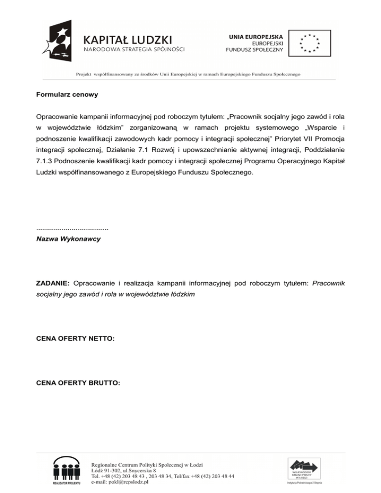 Formularz cenowy Opracowanie kampanii informacyjnej pod roboczym tytułem: „Pracownik socjalny jego zawód i rola w województwie łódzkim” zorganizowaną w ramach projektu systemowego „Wsparcie i podnoszenie kwalifikacji zawodowych kadr pomocy i integracji społecznej” Priorytet VII Promocja integracji społecznej, Działanie 7.1 Rozwój i upowszechnianie aktywnej integracji, Poddziałanie 7.1.3 Podnoszenie kwalifikacji kadr pomocy i integracji społecznej Programu Operacyjnego Kapitał Ludzki współfinansowanego z Europejskiego Funduszu Społecznego. ..................................... Nazwa Wykonawcy ZADANIE: Opracowanie i realizacja kampanii informacyjnej pod roboczym tytułem: Pracownik socjalny jego zawód i rola w województwie łódzkim CENA OFERTY NETTO: CENA OFERTY BRUTTO: