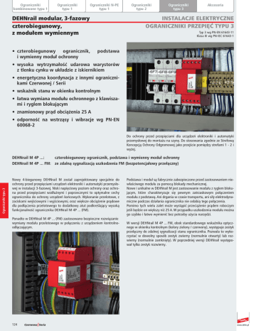 Ograniczniki kombinowane typu 1 Ograniczniki typu 1 Ograniczniki N-PE typu 1 DEHNrail modular, 3-fazowy czterobiegunowy, z modułem wymiennym • czterobiegunowy ogranicznik, i wymienny moduł ochronny Ograniczniki typu 2 Ograniczniki typu 3 Akcesoria iNstalacjE ElEktryczNE OgraNiczNiki przEpięć typu 3 Typ 3 wg PN-EN 61643-11 Klasa III wg PN-IEC 61643-1 podstawa • wysoka wytrzymałość udarowa warystorów z tlenku cynku w układzie z iskiernikiem • energetyczna koordynacja z innymi ogranicznikami Czerwonej / Serii • wskaźnik stanu w okienku kontrolnym • łatwa wymiana modułu ochronnego z klawiszami i ryglem blokującym • znamionowy prąd obciążenia 25 A • odporność na wstrząsy i wibracje wg PN-EN 60068-2 Do ochrony przed przepięciami dla urządzeń elektroniki i automatyki przemysłowej do montażu na szynę. Do stosowania zgodnie ze Strefową Koncepcją Ochrony Odgromowej jako przejście pomiędzy strefami 1 - 2 i wyżej. Ograniczniki typu 3 DEHNrail M 4P ...: czterobiegunowy ogranicznik, podstawa i wymienny moduł ochronny DEHNrail M 4P ... FM: ze zdalną sygnalizacją uszkodzenia FM (bezpotencjałowy przełączny) Nowy 4-biegunowy DEHNrail M został zaprojektowany specjalnie do ochrony przed przepięciami urządzeń elektroniki i automatyki przemysłowej w instalacji 3-fazowej. Niski napięciowy poziom ochrony oraz ochrona przed przepięciami wzdłużnymi i poprzecznymi to optymalne cechy ogranicznika do ochrony urządzeń końcowych. Wykonanie przelotowe, z zaciskami wejściowymi i wyjściowymi, oraz większe obciążenie prądowe dla podłączenia przelotowego to dodatkowy atut podkreślający wysoką funkcjonalność ogranicznika DEHNrail M 4P ... (FM). Ponadto w DEHNrail M 4P ... (FM) zastosowano bezpieczne rozwiązanie wymiany modułu przelotowego w połączeniu z urządzeniem kontrolnoodłączającym. 124 Podstawa i moduł są fabrycznie zabezpieczone przed zastosowaniem niewłaściwego modułu za pomocą blokady mechanicznej. Nowe i unikalne w DEHNrail M jest zastosowanie modułu z ryglem blokującym, które charakteryzuje się pewnym zatrzaskowym połączeniem modułu z podstawą. Ani drgania w czasie transportu, ani siły elektrodynamiczne podczas działania ogranicznika nie osłabią tego połączenia. Pomimo tych wielu zalet może wystąpić przeciążenie prądem roboczym jeśli będzie on większy niż 25 A. W przypadku uszkodzenia modułu można go szybko i łatwo wymienić bez potrzeby użycia narzędzi. W wersji DEHNrail M 4P ... FM, obok standardowego wskaźnika optycznego w okienku kontrolnym (kolory zielony / czerwony), występuje zestyk przełączny do zdalnej sygnalizacji stanu ogranicznika. Pozwala to wykorzystać w dowolny sposób zestyk zwierny (normalnie otwarty) lub rozwierny (normalnie zamknięty). W poprzedniej wersji DEHNrail występował tylko zestyk rozwierny. www.dehn.pl Ograniczniki kombinowane typu 1 Ograniczniki typu 1 Ograniczniki N-PE typu 1 Ograniczniki typu 2 Ograniczniki typu 3 Akcesoria DEHNrail modular, 3-fazowy DEHNrail M 4p ... (FM) iNstalacjE ElEktryczNE OgraNiczNiki przEpięć typu 3 L1 L1 L2 L2 PE PE N N L3 L3 12 11 14 Rysunek wymiarowy DR M 4P ... FM Schemat połączeń DR M 4P ... FM Ogranicznik przepięć wg PN-EN 61643-11 Ogranicznik przepięć wg PN-IEC 61643-1 Napięcie znamionowe AC UN Największe napięcie trwałej pracy AC UC Znamionowy prąd obciążenia AC IL Znamionowy prąd wyładowczy (8/20) In Całkowity prąd wyładowczy (8/20) [L1+L2+L3+N-PE] Itotal Udar kombinowany UOC Udar kombinowany [L1+L2+L3+N-PE] UOC total Napięciowy poziom ochrony [L-N] UP Napięciowy poziom ochrony [L/N-PE] UP Czas zadziałania [L-N] tA Czas zadziałania [L/N-PE] tA Maksymalny bezpiecznik w obwodzie / dodatkowy Wytrzymałość zwarciowa przy bezpieczniku 25 A gL/gG Przepięcie dorywcze [L-N] UT Przepięcie dorywcze [L/N-PE] UT Przepięcie dorywcze [N-PE] UT Zakres temperatur pracy TU Wskaźnik działania / uszkodzenia Przekroje przewodów min. Przekroje przewodów maks. Montaż Materiał obudowy Stopień ochrony Wymiary Certyfikaty dodatkowe Sygnalizacja uszkodzenia FM / Typ zestyku Parametry obwodu sygnalizacji AC Parametry obwodu sygnalizacji DC Przekroje przewodów FM Dane potrzebne do zamówienia Typ Numer katalogowy Opakowanie jednostkowe DR M 4P 255 DR M 4P 255 FM Typ 3 Klasa III 230/400 V 255/440 V Typ 3 Klasa III 230/400 V 255/440 V 25 A 3 kA 8 kA 6 kV 16 kV ≤ 1000 V ≤ 1500 V ≤ 25 ns ≤ 100 ns 25 A gL/gG lub B 25 A 6 kAeff 335 V / 5 sekund 400 V / 5 sekund 1200 V / 200 ms -40°C...+80°C zielony / czerwony 0,5 mm2 drut / linka 4 mm2 drut /2,5 mm2 linka na szynie 35 mm wg EN 60715 Thermoplast, kolor czerwony, UL 94 V-0 IP 20 2 TE, DIN 43880 KEMA — — — — 25 A 3 kA 8 kA 6 kV 16 kV ≤ 1000 V ≤ 1500 V ≤ 25 ns ≤ 100 ns 25 A gL/gG lub B 25 A 6 kAeff 335 V / 5 sekund 400 V / 5 sekund 1200 V / 200 ms -40°C...+80°C zielony / czerwony 0,5 mm2 drut / linka 4 mm2 drut /2,5 mm2 linka na szynie 35 mm wg EN 60715 Thermoplast, kolor czerwony, UL 94 V-0 IP 20 2 TE, DIN 43880 KEMA przełączny 250 V/0,5 A 250 V/0,1 A; 125 V/0,2 A; 75 V/0,5 A maks. 1,5 mm2 drut / linka DR M 4P 255 953 400 1 szt. DR M 4P 255 FM 953 405 1 szt. Ograniczniki typu 3 DR M 4P ... (FM): czterobiegunowy ogranicznik, podstawa i wymienny moduł ochronny; opcjonalnie ze zdalną sygnalizacją uszkodzenia FM (bezpotencjałowe zestyki przełączne) Akcesoria do DEHNrail modular, 3-faz. Moduł ochronny do DEHNrail M 4P 953 020 4P 255 DR MOD DR MOD 4P ...: 4-biegunowy moduł ochronny przelotowy DR MOD 4P 255 DEHNrail, 4-polig, 255 V ÜS-Modul 953 020 Typ DR MOD 4P 255 www.dehn.pl Opak. jedn. Numer szt. katalogowy 1 953 020 125