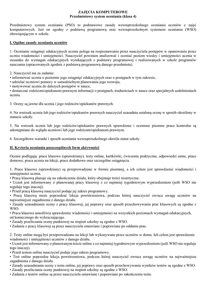 ZAJĘCIA KOMPUTEROWE Przedmiotowy system oceniania (klasa 4) Przedmiotowy system oceniania (PSO) to podstawowe zasady wewnątrzszkolnego oceniania uczniów z zajęć komputerowych. Jest on zgodny z podstawą programową oraz wewnątrzszkolnym systemem oceniania (WSO) obowiązującym w szkole. I. Ogólne zasady oceniania uczniów 1. Ocenianie osiągnięć edukacyjnych ucznia polega na rozpoznawaniu przez nauczyciela postępów w opanowaniu przez ucznia wiadomości i umiejętności. Nauczyciel powinien analizować i oceniać poziom wiedzy i umiejętności ucznia w stosunku do wymagań edukacyjnych wynikających z podstawy programowej i realizowanych w szkole programów nauczania (opracowanych zgodnie z podstawą programową danego przedmiotu). 2. Nauczyciel ma za zadanie: • informować ucznia o poziomie jego osiągnięć edukacyjnych oraz o postępach w tym zakresie, • udzielać uczniowi pomocy w samodzielnym planowaniu jego rozwoju, • motywować ucznia do dalszych postępów w nauce, • dostarczać rodzicom/opiekunom prawnym informacji o postępach, trudnościach w nauce oraz specjalnych uzdolnieniach ucznia. 3. Oceny są jawne dla ucznia i jego rodziców/opiekunów prawnych. 4. Na wniosek ucznia lub jego rodziców/opiekunów prawnych nauczyciel uzasadnia ustaloną ocenę w sposób określony w statucie szkoły. 5. Na wniosek ucznia lub jego rodziców/opiekunów prawnych sprawdzone i ocenione pisemne prace kontrolne są udostępniane do wglądu uczniowi lub jego rodzicom/opiekunom prawnym. 6. Szczegółowe warunki i sposób oceniania wewnątrzszkolnego określa statut szkoły. II. Kryteria oceniania poszczególnych form aktywności Ocenie podlegają: prace klasowe (sprawdziany), testy online, kartkówki, ćwiczenia praktyczne, odpowiedzi ustne, prace domowe, praca ucznia na lekcji, prace dodatkowe oraz szczególne osiągnięcia. 1. Prace klasowe (sprawdziany) są przeprowadzane w formie pisemnej, a ich celem jest sprawdzenie wiadomości i umiejętności ucznia. • Pracę klasową planuje się na zakończenie działu, który obejmuje treści teoretyczne. • Uczeń jest informowany o planowanej pracy klasowej z co najmniej tygodniowym wyprzedzeniem (jeśli WSO nie reguluje tego inaczej). • Przed pracą klasową nauczyciel podaje jej zakres programowy. • Pracę klasową może poprzedzać lekcja powtórzeniowa, podczas której nauczyciel zwraca uwagę uczniów na najważniejsze zagadnienia z danego działu. • Zasady uzasadniania oceny z pracy klasowej, jej poprawy oraz sposób przechowywania prac klasowych są zgodne z WSO. • Praca klasowa umożliwia sprawdzenie wiadomości i umiejętności na wszystkich poziomach wymagań edukacyjnych, od koniecznego do wykraczającego. • Zasady przeliczania oceny punktowej na stopień szkolny są zgodne z WSO. • Zadania z pracy klasowej są przez nauczyciela omawiane i poprawiane po oddaniu prac. 2. Testy online mogą być przeprowadzane na lekcji lub wykonywane przez uczniów w domu. Ich celem jest sprawdzenie wiadomości i umiejętności uczniów z danego działu. • Uczeń jest informowany o planowanym teście online z co najmniej tygodniowym wyprzedzeniem (jeśli WSO nie reguluje tego inaczej). • Przed testem online nauczyciel podaje jego zakres programowy. • Test online poprzedza lekcja powtórzeniowa, podczas której nauczyciel zwraca uwagę uczniów na najważniejsze zagadnienia z danego działu. • Zasady uzasadniania oceny z testu online, jej poprawy oraz sposób przechowywania wyników testów są zgodne z WSO. • Zasady przeliczania oceny punktowej na stopień szkolny są zgodne z WSO. • Zadania z testów online są przez nauczyciela omawiane i poprawiane po zakończeniu testu. 3. Kartkówki są przeprowadzane w formie pisemnej, a ich celem jest sprawdzenie wiadomości i umiejętności ucznia z zakresu programowego ostatnich jednostek lekcyjnych (maksymalnie trzech). • Nauczyciel nie ma obowiązku uprzedzania uczniów o terminie i zakresie programowym kartkówki. • Kartkówka powinna być tak skonstruowana, aby uczeń mógł wykonać wszystkie polecenia w czasie nie dłuższym niż 15 minut. • Kartkówka jest oceniana w skali punktowej, a liczba punktów jest przeliczana na ocenę zgodnie z zasadami WSO. • Zasady przechowywania kartkówek reguluje WSO. 4. Ćwiczenia praktyczne obejmują zadania praktyczne, które uczeń wykonuje podczas lekcji. Oceniając je, nauczyciel bierze pod uwagę: • wartość merytoryczną, • stopień zaangażowanie w wykonanie ćwiczenia, • dokładność wykonania polecenia, • staranność i estetykę. 5. Odpowiedź ustna obejmuje zakres programowy aktualnie realizowanego działu. Oceniając ją, nauczyciel bierze pod uwagę: • zgodność wypowiedzi z postawionym pytaniem, • prawidłowe posługiwanie się pojęciami, • zawartość merytoryczną wypowiedzi, • sposób formułowania wypowiedzi. 6. Praca domowa jest pisemną lub ustną formą ćwiczenia umiejętności i utrwalania wiadomości zdobytych przez ucznia podczas lekcji. • Pracę domową uczeń wykonuje na komputerze (i zapisuje ją w odpowiednim miejscu wskazanym przez nauczyciela, np. w Teczce ucznia), w zeszycie, w zbiorze zadań lub w formie zleconej przez nauczyciela. • Brak pracy domowej jest oceniany zgodnie z umową między nauczycielem a uczniami, z uwzględnieniem zapisów WSO. • Błędnie wykonana praca domowa jest sygnałem dla nauczyciela, mówiącym o konieczności wprowadzenia dodatkowych ćwiczeń utrwalających umiejętności i nie może być oceniona negatywnie. • Przy wystawianiu oceny za pracę domową nauczyciel bierze pod uwagę samodzielność, poprawność i estetykę wykonania. 7. Aktywność i praca ucznia na lekcji są oceniane (jeśli WSO nie stanowi inaczej), zależnie od ich charakteru, za pomocą plusów i minusów. • Plus uczeń może uzyskać m.in. za samodzielne wykonanie krótkiej pracy na lekcji, krótką poprawną odpowiedź ustną, aktywną pracę w grupie, pomoc k