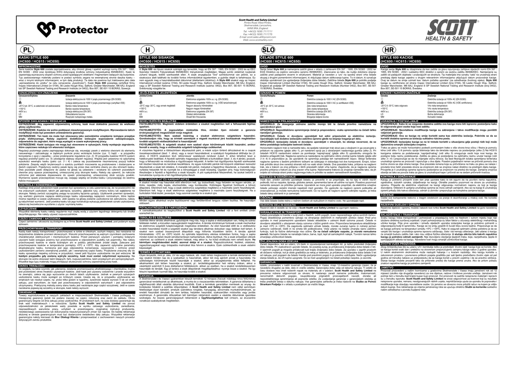 Scott Health and Safety Limited Pimbo Road, West Pimbo, Skelmersdale, Lancashire, WN8 9RA, England. Tel: +44 (0) 1695 711711 Fax: +44 (0) 1695 711775 E-mail: [email protected] Web: www.scottsafety.com A KASKI STYLE 600 (HC600 / HC615 / HC650) STYLE 600 SISAKOK (HC600 / HC615 / HC650) ČELADE STYLE 600 (HC600 / HC615 / HC650) STYLE 600 KACIGE (HC600 / HC615 / HC650) WPROWADZENIE BEVEZETÉS UVOD UVOD Seria kasków Style 600 została zaprojektowana, aby chronić głowę i spełnić wymogi normy EN 397 : 1995, EN 50365 : 2002 oraz dyrektywy EWG dotyczącej środków ochrony indywidualnej 89/686/EEC. Kaski te zapewniają wyznaczony stopień ochrony przed spadającymi obiektami i fragmentami walących się budynków. Typ zastosowanego materiału podano w postaci symbolu zegara na wewnętrznej stronie daszka kasku – wraz z innymi istotnymi informacjami, w tym datą produkcji. Ta data nie powinna być traktowana jako data „wprowadzenia do użytku” (w celu oznaczenia „żywotności”). Kaski Style 600 posiadają certyfikat firmy Inspec International Limited (nr 0194), 56 Leslie Hough Way, Salford, Greater Manchester, M6 6AJ, England lub SP Swedish National Testing and Research Institute (nr 0402), Box 857, SE-501 15 BORÅS, Szwecja. A Style 600 -es típusú sisakok szériáját úgy tervezték, hogy az EN 397 : 1995, EN 50365 : 2002 és az EEC Személyi Védelmi Felszerelések 89/686/EEC Irányelvének megfeleljen. Magas szintű védelmet nyújtanak zuhanó tárgyak, ledőlő szerkezetek ellen. A sisak anyagtípusa "óra" szimbólummal van jelölve, ez a sisakcsúcs alatt található és további fontos információkkal egyetemben, a gyártás idejét is tartalmazza. Ez nem egyezik meg a használatbavételi dátummal (élettartami célokhoz). A Style 600 sisakot vagy az Inspec International Limited (száma: 0194), 56 Leslie Hough Way, Salford, Greater Manchester, M6 6AJ, England, vagy a SP Swedish National Testing and Research Institute (száma: 0402), Box 857, SE-501 15 BORÅS, Svédország vizsgálta be. Serija čelad Style 600 je namenjena zaščiti glave v skladu z zahtevami EN 397 : 1995, EN 50365 : 2002 ter EGS Direktivo za osebno varovalno opremo 89/686/EEC. Zasnovane so tako, da nudijo določeno stopnjo zaščite pred padajočimi stvarmi in strukturami. Material je naveden z ‘uro’ na spodnji strani vrha čelade skupaj z drugimi pomembnimi informacijami, ki vključujejo datum oblikovanja lupine. To ni datum, ki označuje obdobje uporabnosti (za ugotavljanje življenjske dobe čelade). Zaščitne čelade Style 600 je potrdilo podjetje Inspec International Limited (Number 0194), 56 Leslie Hough Way, Salford, Greater Manchester, M6 6AJ, England ali podjetje SP Swedish National Testing and Research Institute (Number 0402), Box 857, SE-501 15 BORÅS, Švedska. Kacige serije Style 600 su dizajnirane da kao zaštite za glavu ispunjavaju zahtjeve sljedećih normi EN 397 : 1995, EN 50365 : 2002 i sukladno EEC direktivi o opremi za osobnu zaštitu 89/686/EEC. Namijenjene su zaštiti od padajućih objekata i urušavajućih se struktura. Tip materijala ima oznaku ‘sata’ na unutarnjoj strani prednjeg dijela kacige zajedno s drugim relevantnim informacijama uključujući datum proizvodnje kacige. Ovaj se datum ne smije uzimati kao ‘datum početka uporabe’ (za određivanje životnog vijeka). Style 600 kacige su certificirane od strane Inspec International Limited (broj 0194), 56 Leslie Hough Way, Salford, Greater Manchester, M6 6AJ, England ili SP Swedish National Testing and Research Institute (broj 0402), Box 857, SE-501 15 BORÅS, Švedska. OZNACZENIA I ICH ZNACZENIE JELÖLÉSEK ÉS JELENTÉSÜK OZNAKE IN POMENI OZNAKE I NJIHOVO ZNAČENJE Oznaczenie/Etykieta Znaczenie Jelölés/Címke -20°C lub -30°C, w zależności od zastosowania +150°C 440V a.c. LD MM Izolacja elektryczna do 1000 V prądu przemiennego (EN 50365) Izolacja elektryczna do 1000 V prądu przemiennego (certyfikat VDE) Bardzo niska temperatura Bardzo wysoka temperatura Izolacja elektryczna (EN 397) Odkształcenie boczne Rozpryski roztopionego metalu -20°C vagy -30°C, vagy ennek megfelelő +150°C 440V a.c. LD MM Jelentés Elektromos szigetelés 1000v a.c -ig. (EN 50365) Elektromos szigetelés 1000v a.c -ig. (VDE tanúsítvánnyal) Nagyon alacsony hőmérséklet Nagyon magas hőmérséklet Elektromos szigetelés (EN 397) Oldalsó deformálódás Olvadt fém fröccsenés SPOSÓB ZAKŁADANIA I REGULACJA BEHELYEZÉS ÉS BEÁLLÍTÁS OSTRZEŻENIE: Aby zapewnić odpowiednią ochronę, kask musi dokładnie pasować do wielkości głowy użytkownika. OSTRZEŻENIE: Kasków nie wolno poddawać nieautoryzowanym modyfikacjom. Wprowadzenie takich modyfikacji może być powodem unieważnienia gwarancji. OSTRZEŻENIE: Ten kask nie może być stosowany jako samodzielne urządzenie izolujące przepływ prądu elektrycznego. Należy zapewnić dodatkowe izolacyjne wyposażenie zabezpieczające, odpowiednie do zagrożeń, które mogą wystąpić w czasie wykonywanej pracy. OSTRZEŻENIE: Kaski izolujące nie mogą być stosowane w sytuacjach, kiedy występuje zagrożenie, które częściowo redukuje ich własności izolujące. Regulacji poziomego paska zapinającego dokonuje się, wsuwając pasek z wieloma otworami do elementu nasuwanego i zatrzaskując w żądanym punkcie przez wciśnięcie bolców (rys. 1) bądź – w przypadku korzystania z opcji z zapadką – przez przekręcanie regulatora (rys. 2). W przypadku kasków HC615 system regulacji przód/tył (patrz rys. 5) udostępnia większy stopień regulacji. Więźba jest ustawiona na optymalnej wysokości wewnątrz kasku (patrz rys. 3 i 4) i zaleca się pozostawienie niezmienionej pozycji kołków położenia. Zespoły więźb terylenowych o sześciu punktach mocowania są produkowane i dostarczane w dwóch częściach. Pojedynczy osobny pasek łączy się przez dwa centralne otwory po obu stronach kasku. Dwa pozostałe paski dołączone do paska na głowę są ustawiane i wcis