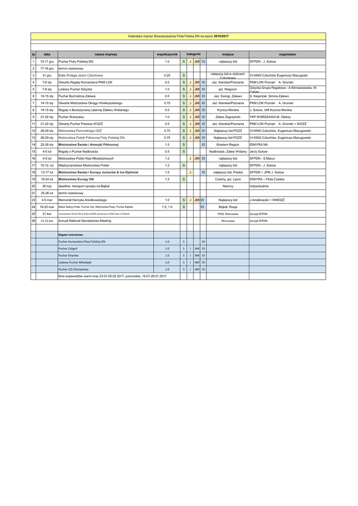 Kalendarz imprez Stowarzyszenia Flota Polska DN na sezon 2016/2017 lp data 1 10-11 gru Puchar Floty Polskiej DN nazwa imprezy 2 17-18 gru termin rezerwowy 3 31 gru 4 7-8 sty 5 7-8 sty 6 14-15 sty 7 14-15 sty 8 współczynnik kategorie miejsce organizator J JMł IO najlepszy lód S J JMł IO nalepszy lód w ololicach Człuchowa Jez. Kierskie/Poznania 1.0 S J JMł IO jez. Niegocin Puchar Burmistrza Zalewa 0.5 S J JMł IO Jez. Ewingi, Zalewo Otwarte Mistrzostwa Okręgu Wielkopolskiego 0.75 S J JMł IO Jez. Kierskie/Poznania 14-15 sty Regaty o Bursztynową Latarnię Zalewu Wiślanego 0.5 S J JMł IO Krynica Morska J. Sukow, UM Krynica Morska YKP WARSZAWA M. Oleksy 1.0 S Biała Wstęga Jezior Człuchowa 0.25 S Otwarte Regaty Komandora PKM LOK 0.5 Lodowy Puchar Giżycka SFPDN - J. Sukow VI-KING Człuchów Eugeniusz Macugoski PKM LOK Poznań A. Gronski Giżycka Grupa Regatowa - A.Klimaszewska, W. Caban S. Kasprzak, Gmina Zalewo PKM LOK Poznań A. Gronski 9 21-22 sty Puchar Warszawy 1.0 S J JMł IO Zalew Zegrzyński 11 21-22 sty Otwarty Puchar Prezesa WOZŻ 0.5 S J JMł IO Jez. Kierskie/Poznania 12 28-29 sty Mistrzostwa Pomorskiego OZŻ 0.75 S J JMł IO Najlepszy lód POZŻ VI-KING Człuchów, Eugeniusz Macugowski 13 28-29 sty Mistrzostwa Flotylli Północnej Floty Polskiej DN 0.75 S J JMł IO Najlepszy lód POZŻ VI-KING Człuchów, Eugeniusz Macugowski 14 22-28 sty Mistrzostwa Świata i Ameryki Północnej 1.5 S 15 4-5 lut Regaty o Puchar Nadbrzeża 0.5 S 16 4-5 lut Mistrzostwa Polski Klas Młodzieżowych 1.2 17 10-12. lut Międzynarodowe Mistrzostwa Polski 1.2 18 13-17 lut Mistrzostwa Świata i Europy Juniorów & Ice-Optimist 1.5 19 19-24 lut Mistrzostwa Europy DN 1.5 20 26 luty 21 25-26 lut 23 4-5 mar 24 18-25 mar 25 21 kwi 26 21-23 kwi IO Western Region PKM LOK Poznań A. Gronski + WOZŻ IDNIYRA NA Nadbrzeże, Zalew Wiślany Jerzy Sukow J JMł IO S J IO S deadline: transport sprzętu na Bajkał najlepszy lód SFPDN - S.Macur najlepszy lód SFPDN - J. Sukow najlepszy lód, Polska SFPDN + JPM J. Sukow Czechy, jez. Lipno IDNIYRA – Flota Czeska Niemcy indywidualnie termin rezerwowy Memoriał Henryka Aniołkowskiego Baikal Sailing Week: Puchar Azji, Mistrzostwa Rosji, Puchar Bajkału 1.0 S 1.5, 1.0 S J JMł IO Najlepszy lód IO Bajkał, Rosja uroczystości 50 lat DN w Polsce/50th aniversary of DN class in Poland Annual National Secretarioes Meeting Regaty rezerwowe Puchar Komandora Floty Polskiej DN 1.0 S Puchar Caliguli 1.0 S J JMł IO Puchar Śniardw 1.0 S J JMł IO Lodowy Puchar Mikołajek 1.0 S J JMł IO Puchar LZS Charzykowy 1.0 S J JMł IO ferie województw warm-maz 23.01-05.02.2017, pomorskie, 16.01-29.01.2017 IO J.Aniołkowski + WMOZŻ PKOL Warszawa Zarząd SFPDN Warszawa Zarząd SFPDN