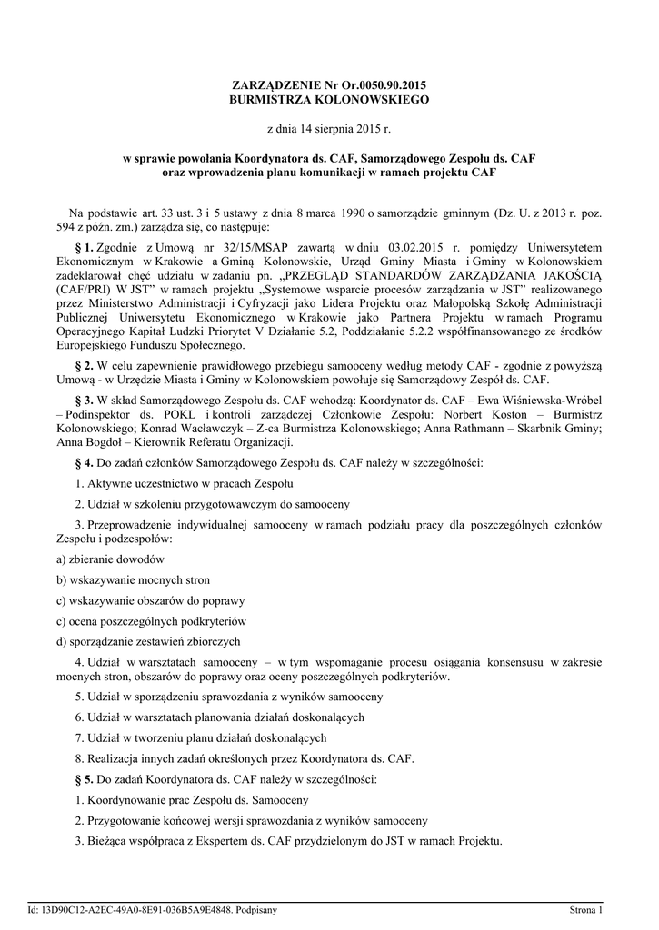 ZARZĄDZENIE Nr Or.0050.90.2015 BURMISTRZA KOLONOWSKIEGO z dnia 14 sierpnia 2015 r. w sprawie powołania Koordynatora ds. CAF, Samorządowego Zespołu ds. CAF oraz wprowadzenia planu komunikacji w ramach projektu CAF Na podstawie art. 33 ust. 3 i 5 ustawy z dnia 8 marca 1990 o samorządzie gminnym (Dz. U. z 2013 r. poz. 594 z późn. zm.) zarządza się, co następuje: § 1. Zgodnie z Umową nr 32/15/MSAP zawartą w dniu 03.02.2015 r. pomiędzy Uniwersytetem Ekonomicznym w Krakowie a Gminą Kolonowskie, Urząd Gminy Miasta i Gminy w Kolonowskiem zadeklarował chęć udziału w zadaniu pn. „PRZEGLĄD STANDARDÓW ZARZĄDZANIA JAKOŚCIĄ (CAF/PRI) W JST” w ramach projektu „Systemowe wsparcie procesów zarządzania w JST” realizowanego przez Ministerstwo Administracji i Cyfryzacji jako Lidera Projektu oraz Małopolską Szkołę Administracji Publicznej Uniwersytetu Ekonomicznego w Krakowie jako Partnera Projektu w ramach Programu Operacyjnego Kapitał Ludzki Priorytet V Działanie 5.2, Poddziałanie 5.2.2 współfinansowanego ze środków Europejskiego Funduszu Społecznego. § 2. W celu zapewnienie prawidłowego przebiegu samooceny według metody CAF - zgodnie z powyższą Umową - w Urzędzie Miasta i Gminy w Kolonowskiem powołuje się Samorządowy Zespół ds. CAF. § 3. W skład Samorządowego Zespołu ds. CAF wchodzą: Koordynator ds. CAF – Ewa Wiśniewska-Wróbel – Podinspektor ds. POKL i kontroli zarządczej Członkowie Zespołu: Norbert Koston – Burmistrz Kolonowskiego; Konrad Wacławczyk – Z-ca Burmistrza Kolonowskiego; Anna Rathmann – Skarbnik Gminy; Anna Bogdoł – Kierownik Referatu Organizacji. § 4. Do zadań członków Samorządowego Zespołu ds. CAF należy w szczególności: 1. Aktywne uczestnictwo w pracach Zespołu 2. Udział w szkoleniu przygotowawczym do samooceny 3. Przeprowadzenie indywidualnej samooceny w ramach podziału pracy dla poszczególnych członków Zespołu i podzespołów: a) zbieranie dowodów b) wskazywanie mocnych stron c) wskazywanie obszarów do poprawy c) ocena poszczególnych podkryteriów d) sporządzanie zestawień zbiorczych 4. Udział w warsztatach samooceny – w tym wspomaganie procesu osiągania konsensusu w zakresie mocnych stron, obszarów do poprawy oraz oceny poszczególnych podkryteriów. 5. Udział w sporządzeniu sprawozdania z wyników samooceny 6. Udział w warsztatach planowania działań doskonalących 7. Udział w tworzeniu planu działań doskonalących 8. Realizacja innych zadań określonych przez Koordynatora ds. CAF. § 5. Do zadań Koordynatora ds. CAF należy w szczególności: 1. Koordynowanie prac Zespołu ds. Samooceny 2. Przygotowanie końcowej wersji sprawozdania z wyników samooceny 3. Bieżąca współpraca z Ekspertem ds. CAF przydzielonym do JST w ramach Projektu. Id: 13D90C12-A2EC-49A0-8E91-036B5A9E4848. Podpisany Strona 1 4. Współpraca z Partnerem oraz Liderem Projektu. 5. Przygotowanie projektu Planu Doskonalenia na podstawie wyników samooceny oraz warsztatów planowania działań doskonalących. 6. Koordynacja i monitorowanie realizacji działań doskonalących zatwierdzonych do realizacji przez Kierownictwo Urzędu. § 6. W celu upowszechnienia informacji o projekcie samooceny CAF wprowadza się plan komunikacji – stanowiący załącznik nr 1 do niniejszego Zarządzenia. § 7. Zobowiązuje się kierowników komórek organizacyjnych Urzędu do zapoznania z treścią zarządzenia podległych im pracownikom oraz współpracy z Koordynatorem ds. CAF w zakresie realizacji procesu samooceny, wykonania planu komunikacji oraz realizacji działań doskonalących. § 8. Wykonanie zarządzenia powierza się Koordynatorowi ds. CAF. § 9. Zarządzenie wchodzi w życie z dniem podpisania. Burmistrz Kolonowskiego Norbert Koston Id: 13D90C12-A2EC-49A0-8E91-036B5A9E4848. Podpisany Strona 2 Załącznik do Zarządzenia Nr Or.0050.90.2015 Burmistrza Kolonowskiego z dnia 14 sierpnia 2015 r. Projekt współfinansowany przez Unię Europejską w ramach Europejskiego Funduszu Społecznego Plan komunikacji w ramach projektu CAF Urząd Miasta i Gminy w Kolonowskiem Kolonowskie, sierpień 2015 r. Id: 13D90C12-A2EC-49A0-8E91-036B5A9E4848. Podpisany Strona 1 SPIS TREŚCI: WPROWADZENIE 1. Projekt wdrożenia metody CAF w Urzędzie 2. Plan komunikacji wdrożenia metody CAF w Urzędzie 2.1 Zainteresowane strony 2.2 Potrzeby informacyjne i oczekiwane korzyści 2.3 Dostawca informacji 2.4 Zakres, forma i częstotliwość komunikacji Id: 13D90C12-A2EC-49A0-8E91-036B5A9E4848. Podpisany Strona 2 WPROWADZENIE Celem niniejszego dokumentu jest określenie planu komunikacji dla projektu wdrożenia metody CAF w Urzędzie Miasta i Gminy w Kolonowskiem. W szczególności w dokumencie określone zostaną: cele projektu wdrożenia metody CAF, strony zainteresowane projektem oraz ich potrzeby komunikacyjne, sposób, forma i częstotliwość informacji na temat realizowanego projektu przekazywanych poszczególnym grupom odbiorców, 1. Projekt wdrożenia metody CAF w Urzędzie Wspólna Metoda Oceny – CAF (ang. Common Assessment Framework) jest narzędziem przeznaczonym dla jednostek administracji publicznej, mającym na celu poprawę zarządzania. Model skupia się przeprowadzeniu samooceny, identyfikacji obszarów doskonalenia oraz wprowadzaniu wymaganych usprawnień zarządczych. Metoda samooceny proponowana w ramach CAF opiera się na założeniu, że doskonałe wyniki organizacji osiągane są poprzez przywództwo ukierunkowane na strategię i planowanie, pracowników, partnerstwo, zasoby i procesy. Dzięki CAF organizacje wyrażające chęć wdrożenia systematycznego procesu doskonalenia swoich działań uzyskują proste, przystosowane do specyfiki sektora administracji publicznej, narzędzie samooceny. Samoocena oparta o model CAF dostarcza informacji będących podstawą do doskonalenia funkcjonowania urzędu, poprzez: identyfikację mocnych stron, identyfikację obszarów do doskonalenia, opracowanie i wdrożenie zbioru dobry