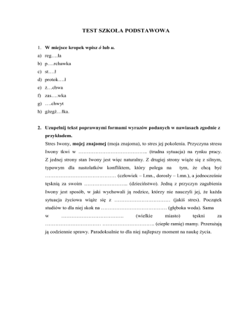 TEST SZKOŁA PODSTAWOWA 1. W miejsce kropek wpisz ó lub u. a) reg….ła b) p….rchawka c) st….ł d) protok….ł e) ż…chwa f) zas….wka g) ….chwyt h) gżegż…łka. 2. Uzupełnij tekst poprawnymi formami wyrazów podanych w nawiasach zgodnie z przykładem. Stres Iwony, mojej znajomej (moja znajoma), to stres jej pokolenia. Przyczyna stresu Iwony tkwi w ………………………………….. (trudna sytuacja) na rynku pracy. Z jednej strony stan Iwony jest więc naturalny. Z drugiej strony wiąże się z silnym, typowym dla nastolatków konfliktem, który polega na tym, że chcą być …………………………………… (człowiek – l.mn., dorosły – l.mn.), a jednocześnie tęsknią za swoim …………………….. (dzieciństwo). Jedną z przyczyn zagubienia Iwony jest sposób, w jaki wychowali ją rodzice, którzy nie nauczyli jej, że każda sytuacja życiowa wiąże się z …………………………… (jakiś stres). Początek studiów to dla niej skok na ………………………………… (głęboka woda). Sama w ………………………………. (wielkie miasto) tęskni za …………………………… …………………………. (ciepłe ramię) mamy. Przerażają ją codziennie sprawy. Paradoksalnie to dla niej najlepszy moment na naukę życia. 3. Swoimi słowami krótko wyjaśnij znaczenia frazeologizmów: a) Dzielić skórę na niedźwiedziu - ……………………………………………………….. ………………………………………………………………………………………….. b) Patrzeć przez palce - …………………………………………………………………… ………………………………………………………………………………………….. c) Nabrać wody w usta - …………………………………………………………………... ………………………………………………………………………………………..... d) Nić Ariadny - ………………………………………………………………………….. …………………………………………………………………………………………. 4. Uzupełnij tabelę, wpisując, o ile to możliwe, odpowiedni stopień przymiotników: Stopień równy Stopień wyższy Stopień najwyższy drewniany zły zwyczajny znany krzepki pusta 5. Nazwij wyróżnione części mowy. a) Nasza mama dostała wczoraj w prezencie psa. - ……………………………………… b) Gdy znajdziemy sponsora, odnowimy stary zamek. - ………………………… c) Franek jest prawdziwym bohaterem. - ………………………………………………... d) Julia założyła na bal sylwestrowy zieloną suknię.-…...................................................... e) Marek zajął drugie miejcie z zawodach sportowych. - …............................................... Wypisz wszystkie czasowniki z tego zadania i określ ich liczbę, osobę, czas i rodzaj. …................................................................................................................................................. ..................................................................................................................................................... ..................................................................................................................................................... ..................................................................................................................................................... ..................................................................................................................................................... 6. Zamień podkreślone w tekście sformułowania jednowyrazowymi nazwami mieszkańców miast lub państw. Ciekawy świata mieszkaniec Gdyni ….............................................wyruszył w podróż po Europie. Zwiedził niejedno piękne miejsce i poznał wielu interesujących ludzi. Szczególnie zaprzyjaźnił się z sympatyczną ....................................................... , z którą mieszkanką Paryża rozmawiał po polsku, ponieważ tego języka nauczył ją dziadek - mieszkaniec Warszawy................................................. Opowiedziała mu o swojej babci, która nie była obywatelką Francji................................., ale mieszkanką Grecji ….................................................... Wyjechała do Francji, ponieważ chciała z okna widzieć wieżę Eiffla i tam poznała swojego męża. 7. Wstaw przecinki w odpowiednie miejsca: „A teraz chcielibyście się na pewno dowiedzieć co się stało z Edmundem. Edmund zjadł obiad wraz z innymi ale nie sprawiało mu to specjalnej przyjemności ponieważ przez cały czas myślał o ptasim mleczku a nic tak nie psuje smaku dobrego normalnego jedzenia jak wspomnienie o jakimś złym zaczarowanym przysmaku. Rozmowa której się przysłuchiwał również nie sprawiała mu przyjemności bo miał wrażenie że nikt nie zwraca na niego uwagi a jeśli już ktoś zwraca to traktuje go bardzo ozięble. Oczywiście mijało się to z prawdą ale Edmund był o tym święcie przekonany. Wysłuchał tego wszystkiego co pan Bóbr mówił im o Aslanie a kiedy dowiedział się o spotkaniu wyznaczonym przy Kamiennym Stole niepostrzeżenie wśliznął się za kotarę która osłaniała drzwi. Podczas gdy w innych samo wspomnienie imienia Aslana rodziło jakieś tajemnicze cudowne uczucie w nim budziło coś równie tajemniczego ale i strasznego zarazem.” (Opowieści z Narni. Lew, Czarownica i stara szafa, Clive Staples Lewis) 8. Nazwij poszczególne części podanego zdania, a następnie sporządź wykres: Młodziutki Amerykanin codziennie ciężko pracuje w fabryce pomidorów swego ojca. 9. Podaj skróty następujących wyrazów. Zwróć uwagę na kropkę. a) 2 grosze - ……………