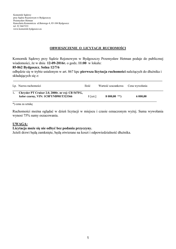 Komornik Sądowy przy Sądzie Rejonowym w Bydgoszczy Przemysław Hetman Kancelaria Komornicza ul.Batorego 4, 85-104 Bydgoszcz tel. 52 3667333 www.komornik.bydgoszcz.eu OBWIESZCZENIE O LICYTACJI RUCHOMOŚCI Komornik Sądowy przy Sądzie Rejonowym w Bydgoszczy Przemysław Hetman podaje do publicznej wiadomości, że w dniu 12-09-2016r. o godz. 11:00 w lokalu: 85-862 Bydgoszcz, Solna 12/7/6 odbędzie się w trybie ustalonym w art. 867 kpc pierwsza licytacja ruchomości należących do dłużnika i składających się z: ____________________________________________________________________________________________________ Lp. Nazwa ruchomości Ilość Wartość szacunkowa Cena wywołania _____________________________________________________________________________________________________ 1. Chrysler PT Cruiser 2.0, 2000r. nr rej: CB 547FG, kolor czarny, VIN: 1C8FYNB981T323366 1 [szt.] 8 000,00 **) 6 000,00 _______________________________________________________________________________________________________________________ *) cena za sztukę Ruchomości można oglądać w dzień licytacji w miejscu i czasie oznaczonym wyżej. Suma wywołania wynosi 75% sumy oszacowania. UWAGA: Licytacja może się nie odbyć bez podania przyczyny. Jeżeli drzwi będą zamknięte, będą otwierane na koszt i odpowiedzialność dłużnika. 1
