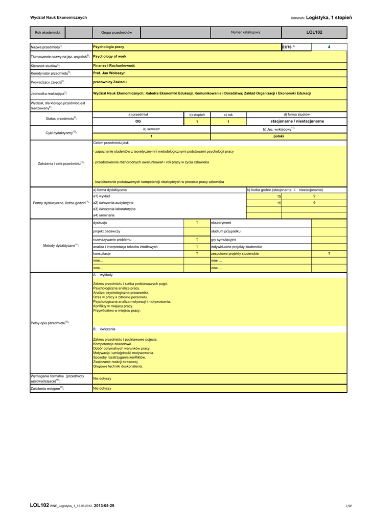 Wydział Nauk Ekonomicznych kierunek: Rok akademicki: Nazwa przedmiotu1): LOL102 Numer katalogowy: Grupa przedmiotów Logistyka, 1 stopień 4 ECTS 2) Psychologia pracy 3) Tłumaczenie nazwy na jęz. angielski : Psychology of work Kierunek studiów4): Finanse i Rachunkowość 5) Koordynator przedmiotu : Prof. Jan Wołoszyn Prowadzący zajęcia6): pracownicy Zakładu Jednostka realizująca7): Wydział Nauk Ekonomicznych; Katedra Ekonomiki Edukacji, Komunikowania i Doradztwa; Zakład Organizacji i Ekonomiki Edukacji Wydział, dla którego przedmiot jest realizowany8): Status przedmiotu9): a) przedmiot b) stopień c) rok d) forma studiów OG 1 1 stacjonarne / niestacjonarne Cykl dydaktyczny10): a) semestr b) Jęz. wykładowy11) 1 polski Celem przedmiotu jest: - zapoznanie studentów z teoretycznymi i metodologicznymi podstawami psychologii pracy Założenia i cele przedmiotu12): - przedstawienie różnorodnych uwarunkowań i roli pracy w życiu człowieka - kształtowanie podstawowych kompetencji niezbędnych w procesie pracy człowieka a) forma dydaktyczna Formy dydaktyczne, liczba godzin13): b) liczba godzin (stacjonarne i niestacjonarne) a1) wykład 15 9 a2) ćwiczenia audytoryjne 15 9 a3) ćwiczenia laboratoryjne a4) seminaria dyskusja T projekt badawczy Metody dydaktyczne14): eksperyment studium przypadku rozwiazywanie problemu T analiza i interpretacja tekstów źródłowych T gry symulacyjne indywidualne projekty studenckie konsultacje T zespołowe projekty studenckie inne… inne … inne… inne … A. T wykłady Zakres przedmiotu i siatka podstawowych pojęć. Psychologiczna analiza pracy. Analiza psychologiczna pracownika. Stres w pracy a zdrowie personelu. Psychologiczna analiza motywacji i motywowania. Konflikty w miejscu pracy. Przywództwo w miejscu pracy. Pełny opis przedmiotu15): B. ćwiczenia Zakres przedmiotu i podstawowe pojęcia. Kompetencje zawodowe. Dobór optymalnych warunków pracy. Motywacja i umiejętność motywowania. Sposoby rozstrzygania konfliktów. Zwalczanie reakcji stresowej. Grupowe techniki doskonalenia. Wymagania formalne (przedmioty wprowadzające)16): Nie dotyczy Założenia wstępne17): Nie dotyczy LOL102 WNE_Logistyka_1_12.03.2012, 2013-05-29 LW Wydział Nauk Ekonomicznych Efekty kształcenia18): (z kolejnymi numerami, 01, 02, 03 itd.) kierunek: Logistyka, 1 stopień 01 - definiuje podstawowe pojęcia z zakresu psychologii pracy 05 - zorientowany na potrzebę ciągłego doskonalenia kompetencji społecznych 02 - identyfikuje kompetencje z obszaru rynku pracy 06 - 03 - analizuje cechy, umiejętności i kompetencje człowieka pod kątem ich przydatności w pracy zawodowej 07 - 04 - ocenia środowisko pracy pod kątem psychologicznym, fizycznym i społecznym 08 - kolokwium na zajęciach ćwiczeniowych 01, 02 03, 04 ocena wykonanie zadania projektowego na zdefiniowany temat praca pisemna przygotowywana w ramach pracy własnej studenta Sposób weryfikacji efektów kształcenia19): ocena wynikająca z obserwacji w trakcie zajęć ocena eksperymentów wykonywanych w trakcie zajęć ocena wystąpień i prezentacji w trakcie zajęć egzamin pisemny 03, 04, 05 01, 02 egzamin ustny Forma dokumentacji osiągniętych efektów kształcenia 20): złożone projekty T treść pytań egzaminacyjnych z oceną inne.. Waga w % 10% praca pisemna przygotowywana w ramach pracy własnej studenta Elementy i wagi mające wpływ na ocenę końcową21): imienne karty oceny studenta inne.. inne… kolokwium na zajęciach ćwiczeniowych test komputerowy inne.. T inne… Element oceny Element oceny ocena wykonania zadania projektowego na zdefiniowany temat przygotowanie zespołowej analizy zdefiniowanego problemu ocena wystąpień i prezentacji w trakcie zajęć 10% obserwacja w trakcie dyskusji zdefiniowanego problemu (aktywność) 50% test egzamin ustny inne… Miejsce realizacji zajęć22): Waga w % 20% ocena wynikająca z obserwacji w trakcie zajęć ocena eksperymentów wykonywanych w trakcie zajęć egzamin pisemny 04, 05 inne.. inne… okresowe prace pisemne przygotowanie zespołowej analizy zdefiniowanego problemu obserwacja w trakcie dyskusji zdefiniowanego problemu (aktywność) 10% inne.. inne.. Sala dydaktyczna Literatura podstawowa i uzupełniająca23): a) podstawowa 1. Schultz D., Schultz S., 2007. Psychologia a wyzwania dzisisiejszej pracy, Wydawnictwo Naukowe PWN, Warszawa. 2. Czarnecki K., 2001. Podstawy psychologii pracy, Kraków. b) uzupełniająca 3. Chmiel N., 2003. Psychologia pracy i organizacji, Gdańskie Wydawnictwo sychologiczne, Gdańsk. 4. Lehmann G., 1996. Praktyczna psychologia pracy, ZWL, Warszawa. 5. 6. 7. 8. UWAGI24): LOL102 WNE_Logistyka_1_12.03.2012, 2013-05-29 LW
