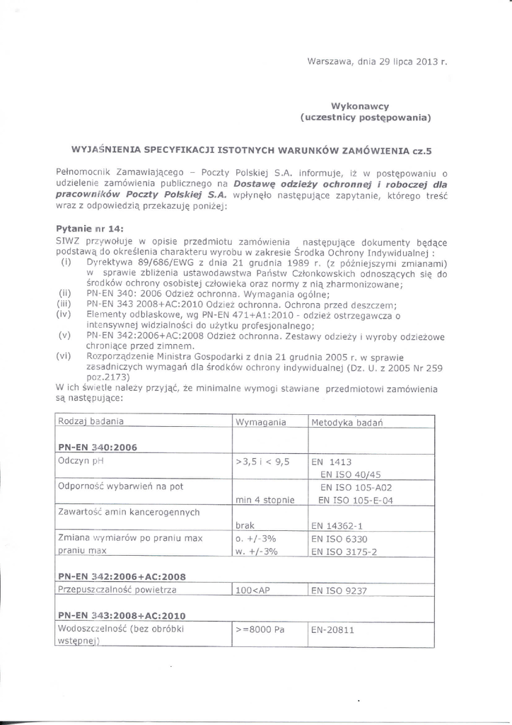 Warszawa, dnia 29 lipca 2013 r. Wykonawcy (uczestnicy post^powania) WYJAIiiNIENIA SPECYFIKACJI ISTOTNYCH WARUNKOW ZAMOWIENIA cz.5 Pelnomocnik Zamawiaja^cego - Poczty Polskiej S.A, informuje, iz w poste_powaniu o udzielenk: zamowienia publicznego na Dostawq odziezy ochronnej i roboczej dla pracowrtnkow Poczty Polskiej S.A. wptyne_fo naste_puja,ce zapytanie, ktorego tresc wraz 2 odpowiedziq. przekazuje. ponizej; Pytanie inr 14: SIWZ przywoluje w opisie przedmiotu zamowienia r nastQpuja.ee dokumenty b^da^ce podstawei. do okreslenia charakteru wyrobu w zakresie Srodka Ochrony Indywiduainej : (i) Dyrektywa 89/686/EWG z dnia 21 grudnia 1989 r. (z pozniejszymi zmianami) w sprawie zblizenia ustawodawstwa Panstw Czlonkowskich odnosza,cych si^ do srodkow ochrony osobistej czlowieka oraz normy z nia_ zharmonizowane; (ii) PN-EN 340: 2006 Odziez ochronna- Wymagania ogolne; (iii) PN-EN 343 2008+AC:2010 Odziez ochronna, Ochrona przed deszczem; (iv) Elementy odblaskowe, wg PN-EN 471+A1:2010 - odziez ostrzegawcza o intensywnej widzialnosci do uzytku profesjonalnego; (v) PN-EN 342:2006+AC:2008 Odziez ochronna. Zestawy odziezy i wyroby odziezowe chroniqce przed zimnem. (vi) Rozporza^dzenie Ministra Gospodarki z dnia 21 grudnia 2005 r, w sprawie Zcsadniczych wymagan dla srodkovv ochrony indywidualnej (Dz. U. z 2005 Nr 259 poz.2173) W ich swetle nalezy przyja^c, ze minimalne wymogi stawiane przedmiotowi zam6wienia Rodzaj badania Wymaqania Metodyka badan >3,5 i < 9,5 min 4 stopnie EN 1413 EN ISO 40/45 EN ISO 105-A02 EN ISO 105-E-04 brak o, +/-3% w. +/-3% EN 14362-1 EN ISO 6330 EN ISO 3175-2 100<AP EN ISO 9237 >^8000 Pa EN-20811 PN-EN 340:2006 Odczyn pH Odpornosc wybarwieri na pot Zawartosc amin kancerogennych Zmiana v:ymiarow po praniu max praniu max PN-EN 3;42:2006+AC:2008 Przepuszczalnosc powietrza PN-EN 3;43:2008+AC:2010 Wodoszczelnosc (bez obrobki wste_pnej) Wodoszczelnosc szwow Opor p_ary wodnej_Ret Wytrzymalosc na rozcia^ganie Min Sila zrywaja_ca min. Wytrzymalosc szwow min. >-800Q Pa powyzej 40 o. 450 N w. 450 N o. 25 N w.25 N 225 N EN- 20811 EN 31092 ISO 1421 EN ISO 13934-1 EN ISO 13935-2 Czy zatem w swietle Dyrektywy 89/686/EWG z dnia 21 grudnia 1989 r. (z pozniejszymi zmianami) Rozdzial II, Artykul 8, punkt 3 i 4 podpunkt 4 nalezy rozi.miec, ze przedrniotem zamowienia jest SOI mieszczacy sie. w tej grupie opisanej w Dyrektywie? Odpowiedz nr 14: Zamawiaja,cy potwierdza, ze wymienione w pismie wymagania sa, okreslone w przywolanych przepisach i normach, Przedmiot urnowy powinien bye zgodny z wymienionymi w pismie zasadniczymi wymaganiami jak rowniez z pczostalymi wymogami okreslonymi w normach. Zamawiajgcy znalazl blajd w przeslanym pismie: - jest: PN EN 342 - przepuszczalnosc powietrza 100<AP7 powinno bye 100>AP. Zarnawiaja.cy nie odnosi sie. do metodyki badari, poniewaz nie wymaga przedstawienia wynikow badari. Przedmiot zamowienia jest SOI mieszczqcym si^ w Rozdziale II, ArtykuJ 8, punkt 3 Dyrektywy 89/686/EWG. Pytanie nr 15: SIWZ definiuje diugosc kurtki przy wzroscie 160 cm. Jednoczesnie tabela za-l^czona do SIWZ podaje przedzialy wzrostu damskie i me.skie. Czy zatem mozna przyjcic, ze w kategorii damskiej dla przedzialu wzrostu 152-161 przyjmuje sie. diugosc srednia, 68 cm, a dla kategorii rne.skiej dla przedziakj wzrostu 167-176 przyjmuje sie. diugosc siredni^. 75 cm? Odpowiedz nr 15: Zamawiaja^cy okreslil diugosc kurtki dla wzrostu 160 cm. Diugosc kurtek dla pozostalych rozmiarow powinna bye proporcjonalnie stopniowana zgodnie z podzialami rozmiarowymi dla wzrostu kobiet i me^zczyzn zamieszczonymi w SIWZ. Zamawiaja^cy nie opuszcza przyje.cia jednej sredniej dlugosci dla okreslonego przedzialu wzrostu. Pytanie nr 16: SIWZ wymaga pol^czenia warstwy zewne,trznej kurtki z cze.scia, polarowa, za pomoca, zarnka i zapinki z napy przy podkroju szyL Zapis jest nieprecyzyjny w swietle stosowanej praktyki. Dol kurtki i dol r^kawow tez powinien la.czyc warstwe. zewne.trzn^ z podpinka^ polarowa.. Czy zatem nalezy uwzg!e.dnic we wzorze pola^czenie dolnych cz^sci kurtki i re_kaw6w, cz^sci zewn^trznej i polaru za pomoca, nap? Odpowiedz nr 16: Zamawiaja.cy nie wskazal na obowia^zek pola^czenia dolu kurtki polarowej i dolu re.kawow polaru z warstwy zewne.trzna^ kurtki. To od Wykonawcy zalezy czy w przygotowanym przez niego wzorze przewidziane be^dzie pola^czenie kurtki zewn^trznej i polaru w dodatkowych miejscach poza podkrojem szyi. Zamawiaja^cy nie narzuca wykcnawcom, ktorzy zdecyduja, sie. na dodatkowe !a,czenia, sposobu w jaki l^czenie ma zostac wykonane. Przygotowane przez wykonawcow wzory (llszt.) przedstawione do Odbioru Wste_pnego b^da^ podstawa, do odbiorow ilosciowych i jakosciowych Zamawiaja.cego. Pytanie inr 17: SIWZ zak-ada wykonanie przedmiotu zamowienia w terminie 60 dni. Wnosimy o zmian^ terminu realizacji zamowienia na 150 dni. Wniosek nasz wynika z faktu, ze zajdany przez Zamawiajacego kolor tkaniny nie jest standardowym kolorem kataiogowym. Kolor musi zostac specjalnie przygotowany przez producenta tkanin, Zdolnosc przedsie^biorstw tekstylnych-producentow tkanin wynosi sredniomiesiQcznie 12 000 mb, co oznacza, ze produkcja tkaniny na wykonanie zamowienia wyniesie okolo 3,5 miesia^ca. Biora,c pod uwag^ niezbe_dny czas konfekcjonowania (krojenie i szycie) minimainy czas potrzebny na realizacj^ jmowy wyniesie 5 miesie^cy, Tak wie^c z gory wiadomo, ze zaden z oferentow nie jest w stanie wykonac zamowienia w cia^gu 60 dni, W swietle zapisow SIWZ, zakfadajci;: nierealny termin realizacji zamowienia, zachodzi przeslanka, ze zajjanie tego terminu vv konsekwencji naliczenie kar umownych z tytutu zwfoki jest swiadomym srodkiem przysporzenia. Odpowierlz nr 17; Zamawiajcxcy nie wyraza zgody na przediuzenie terminu realizacji zamowienia. W projekcie umowy terminy realizacji zamowienia zostaty okreslone w dniach roboczych. a nie kalendarzowych. Dla cze.sci 1 zamowienia, termin realizacji wynosi 95 dni roboczych, tj,: 30 dni roboczych od podpisania umowy na przedstawienie 11 szt, asortymentu do Odbioru Wst^