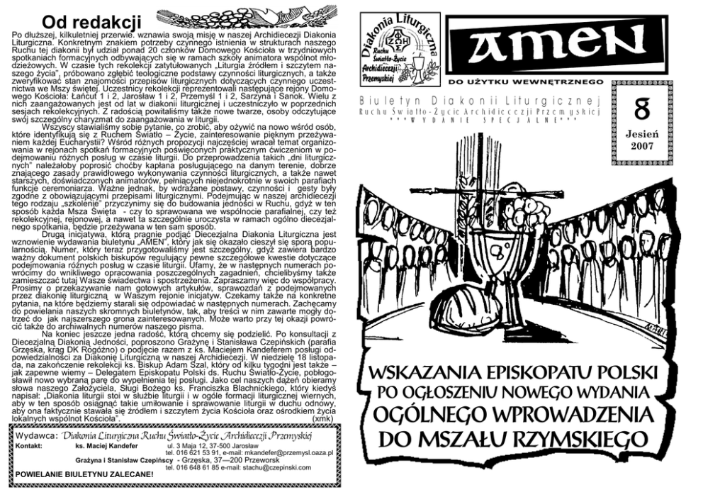 Od redakcji Po dłuższej, kilkuletniej przerwie. wznawia swoją misję w naszej Archidiecezji Diakonia Liturgiczna. Konkretnym znakiem potrzeby czynnego istnienia w strukturach naszego Ruchu tej diakonii był udział ponad 20 członków Domowego Kościoła w trzydniowych spotkaniach formacyjnych odbywających się w ramach szkoły animatora wspólnot młodzieżowych. W czasie tych rekolekcji zatytułowanych „Liturgia źródłem i szczytem naszego życia”, próbowano zgłębić teologiczne podstawy czynności liturgicznych, a także zweryfikować stan znajomości przepisów liturgicznych dotyczących czynnego uczestnictwa we Mszy świętej. Uczestnicy rekolekcji reprezentowali następujące rejony Domowego Kościoła: Łańcut 1 i 2, Jarosław 1 i 2, Przemyśl 1 i 2, Sarzyna i Sanok. Wielu z nich zaangażowanych jest od lat w diakonii liturgicznej i uczestniczyło w poprzednich sesjach rekolekcyjnych. Z radością powitaliśmy także nowe twarze, osoby odczytujące swój szczególny charyzmat do zaangażowania w liturgii. Wszyscy stawialiśmy sobie pytanie, co zrobić, aby ożywić na nowo wśród osób, które identyfikują się z Ruchem Światło – Życie, zainteresowanie pięknym przeżywaniem każdej Eucharystii? Wśród różnych propozycji najczęściej wracał temat organizowania w rejonach spotkań formacyjnych poświęconych praktycznym ćwiczeniom w podejmowaniu różnych posług w czasie liturgii. Do przeprowadzenia takich „dni liturgicznych” należałoby poprosić choćby kapłana posługującego na danym terenie, dobrze znającego zasady prawidłowego wykonywania czynności liturgicznych, a także nawet starszych, doświadczonych animatorów, pełniących niejednokrotnie w swoich parafiach funkcje ceremoniarza. Ważne jednak, by wdrażane postawy, czynności i gesty były zgodne z obowiązującymi przepisami liturgicznymi. Podejmując w naszej archidiecezji tego rodzaju „szkolenie” przyczynimy się do budowania jedności w Ruchu, gdyż w ten sposób każda Msza Święta - czy to sprawowana we wspólnocie parafialnej, czy też rekolekcyjnej, rejonowej, a nawet ta szczególnie uroczysta w ramach ogólno diecezjalnego spotkania, będzie przeżywana w ten sam sposób. Drugą inicjatywa, którą pragnie podjąć Diecezjalna Diakonia Liturgiczna jest wznowienie wydawania biuletynu „AMEN”, który jak się okazało cieszył się sporą popularnością. Numer, który teraz przygotowaliśmy jest szczególny, gdyż zawiera bardzo ważny dokument polskich biskupów regulujący pewne szczegółowe kwestie dotyczące podejmowania różnych posług w czasie liturgii. Ufamy, że w następnych numerach powrócimy do wnikliwego opracowania poszczególnych zagadnień, chcielibyśmy także zamieszczać tutaj Wasze świadectwa i spostrzeżenia. Zapraszamy więc do współpracy. Prosimy o przekazywanie nam gotowych artykułów, sprawozdań z podejmowanych przez diakonię liturgiczną w Waszym rejonie inicjatyw. Czekamy także na konkretne pytania, na które będziemy starali się odpowiadać w następnych numerach. Zachęcamy do powielania naszych skromnych biuletynów, tak, aby treści w nim zawarte mogły dotrzeć do jak najszerszego grona zainteresowanych. Może warto przy tej okazji powrócić także do archiwalnych numerów naszego pisma. Na koniec jeszcze jedna radość, którą chcemy się podzielić. Po konsultacji z Diecezjalną Diakonią Jedności, poproszono Grażynę i Stanisława Czepińskich (parafia Grzęska, krąg DK Rogóżno) o podjęcie razem z ks. Maciejem Kandeferem posługi odpowiedzialności za Diakonię Liturgiczną w naszej Archidiecezji. W niedzielę 18 listopada, na zakończenie rekolekcji ks. Biskup Adam Szal, który od kilku tygodni jest także – jak zapewne wiemy – Delegatem Episkopatu Polski ds. Ruchu Światło-Życie, pobłogosławił nowo wybraną parę do wypełnienia tej posługi. Jako cel naszych dążeń obieramy słowa naszego Założyciela, Sługi Bożego ks. Franciszka Blachnickiego, który kiedyś napisał: „Diakonia liturgii stoi w służbie liturgii i w ogóle formacji liturgicznej wiernych, aby w ten sposób osiągnąć takie umiłowanie i sprawowanie liturgii w duchu odnowy, aby ona faktycznie stawała się źródłem i szczytem życia Kościoła oraz ośrodkiem życia lokalnych wspólnot Kościoła”. (xmk) Wydawca: Kontakt: ks. Maciej Kandefer ul. 3 Maja 12, 37-500 Jarosław tel. 016 621 53 91, e-mail: [email protected] Grażyna i Stanisław Czepińscy - Grzęska, 37—200 Przeworsk tel. 016 648 61 85 e-mail: [email protected] POWIELANIE BIULETYNU ZALECANE! 12 DO UŻYTKU WEWNĘTRZNEGO Jesień 2002 Jesień 2007 WSKAZANIA EPISKOPATU POLSKI PO OGŁOSZENIU NOWEGO WYDANIA OGÓLNEGO WPROWADZENIA DO MSZAŁU RZYMSKIEGO 1 Od dnia 25 lutego 2004 r. w Polsce obowiązuje nowe wydanie Ogólnego wprowadzenia do Mszału Rzymskiego. Ukazanie się tego dokumentu jest okazją do przypomnienia niektórych zaleceń Kościoła na temat uczestnictwa we Mszy świętej. Papież Jan Paweł II pisze w liście apostolskim Mane nobiscum, Domine: "Konkretnym zobowiązaniem na ten Rok Eucharystii, mogłoby być dokładne przestudiowanie przez każda wspólnotę parafialną Ogólnego wprowadzenia do Mszału Rzymskiego". Biskupi przekazują niniejsze Wskazania księżom i wiernym świeckim w trosce o godne i zgodne z przepisami Kościoła sprawowanie Najświętszej Eucharystii. Jest ona dla nas źródłem i szczytem całego życia. Została nam powierzona przez Chrystusa nie jako jeden z wielu darów, lecz "jako dar największy" (Jan Paweł II, Encyklika Ecclesia de Eucharistia nr 11). Dlatego z wiarą i miłością zbliżamy się do ołtarza Pańskiego. Uczestnictwo w Najświętszej Eucharystii 1. "Celebracja Eucharystii jest czynnością Chrystusa i Kościoła, czyli świętego ludu zjednoczonego i zorganizowanego pod zwierzchnictwem biskupa. Należy ona do całego Ciała Kościoła, ujawnia je i na nie oddziałuje; poszczególnych zaś jego członków do
