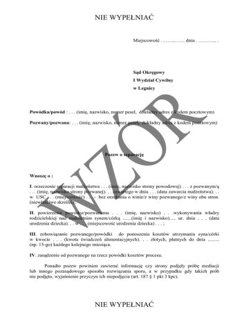 NIE WYPEŁNIAĆ Miejscowość ……...…… dnia . ……….. . Sąd Okręgowy I Wydział Cywilny w Legnicy Powódka/powód : . . . (imię, nazwisko, numer pesel, dokładny adres z kodem pocztowym) Pozwany/pozwana: . . . (imię, nazwisko, numer pesel, dokładny adres z kodem pocztowym) Pozew o separację Wnoszę o : I. orzeczenie separacji małżeństwa . . . (imię, nazwisko strony powodowej) . . . z pozwanym/ą . . . (imię, nazwisko strony pozwanej). . . zawartego w dniu . . . (data zawarcia małżeństwa). . . w USC . . . (miejscowość) . . . - bez orzekania o winie/z winy pozwanego/z winy obu stron. (niewłaściwe skreślić); II. powierzenie powódce/pozwanemu . . . (imię, nazwisko) . . .wykonywania władzy rodzicielskiej nad małoletnim synem/córką .......(imię i nazwisko)..... ur. dnia . . . (data urodzenia dziecka). . . w . . . (miejscowość urodzenia dziecka) . . . ; III. zobowiązanie pozwanego/powódki do ponoszenia kosztów utrzymania syna/córki w kwocie . . . (kwota świadczeń alimentacyjnych). . . złotych, płatnych do dnia ......... (np. 15-go) każdego kolejnego miesiąca. IV. zasądzenie od pozwanego na rzecz powódki kosztów procesu. Ponadto pozew powinien zawierać informację czy strony podjęły próbę mediacji lub innego pozasądowego sposobu rozwiązania sporu, a w przypadku gdy takich prób nie podjęto, wyjaśnienie przyczyn ich niepodjęcia (art. 187 § 1 pkt 3 kpc). NIE WYPEŁNIAĆ NIE WYPEŁNIAĆ Uzasadnienie ............................................................................ własnymi słowami należy opisać przebieg wydarzeń i przyczyny wystąpienia o separację (własnoręczny podpis strony powodowej) Załączniki: - odpis pozwu, - odpis skrócony aktu małżeństwa (aktualny – 3 miesiące od wystawienia), - odpisy skrócone aktów urodzenia małoletnich dzieci, - zaświadczenie o wysokości dochodów z 3 ostatnich miesięcy. Pozew o separację powinien zostać złożony w formie pisemnej w wydziale cywilnym sądu okręgowego (w dwóch egzemplarzach), w którego okręgu małżonkowie mieli ostatnie wspólne zamieszanie, jeżeli choć jedno z nich w tym okręgu nadal stale przebywa, zaś w przypadku braku takiej podstawy, właściwy jest sąd okręgowy miejsca zamieszkania strony pozwanej, a gdy i ta okoliczność nie jest spełniona, to wówczas właściwość sądu określa się na podstawie miejsca zamieszkania strony powodowej. Opłata stała od pozwu wynosi 600 zł. Uiszcza się ją przez naklejenie na pozew znaków opłaty sądowej (do nabycia kasie sądu) lub wpłacając na konto Sądu Okręgowego w Legnicy. Możliwe jest także złożenie wniosku o separację pod warunkiem, że strony nie posiadają małoletnich dzieci i chcą zgodnie wystąpić o separację. Na wniosku takim małżonkowie razem składają podpisy. Opłata od wniosku o separację wynosi 100 zł. Pozew czy wniosek o separację należy złożyć w biurze podawczym Sądu Okręgowego – pokój 21 lub przesłać na adres Sądu Okręgowego w Legnicy. NIE WYPEŁNIAĆ