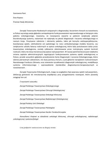Szanowna Pani Ewa Kopacz Premier Rady Ministrów Zarządy Towarzystw Naukowych związanych z diagnostyką i leczeniem chorych na nowotwory w Polsce wyrażają swoje głębokie zaniepokojenie funkcjonowaniem wprowadzonego w bieżącym roku pakietu onkologicznego. Uważamy, że rozwiązania zawarte w pakiecie zwiększyły jedynie biurokratyzację systemu, natomiast nie wpłynęły na jakość diagnostyki i leczenia onkologicznego w naszym kraju. Pozytywne założenia i elementy pakietu, takie jak konsylia wielospecjalistyczne, koordynacja opieki, odchodzenie od szpitalnego na rzecz ambulatoryjnego modelu leczenia, czy zwiększenie udziału lekarzy rodzinnych w opiece onkologicznej, które były postulowane także przez towarzystwa onkologiczne, zostały całkowicie zdominowane przez restrykcyjny system kontroli rozliczeń, który nie służy merytorycznej opiece nad pacjentem. W naszej opinii konieczna jest radykalna zmiana zapisów administracyjnych regulujących funkcjonowanie systemu opieki onkologicznej w Polsce, przede wszystkim głębokie przeobrażenie Karty Diagnostyki i Leczenia Onkologicznego, która wbrew pierwotnym założeniom, nie służy pomocy chorym, a jest głównie narzędziem rozliczeniowym Narodowego Funduszu Zdrowia, oraz zniesienie ryczałtowości diagnostyki onkologicznej, modyfikacja systemu informatycznego i wprowadzenie standardów diagnostyczno-terapeutycznych w nowotworach. Zarządy Towarzystw Onkologicznych, mając na względzie chęć poprawy opieki nad pacjentem, deklarują gotowość do merytorycznej współpracy przy przygotowaniu rozwiązań, które pozwolą osiągnąć ten cel. Z wyrazami szacunku Zarząd Polskiego Towarzystwa Onkologicznego Zarząd Polskiego Towarzystwa Chirurgii Onkologicznej Zarząd Polskiego Towarzystwa Onkologii Klinicznej Zarząd Polskiego Towarzystwa Radioterapii Onkologicznej Zarząd Polskiej Unii Onkologii Zarząd Polskiego Towarzystwa Patologów Zarząd Polskiego Towarzystwa Kardio-Torakochirurgów Konsultanci Krajowi w dziedzinie onkologii klinicznej, chirurgii onkologicznej, radioterapii onkologicznej i patomorfologii Listę podpisów zamieszczono na drugiej stronie Szanowny Pan Bartosz Arłukowicz Minister Zdrowia Zarządy Towarzystw Naukowych związanych z diagnostyką i leczeniem chorych na nowotwory w Polsce wyrażają swoje głębokie zaniepokojenie funkcjonowaniem wprowadzonego w bieżącym roku pakietu onkologicznego. Uważamy, że rozwiązania zawarte w pakiecie zwiększyły jedynie biurokratyzację systemu, natomiast nie wpłynęły na jakość diagnostyki i leczenia onkologicznego w naszym kraju. Pozytywne założenia i elementy pakietu, takie jak konsylia wielospecjalistyczne, koordynacja opieki, odchodzenie od szpitalnego na rzecz ambulatoryjnego modelu leczenia, czy zwiększenie udziału lekarzy rodzinnych w opiece onkologicznej, które były postulowane także przez towarzystwa onkologiczne, zostały całkowicie zdominowane przez restrykcyjny system kontroli rozliczeń, który nie służy merytorycznej opiece nad pacjentem. W naszej opinii konieczna jest radykalna zmiana zapisów administracyjnych regulujących funkcjonowanie systemu opieki onkologicznej w Polsce, przede wszystkim głębokie przeobrażenie Karty Diagnostyki i Leczenia Onkologicznego, która wbrew pierwotnym założeniom, nie służy pomocy chorym, a jest głównie narzędziem rozliczeniowym Narodowego Funduszu Zdrowia, oraz zniesienie ryczałtowości diagnostyki onkologicznej, modyfikacja systemu informatycznego i wprowadzenie standardów diagnostyczno-terapeutycznych w nowotworach. Zarządy Towarzystw Onkologicznych, mając na względzie chęć poprawy opieki nad pacjentem, deklarują gotowość do merytorycznej współpracy przy przygotowaniu rozwiązań, które pozwolą osiągnąć ten cel. Z wyrazami szacunku Zarząd Polskiego Towarzystwa Onkologicznego Zarząd Polskiego Towarzystwa Chirurgii Onkologicznej Zarząd Polskiego Towarzystwa Onkologii Klinicznej Zarząd Polskiego Towarzystwa Radioterapii Onkologicznej Zarząd Polskiej Unii Onkologii Zarząd Polskiego Towarzystwa Patologów Zarząd Polskiego Towarzystwa Kardio-Torakochirurgów Konsultanci Krajowi w dziedzinie onkologii klinicznej, chirurgii onkologicznej, radioterapii onkologicznej i patomorfologii Listę podpisów zamieszczono na drugiej stronie Szanowny Pan Tadeusz Jędrzejczyk Prezes Narodowego Funduszu Zdrowia Zarządy Towarzystw Naukowych związanych z diagnostyką i leczeniem chorych na nowotwory w Polsce wyrażają swoje głębokie zaniepokojenie funkcjonowaniem wprowadzonego w bieżącym roku pakietu onkologicznego. Uważamy, że rozwiązania zawarte w pakiecie zwiększyły jedynie biurokratyzację systemu, natomiast nie wpłynęły na jakość diagnostyki i leczenia onkologicznego w naszym kraju. Pozytywne założenia i elementy pakietu, takie jak konsylia wielospecjalistyczne, koordynacja opieki, odchodzenie od szpitalnego na rzecz ambulatoryjnego modelu leczenia, czy zwiększenie udziału lekarzy rodzinnych w opiece onkologicznej, które były postulowane także przez towarzystwa onkologiczne, zostały całkowicie zdominowane przez restrykcyjny system kontroli rozliczeń, który nie służy merytorycznej opiece nad pacjentem. W naszej opinii konieczna jest radykalna zmiana zapisów administracyjnych regulujących funkcjonowanie systemu opieki onkologicznej w Polsce, przede wszystkim głębokie przeobrażenie Karty Diagnostyki i Leczenia Onkologicznego, która wbrew pierwotnym założeniom, nie służy pomocy chorym, a jest głównie narzędziem rozliczeniowym Narodowego Funduszu Zdrowia, oraz zniesienie ryczałtowości diagnostyki onkologicznej, modyfikacja systemu informatycznego i wprowadzenie standardów diagnostyczno-terapeutycznych w nowotworach. Zarządy Towarzystw Onkologicznych, mając na względzie chęć poprawy opieki nad pacjentem, deklarują gotowość do merytorycznej współpracy przy przygotowaniu rozwiązań, które pozwolą osiągnąć ten cel. Z wyraza