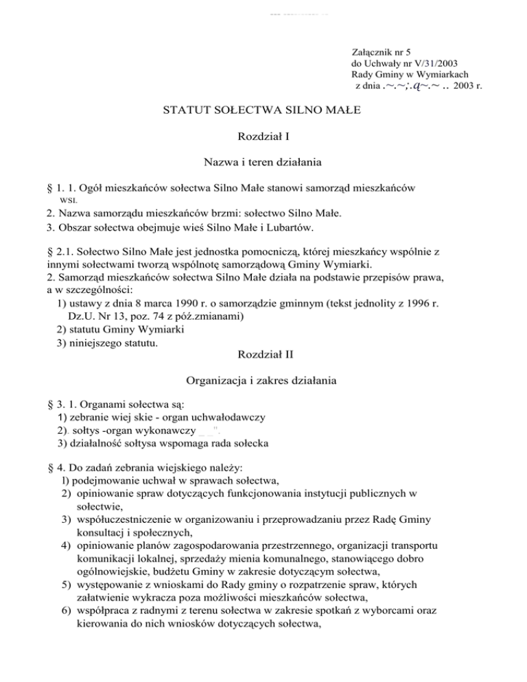 --- ---------- -- Załącznik nr 5 do Uchwały nr V/31/2003 Rady Gminy w Wymiarkach z dnia .~.~;.ą~.~ .. 2003 r. STATUT SOŁECTWA SILNO MAŁE Rozdział I Nazwa i teren działania § 1. 1. Ogół mieszkańców sołectwa Silno Małe stanowi samorząd mieszkańców WSI. 2. Nazwa samorządu mieszkańców brzmi: sołectwo Silno Małe. 3. Obszar sołectwa obejmuje wieś Silno Małe i Lubartów. § 2.1. Sołectwo Silno Małe jest jednostka pomocniczą, której mieszkańcy wspólnie z innymi sołectwami tworzą wspólnotę samorządową Gminy Wymiarki. 2. Samorząd mieszkańców sołectwa Silno Małe działa na podstawie przepisów prawa, a w szczególności: 1) ustawy z dnia 8 marca 1990 r. o samorządzie gminnym (tekst jednolity z 1996 r. Dz.U. Nr 13, poz. 74 z póź.zmianami) 2) statutu Gminy Wymiarki 3) niniejszego statutu. Rozdział II Organizacja i zakres działania § 3. 1. Organami sołectwa są: 1) zebranie wiej skie - organ uchwałodawczy 2). sołtys -organ wykonawczy _ _". 3) działalność sołtysa wspomaga rada sołecka § 4. Do zadań zebrania wiejskiego należy: l) podejmowanie uchwał w sprawach sołectwa, 2) opiniowanie spraw dotyczących funkcjonowania instytucji publicznych w sołectwie, 3) współuczestniczenie w organizowaniu i przeprowadzaniu przez Radę Gminy konsultacj i społecznych, 4) opiniowanie planów zagospodarowania przestrzennego, organizacji transportu komunikacji lokalnej, sprzedaży mienia komunalnego, stanowiącego dobro ogólnowiejskie, budżetu Gminy w zakresie dotyczącym sołectwa, 5) występowanie z wnioskami do Rady gminy o rozpatrzenie spraw, których załatwienie wykracza poza możliwości mieszkańców sołectwa, 6) współpraca z radnymi z terenu sołectwa w zakresie spotkań z wyborcami oraz kierowania do nich wniosków dotyczących sołectwa, -27) udział poprzez swoich przedstawicieli w postępowaniu administracyjnym na zasadach ustalonych dla organizacji społecznych, jeżeli jest to uzasadnione celami statutowymi samorządu i gdy przemawia za tym interes społeczny mieszkańców sołectwa, 8) wybór sołtysa, rady sołeckiej, 9) opiniowanie statutu sołectwa, l Ojprzyjmowanie sprawozdań z działalności prowadzonej przez sołtysa, 11) zarządzanie mieniem gminnym przekazanym do użytkowania. Rozdział III Sołtys, rada sołecka § 5. 1. Kadencja sołtysa i rady sołeckiej wybranych przez zebranie wiejskie trwa ~ cztery lata od daty wyborów. 2. Działalność sołtysa i rady sołeckiej ma charakter społeczny. § 6. Do obowiązków sołtysa należy w szczególności: 1) zwoływanie zebrań wiejskich, 2) zwoływanie posiedzeń rady sołeckiej i przewodniczenie jej obradom, 3) działanie stosownie do wskazań zebrania wiejskiego, 4) wykorzystywanie aktywności mieszkańców służącej poprawie warunków życia w sołectwie, 5) reprezentowanie mieszkańców sołectwa na zewnątrz, 6) uczestniczenie w naradach sołtysów 7) wykonywanie powierzonych zadań z zakresu administracji publicznej zgodnie z obowiązującymi przepisami prawa, 8) potwierdzanie okoliczności, których przy załatwianiu spraw przez mieszkańców wymagają i dopuszczają przepisy prawa, \ 9) sporządzanie sprawozdań z działalności sołectwa, 10) prowadzenie dokumentacji zawierającej m.in. statut sołectwa, protokoły z zebrań wiejskich oraz korespondencję dotyczącą sołectwa. Przekazywanie protokołów i ustaleń zebrań wiejskich do Urzędu Gminy. § 7. 1. Przy wykonywaniu swoich zdań sołtys współdziała z rada sołecką, która składa się z 5 osób (razem z sołtysem). 2. Do obowiązków rady sołeckiej należy wspomaganie pracy sołtysa. Rada sołecka ma charakter opiniodawczy, doradczy i inicjatywny. 3. Posiedzenia rady sołeckiej odbywają się w miarę potrzeb, nie rzadziej jednak niż raz w kwartale. Posiedzeniom przewodniczy sołtys. 4. Radny z sołectwa powinien być zapraszany na posiedzenia rady sołeckiej. -3- 5. Rada sołecka pełni rolę stałego komitetu czynów społecznych. Zebranie wiejskie może ustalić inny skład tego komitetu. 6. Rada sołecka w szczególności: 1) opracowuje i przedkłada na zebraniu wiejskim projekty programów działania samorządu, 2) organizuje wykonanie uchwał zebrania wiejskiego oraz kontroluje ich realizację, 3)współdziała z organizacjami społecznymi w celu wspólnej realizacji zadań. § 8. 1. Komisja Rewizyjna Rady Gminy kontroluje działalność sołectwa, a w szczególności: 1) działalność rady sołeckiej i sołtysa oraz gospodarkę powierzonym rmeruem, 2) w razie stwierdzenia niezgodności z prawem lub niegospodarności w zarządzaniu powierzonym mieniem Komisja Rewizyjna niezwłocznie zawiadamia o tym Wójta Gminy, 3) kompleksową kontrolę działalności rady sołeckiej i sołtysa, Komisja Rewizyjna przeprowadza wyłącznie na zlecenie zebrania wiejskiego lub Wójta Gminy. 4) Sołtys zobowiązany jest udostępnić Komisji Rewizyjnej wszelkie materiały i udzielać wyjaśnień dotyczących przedmiotu kontroli. Rozdział IV Zasady i tryb zwoływaniazebrańwiejskich oraz warunki ważności podejmowanych uchwał § 9. Prawo do udziału w zebraniu wiejskim mają wszyscy mieszkańcy sołectwa stale w nim zamieszkujący. § 10. 1. Zebranie wiejskie zwołuje sołtys: 1) z własnej inicjatywy, 2) z inicj atywy rady sołeckiej, , 3) na pisemny wniosek co najmniej 1/5 mieszkańców uprawnionych do udziału w zebraniu, 4) na wniosek Wójta Gminy lub Rady Gminy. 2. Zebranie wiejskie może także zwołać Wójt Gminy, w razie nie wykonania tej czynności przez sołtysa, w terminie 14 dni od zgłoszenia wniosku w tej sprawie. 3. Odrębne zasady i tryb zwoływania zebrań wyborczych określa się w rozdziale V statutu. -4§ 11. 1. Zebranie wiejskie odbywa się w miarę istniejących potrzeb, jednak nie rzadziej niż dwa razy do roku. 2. Termin i miejsce zebrania wiejskiego podaje się do wiadomości publicznej w sposób zwyczajowo przyjęty tj. poprzez wywieszenie na tablicy ogłoszeń lub przekazywanie listy - z