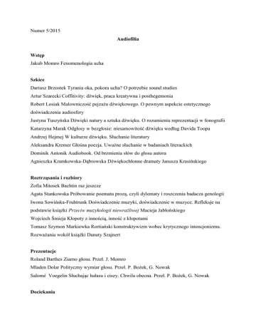Numer 5/2015 Audiofilia Wstęp Jakub Momro Fenomenologia ucha Szkice Dariusz Brzostek Tyrania oka, pokora ucha? O potrzebie sound studies Artur Szarecki Coffitivity: dźwięk, praca kreatywna i posthegemonia Robert Losiak Malowniczość pejzażu dźwiękowego. O pewnym aspekcie estetycznego doświadczenia audiosfery Justyna Tuszyńska Dźwięki natury a sztuka dźwięku. O rozumieniu reprezentacji w fonografii Katarzyna Marak Odgłosy w bezgłosie: niesamowitość dźwięku według Davida Toopa Andrzej Hejmej W kulturze dźwięku. Słuchanie literatury Aleksandra Kremer Głośna poezja. Uważne słuchanie w badaniach literackich Dominik Antonik Audiobook. Od brzmienia słów do głosu autora Agnieszka Kramkowska-Dąbrowska Dźwiękochłonne dramaty Janusza Krasińskiego Roztrząsania i rozbiory Zofia Mitosek Bachtin raz jeszcze Agata Stankowska Próbowanie poematu prozą, czyli dylematy i roszczenia badacza genologii Iwona Sowińska-Fruhtrunk Doświadczenie muzyki, doświadczenie w muzyce. Refleksje na podstawie książki Przeciw muzykologii niewrażliwej Macieja Jabłońskiego Wojciech Śmieja Kłopoty z innością, inność z kłopotami Tomasz Szymon Markiewka Rortiański konstruktywizm wobec krytycznego intencjonizmu. Rozważania wokół książki Danuty Szajnert Prezentacje Roland Barthes Ziarno głosu. Przeł. J. Momro Mladen Dolar Polityczny wymiar głosu. Przeł. P. Bożek, G. Nowak Salomé Voegelin Słuchając hałasu i ciszy. Chwila obecna. Przeł. P. Bożek, G. Nowak Dociekania Małgorzata Mikołajczak Między mimikrą a rebelią. Pejzaż (post)kolonialny regionalnej literatury Anna Nasiłowska Geografia literatury polskiej: rozpoznawanie Wschodu Kamila Gieba Próba epopei. O narracjach założycielskich tzw. Ziem Odzyskanych Glossy Wojciech Ryczek Politropia: retoryka Odyseusza Elżbieta Zarych Nocna rozmowa – nokturn w muzyce, literaturze i malarstwie romantyzmu Paweł Zajas Barbarzyńca w ogrodzie Suhrkampa. Zbigniew Herbert i jego niemiecki wydawca