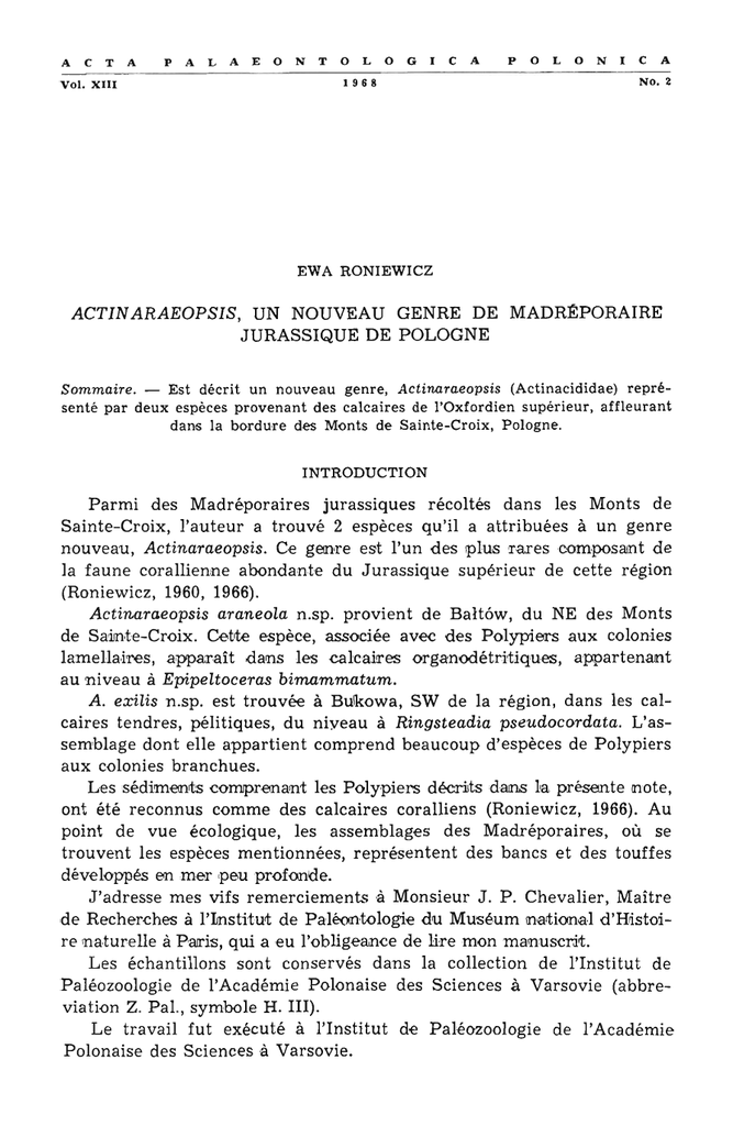 ACT Vol. XIII A PAL A EON T 0 LOG 1 C 1968 A POLONICA No. 2 EWA RONIEWICZ ACTINARAEOPSIS, UN NOUVEAU GENRE DE MADRÉPORAIRE JURASSIQUE DE POLOGNE Sommaire. - Est décrit un nouveau genre, Actinaraeopsis (Actinacididae) représenté par deux espèces provenant des calcaires de l'Oxfordien supérieur, affleurant dans lia bordure des Monts de Sainte-Croix, Pologne. INTRODUCTION Parmi des Madréporaires jurassiques récoltés dans les Monts de Sainte-Croix, l'auteur a trouvé 2 espèces qu'il a attribuées à un genre nouveau, Actinaraeopsis. Ce genre est l'un des plus rares oomposant de la faune corallienne abondante du Jurassique supérieur de cette région (Roniewicz, 1960, 1966). Actinaraeopsis araneola n.sp. provient de Balt6w, du NE des Monts de Sa'Ï!nte-Croix. Gette espèce, associée avec des Polypiers aux colonies lamellah'€s, appa:raît dans les calcaires organodétrHiques, appartenant au niveau à Epipeltoceras bimammatum. A. exilis n.sp. est trouvée à Bulkowa, SW de la région, dans les calcaires tendres, pélitiques, du niveau à Ringsteadia pseudocordata. L'assemblage dont elle appartient comprend beaucoup d'espèces de Polypiers aux colonies branchues. Les sédiments comprenant les Polypiers décrits dams lia présente note, ont été reconnus comme des calcaires coralliens (Roniewicz, 1966). Au point de vue écologique, les assemblages des Madréporaires, où se trouvent les espèces mentionnées, représentent des bancs et des touffes développés en mer peu profonde. J'adresse mes vifs remerciements à Monsieur J. P. Chevalier, Maître de Recherches à l'Lnstitut de Paléontologie du Muséum na'tional d'mstoire na,turelle à Parr-is, qui aeu l'obligeance de lke mon manuscrit. Les échantillons sont conservés dans la collection de l'Institut de Paléozoologie de l'Académie Polonaise des Sciences à Varsovie (abbreviation Z. Pal., symbole H. III). Le travail fut exécuté à l'Institut de Paléozoologie de l'Académie Polonaise des Sciences à Varsovie. EWA RONIEWICZ 306 DESCRIPTIONS Sous-ordre Fungiida Duncan, 1884 Famille Actinacididae Vaughan & Wells, 1943 Genre Actina."aeopsis n.gen. Species typica: Acti111araeopsis araneola n.sp. Derivatio nominis: Actinaraeopsis - ressemblant au genre Actinaraea d'Orbigny. Diagnose. - Polypier thamnasterioïde. Calices peu circonstricts, à fossette axiale peu profonde. Costoseptes en lames régulièrement per- forées, radialement disposées. Ceux, qui relient les centres calicinaux, sont confluents, les autres sont nonconfluents, s'attachant aux faces latérales des p~'emiers, ou génicul:és. Les septes sont coalescents au centre; leur bord axial armé de dents arrondies; leur bord interne est pourvu de lobes trabéculaires. Columelle pariétale, formée de trabécules peu nombreuses, souvent soudées aux septes. Muraille nulle. Synapticules peu nom:breuses, situées en dehors des calices. Traverses en forme de dissépiments tabuloïdes, étendus, régulièrement disposés, traversant de nombreux individus. Bourgeonnement intratentaculaire. Trabécules fines, composées de sc1érodermites peu reconnaissables dans l'ornementation des faces latérales des septes. Le genre renferme les espèces A. araneola n.sp. et A. exilis n.sp. Remarques. - Vu le type de porosité du squelette, Actinaraeopsis n.gen. se range dans la famille des Actinacididae, comprenant les genres suivants: Aotinacis d'OI'ibigny, Elephantaria Oppenheim, Actinaraea d'Orbigny et Dendr,ar,aea d'OI'ibigny (Alloiteau, 1952). À cause du type thamnastérioïde de la colonie, ce genre présente une grande affinité avec Actinaraea. Il s'en distingue par la structure des éléments radiaires qui sont des lames continues, tandis que chez Actinaraea elles présent€nt dans leur partie costale une dissociation en trabécules. Par le type thamnastérioïde de la colonie, Actirz,araeopsis n.gen. se distingue d'Actinacis et d'Elephantaria dont la partie extracalicinale de la colonie est développée 'comme UIIl coonoolchyme (Allodteau, 1958; Oppe!l1heim, 1930). La différence entr€ Actinaraeopsis n.gen. et Dendraraea, genre d'ailleurs peu connu, est basée sur l'épaisseur des trabécules considérablement plus grande et leur arrangement très lâche chez ce dernier. Répartition. - Pologne: bordure mésozoïque des Monts de SainteCroix, Oxfordien supérieur. Actinaraeopsis araneola n.sp. (Pl. l, Fig. 1) Holotypus: Z. Pal. No. H. 111/666; Pl. l, Fig. 1. Stratum typicum: Oxfordien supérieur, niveau à .EpipeHoceras bimammatum. ACTINARAEOPSIS N. GEN. (MADREPORAIRE) Locus typicus: Baltow, Pologne. Derivatio nominis: Lat. araneola septes sur la surface calicifère. = 307 toile d'araignée; à cause de fin dessin des Diagnose. - Polypier massif; distance entre les centres calicinaux de 3-6 mm; costoseptes au nombre d'environ 40-50; trav:erses à densité 15--20 sur 5 mm; diamètre de trabécules: 100-140 flo. Matériel. - 1 fragment de colonie, 5 lames minces. Dimensions: Distance entre centres calicinaux Densité de traverses Nombre de costoseptes 3,5-6 mm 16-18/5 mm 37-53 Description. - Polypier massif à surface supeneure plane, limitée d'abruptes surfaces latérales. Calices disposés sans ordre, assez serrés. Lescostoseptes dans leur partie septale et costale ont la même structure. Souvent les septes plus courts se soudent à la face latérale des plus longs. Columelle faible. Dans les calices les lobes traibéculaires ressemblent aux pali. Traverses nombreuses et fortes. Bourgeonnement intratentaculaire (Pl. l, Fig. 1). Affinités. - A. araneola n. sp. s'apparente à A. exilis n. sp. par l'arrangement et le nombre de septes. Elle s'en distingue par la plus grande dimension de ses trabécules et de ses polypiérites et par le développement uniforme de ces dérniers dans la colonie. Répartition. - Pologne: Balt6w, Oxfordien supérieur. Actinaraeopsis exilis Ill. sp. (Pl. l, Fig. 1,2) Holotypus: Z. Pal. No. H. 111/398; Pl. 1, Fig. 1. Stratum typicum: Oxfordien supér