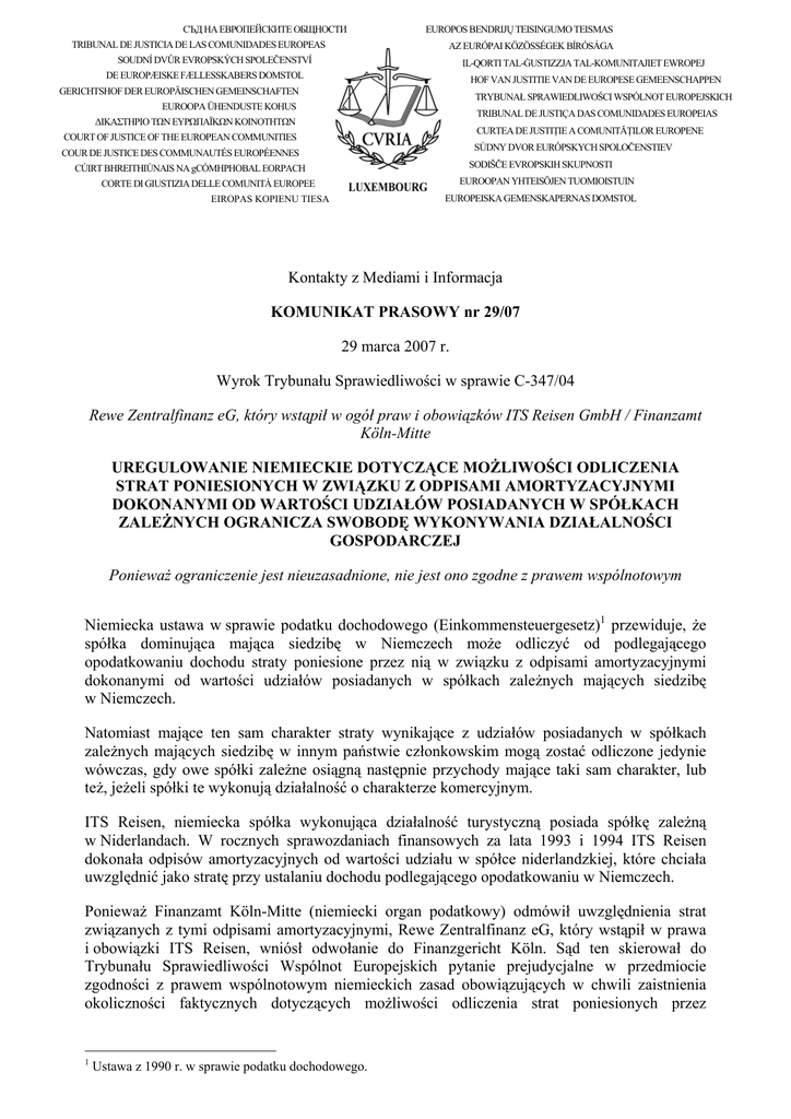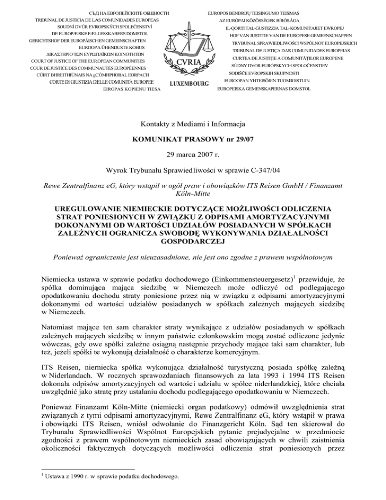 СЪД НА ЕВРОПЕЙСКИТЕ ОБЩНОСТИ TRIBUNAL DE JUSTICIA DE LAS COMUNIDADES EUROPEAS EUROPOS BENDRIJŲ TEISINGUMO TEISMAS AZ EURÓPAI KÖZÖSSÉGEK BÍRÓSÁGA SOUDNÍ DVŮR EVROPSKÝCH SPOLEČENSTVÍ IL-QORTI TAL-ĠUSTIZZJA TAL-KOMUNITAJIET EWROPEJ DE EUROPÆISKE FÆLLESSKABERS DOMSTOL HOF VAN JUSTITIE VAN DE EUROPESE GEMEENSCHAPPEN GERICHTSHOF DER EUROPÄISCHEN GEMEINSCHAFTEN TRYBUNAŁ SPRAWIEDLIWOŚCI WSPÓLNOT EUROPEJSKICH EUROOPA ÜHENDUSTE KOHUS TRIBUNAL DE JUSTIÇA DAS COMUNIDADES EUROPEIAS ∆ΙΚΑΣΤΗΡΙΟ ΤΩΝ ΕΥΡΩΠΑΪΚΩΝ ΚΟΙΝΟΤΗΤΩΝ CURTEA DE JUSTIŢIE A COMUNITĂŢILOR EUROPENE COURT OF JUSTICE OF THE EUROPEAN COMMUNITIES SÚDNY DVOR EURÓPSKYCH SPOLOČENSTIEV COUR DE JUSTICE DES COMMUNAUTÉS EUROPÉENNES SODIŠČE EVROPSKIH SKUPNOSTI CÚIRT BHREITHIÚNAIS NA gCÓMHPHOBAL EORPACH EUROOPAN YHTEISÖJEN TUOMIOISTUIN CORTE DI GIUSTIZIA DELLE COMUNITÀ EUROPEE EUROPEISKA GEMENSKAPERNAS DOMSTOL EIROPAS KOPIENU TIESA Kontakty z Mediami i Informacja KOMUNIKAT PRASOWY nr 29/07 29 marca 2007 r. Wyrok Trybunału Sprawiedliwości w sprawie C-347/04 Rewe Zentralfinanz eG, który wstąpił w ogół praw i obowiązków ITS Reisen GmbH / Finanzamt Köln-Mitte UREGULOWANIE NIEMIECKIE DOTYCZĄCE MOŻLIWOŚCI ODLICZENIA STRAT PONIESIONYCH W ZWIĄZKU Z ODPISAMI AMORTYZACYJNYMI DOKONANYMI OD WARTOŚCI UDZIAŁÓW POSIADANYCH W SPÓŁKACH ZALEŻNYCH OGRANICZA SWOBODĘ WYKONYWANIA DZIAŁALNOŚCI GOSPODARCZEJ Ponieważ ograniczenie jest nieuzasadnione, nie jest ono zgodne z prawem wspólnotowym Niemiecka ustawa w sprawie podatku dochodowego (Einkommensteuergesetz)1 przewiduje, że spółka dominująca mająca siedzibę w Niemczech może odliczyć od podlegającego opodatkowaniu dochodu straty poniesione przez nią w związku z odpisami amortyzacyjnymi dokonanymi od wartości udziałów posiadanych w spółkach zależnych mających siedzibę w Niemczech. Natomiast mające ten sam charakter straty wynikające z udziałów posiadanych w spółkach zależnych mających siedzibę w innym państwie członkowskim mogą zostać odliczone jedynie wówczas, gdy owe spółki zależne osiągną następnie przychody mające taki sam charakter, lub też, jeżeli spółki te wykonują działalność o charakterze komercyjnym. ITS Reisen, niemiecka spółka wykonująca działalność turystyczną posiada spółkę zależną w Niderlandach. W rocznych sprawozdaniach finansowych za lata 1993 i 1994 ITS Reisen dokonała odpisów amortyzacyjnych od wartości udziału w spółce niderlandzkiej, które chciała uwzględnić jako stratę przy ustalaniu dochodu podlegającego opodatkowaniu w Niemczech. Ponieważ Finanzamt Köln-Mitte (niemiecki organ podatkowy) odmówił uwzględnienia strat związanych z tymi odpisami amortyzacyjnymi, Rewe Zentralfinanz eG, który wstąpił w prawa i obowiązki ITS Reisen, wniósł odwołanie do Finanzgericht Köln. Sąd ten skierował do Trybunału Sprawiedliwości Wspólnot Europejskich pytanie prejudycjalne w przedmiocie zgodności z prawem wspólnotowym niemieckich zasad obowiązujących w chwili zaistnienia okoliczności faktycznych dotyczących możliwości odliczenia strat poniesionych przez 1 Ustawa z 1990 r. w sprawie podatku dochodowego. niemieckie spółki dominujące w związku z odpisami amortyzacyjnymi dokonanymi od wartości udziałów posiadanych w spółkach zależnych. W ogłoszonym dziś wyroku Trybunał Sprawiedliwości stwierdza w pierwszej kolejności, iż uregulowanie niemieckie stanowi ograniczenie swobody wykonywania działalności gospodarczej. W rzeczywistości bowiem uregulowanie to wprowadza odmienne traktowanie pod względem podatkowym spółek dominujących w zależności od tego, czy strata wynika z odpisów amortyzacyjnych od wartości udziałów posiadanych w spółce zależnej będącej rezydentem, czy w spółce zależnej niebędącej rezydentem. Tym samym zniechęca ono te spółki do tworzenia spółek zależnych w innych państwach członkowskich. Następnie Trybunał rozważa, czy owo ograniczenie jest uzasadnione. Trybunał zauważa w szczególności, że odmienne traktowanie pod względem podatkowym spółek dominujących będących rezydentami w zależności od tego, czy posiadają spółki zależne za granicą, czy też nie, nie może być uzasadnione jedynie tym, że postanowiły one wykonywać działalność gospodarczą w innym państwie członkowskim, w którym państwo, którego spółka jest rezydentem, nie może wykonywać swojej kompetencji podatkowej. Ponadto Trybunał odrzuca argument rządu niemieckiego dotyczący ryzyka podwójnego uwzględnienia strat poniesionych za granicą. Zauważa on, że sporne straty, jako straty poniesione przez spółkę dominująca, są uwzględniane jedynie w odniesieniu do niej, co oznacza, że odmienny sposób uwzględnienia, z jednej strony, strat poniesionych przez spółkę dominującą oraz, z drugiej strony, strat poniesionych przez zagraniczne spółki zależne, nie może być w żadnym przypadku zakwalifikowane jako podwójne odliczanie tych samych strat. Trybunał zauważa, ze uregulowanie niemieckie, które dotyczy w sposób ogólny każdego przypadku, w którym spółki zależne mają siedzibę poza terytorium Niemiec, i które nie odpowiada tym samym wymogowi związanemu ze szczególnym celem zwalczania całkowicie sztucznych konstrukcji, nie może być uzasadniane ryzykiem unikania opodatkowania. Wreszcie Trybunał stwierdza, że w uregulowaniu niemieckim nie ma związku pomiędzy możliwością odliczenia przez spółkę dominującą będącą rezydentem strat wynikających z odpisów amortyzacyjnych od wartości udziałów posiadanych w spółkach zależnych a zwolnieniem od podatku w Niemczech, na podstawie umów o unikaniu podwójnego opodatkowania, dywidend otrzymywanych od zagranicznych spółek zależnych. W braku takiego związku argument rządu niemieckiego dotyczący konieczności zachowania spójności podatkowej nie może zostać uwzględn