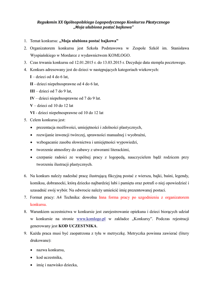 Regulamin XX Ogólnopolskiego Logopedycznego Konkursu Plastycznego „Moja ulubiona postać bajkowa” 1. Temat konkursu: „Moja ulubiona postać bajkowa” 2. Organizatorem konkursu jest Szkoła Podstawowa w Zespole Szkół im. Stanisława Wyspiańskiego w Mordarce z wydawnictwem KOMLOGO. 3. Czas trwania konkursu od 12.01.2015 r. do 13.03.2015 r. Decyduje data stempla pocztowego. 4. Konkurs adresowany jest do dzieci w następujących kategoriach wiekowych: I – dzieci od 4 do 6 lat, II - dzieci niepełnosprawne od 4 do 6 lat, III – dzieci od 7 do 9 lat, IV – dzieci niepełnosprawne od 7 do 9 lat. V – dzieci od 10 do 12 lat VI - dzieci niepełnosprawne od 10 do 12 lat 5. Celem konkursu jest: prezentacja możliwości, umiejętności i zdolności plastycznych, rozwijanie inwencji twórczej, sprawności manualnej i wyobraźni, wzbogacanie zasobu słownictwa i umiejętności wypowiedzi, tworzenie atmosfery do zabawy z utworami literackimi, czerpanie radości ze wspólnej pracy z logopedą, nauczycielem bądź rodzicem przy tworzeniu ilustracji plastycznych. 6. Na konkurs należy nadesłać pracę ilustrującą fikcyjną postać z wiersza, bajki, baśni, legendy, komiksu, dobranocki, którą dziecko najbardziej lubi i pamięta oraz potrafi o niej opowiedzieć i uzasadnić swój wybór. Na odwrocie należy umieścić imię prezentowanej postaci. 7. Format pracy: A4 Technika: dowolna Inna forma pracy po uzgodnieniu z organizatorem konkursu. 8. Warunkiem uczestnictwa w konkursie jest zarejestrowanie opiekuna i dzieci biorących udział w konkursie na stronie www.komlogo.pl w zakładce „Konkursy”. Podczas rejestracji generowany jest KOD UCZESTNIKA. 9. Każda praca musi być zaopatrzona z tyłu w metryczkę. Metryczka powinna zawierać (litery drukowane): nazwa konkursu, kod uczestnika, imię i nazwisko dziecka, wiek, numer kategorii, nazwę placówki, do której uczęszcza dziecko, imię i nazwisko opiekuna dziecka, telefon kontaktowy do opiekuna, adres e-mail opiekuna, adres opiekuna do ewentualnej wysyłki. Metryczkę można pobrać jako plik .doc lub .pdf zobacz przykład poprawnie wypełnionej metryczki pracy konkursowej WAŻNE!!! Prace bez kodu oraz bez prawidłowo i czytelnie wypełnionej metryczki nie będą podlegały ocenie. 10. Na konkurs może zgłosić osoba dorosła (rodzic, opiekun, nauczyciel, logopeda, itd.). 11. Prace powinny być wykonywane przez uczestników samodzielnie. 12. Prace należy przesłać na adres organizatora: Szkoła Podstawowa w Zespole Szkół w Mordarce Mordarka 204 34-600 Limanowa z dopiskiem: konkurs logopedyczny - Ewa Zelek, Alina Górszczyk 13. Komisja konkursowa wybierze najciekawsze prace. Od decyzji komisji nie ma odwołania. Wyłonienie zwycięzcy i ogłoszenie wyników nastąpi w ciągu 2 tygodni od ukończenia konkursu. Lista zwycięzców zostanie ogłoszona na stronie Wydawnictwa Komlogo www.komlogo.pl oraz na stronie internetowej www.zsmordarka.pl 14. Po zakończeniu konkursu prace nie będą odsyłane do uczestników i przechodzą na własność organizatora. 15. Organizator zastrzega sobie prawo do publikowania i reprodukowania prac konkursowych bez wypłacania honorariów autorskich. 16. Przewidujemy atrakcyjne nagrody dla laureatów. 17. Wszyscy uczestnicy konkursu oraz ich opiekunowie otrzymają dyplomy lub podziękowania w formie elektronicznej bądź tradycyjnej (drukowanej). 18. Biorąc udział w konkursie uczestnik potwierdza, że wyraża zgodę na wszystkie zasady zawarte w Regulaminie. 19. Regulamin może być w każdej chwili zmieniony przez Organizatora.