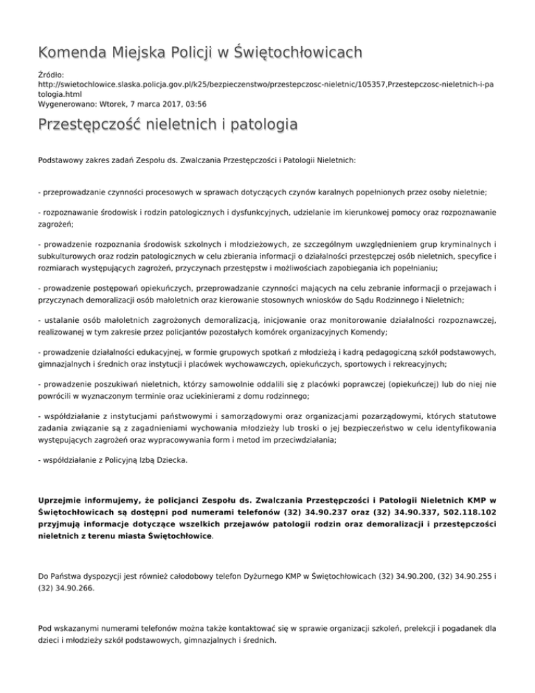 Komenda Miejska Policji w Świętochłowicach Źródło: http://swietochlowice.slaska.policja.gov.pl/k25/bezpieczenstwo/przestepczosc-nieletnic/105357,Przestepczosc-nieletnich-i-pa tologia.html Wygenerowano: Wtorek, 7 marca 2017, 03:56 Przestępczość nieletnich i patologia Podstawowy zakres zadań Zespołu ds. Zwalczania Przestępczości i Patologii Nieletnich: - przeprowadzanie czynności procesowych w sprawach dotyczących czynów karalnych popełnionych przez osoby nieletnie; - rozpoznawanie środowisk i rodzin patologicznych i dysfunkcyjnych, udzielanie im kierunkowej pomocy oraz rozpoznawanie zagrożeń; - prowadzenie rozpoznania środowisk szkolnych i młodzieżowych, ze szczególnym uwzględnieniem grup kryminalnych i subkulturowych oraz rodzin patologicznych w celu zbierania informacji o działalności przestępczej osób nieletnich, specyfice i rozmiarach występujących zagrożeń, przyczynach przestępstw i możliwościach zapobiegania ich popełnianiu; - prowadzenie postępowań opiekuńczych, przeprowadzanie czynności mających na celu zebranie informacji o przejawach i przyczynach demoralizacji osób małoletnich oraz kierowanie stosownych wniosków do Sądu Rodzinnego i Nieletnich; - ustalanie osób małoletnich zagrożonych demoralizacją, inicjowanie oraz monitorowanie działalności rozpoznawczej, realizowanej w tym zakresie przez policjantów pozostałych komórek organizacyjnych Komendy; - prowadzenie działalności edukacyjnej, w formie grupowych spotkań z młodzieżą i kadrą pedagogiczną szkół podstawowych, gimnazjalnych i średnich oraz instytucji i placówek wychowawczych, opiekuńczych, sportowych i rekreacyjnych; - prowadzenie poszukiwań nieletnich, którzy samowolnie oddalili się z placówki poprawczej (opiekuńczej) lub do niej nie powrócili w wyznaczonym terminie oraz uciekinierami z domu rodzinnego; - współdziałanie z instytucjami państwowymi i samorządowymi oraz organizacjami pozarządowymi, których statutowe zadania związanie są z zagadnieniami wychowania młodzieży lub troski o jej bezpieczeństwo w celu identyfikowania występujących zagrożeń oraz wypracowywania form i metod im przeciwdziałania; - współdziałanie z Policyjną Izbą Dziecka. Uprzejmie informujemy, że policjanci Zespołu ds. Zwalczania Przestępczości i Patologii Nieletnich KMP w Świętochłowicach są dostępni pod numerami telefonów (32) 34.90.237 oraz (32) 34.90.337, 502.118.102 przyjmują informacje dotyczące wszelkich przejawów patologii rodzin oraz demoralizacji i przestępczości nieletnich z terenu miasta Świętochłowice. Do Państwa dyspozycji jest również całodobowy telefon Dyżurnego KMP w Świętochłowicach (32) 34.90.200, (32) 34.90.255 i (32) 34.90.266. Pod wskazanymi numerami telefonów można także kontaktować się w sprawie organizacji szkoleń, prelekcji i pogadanek dla dzieci i młodzieży szkół podstawowych, gimnazjalnych i średnich. Ocena: 0/5 (0) Tweetnij
