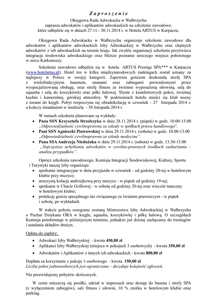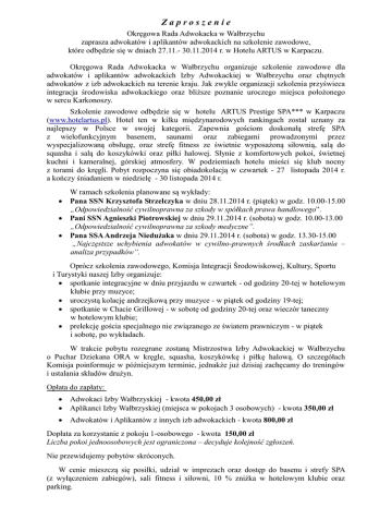 Zaproszenie Okręgowa Rada Adwokacka w Wałbrzychu zaprasza adwokatów i aplikantów adwokackich na szkolenie zawodowe, które odbędzie się w dniach 27.11.- 30.11.2014 r. w Hotelu ARTUS w Karpaczu. Okręgowa Rada Adwokacka w Wałbrzychu organizuje szkolenie zawodowe dla adwokatów i aplikantów adwokackich Izby Adwokackiej w Wałbrzychu oraz chętnych adwokatów z izb adwokackich na terenie kraju. Jak zwykle organizacji szkolenia przyświeca integracja środowiska adwokackiego oraz bliższe poznanie uroczego miejsca położonego w sercu Karkonoszy. Szkolenie zawodowe odbędzie się w hotelu ARTUS Prestige SPA*** w Karpaczu (www.hotelartus.pl). Hotel ten w kilku międzynarodowych rankingach został uznany za najlepszy w Polsce w swojej kategorii. Zapewnia gościom doskonałą strefę SPA z wielofunkcyjnym basenem, saunami oraz zabiegami prowadzonymi przez wyspecjalizowaną obsługę, oraz strefę fitness ze świetnie wyposażoną siłownią, salą do squasha i salą do koszykówki oraz piłki halowej. Słynie z komfortowych pokoi, świetnej kuchni i kameralnej, górskiej atmosfery. W podziemiach hotelu mieści się klub nocny z torami do kręgli. Pobyt rozpoczyna się obiadokolacją w czwartek - 27 listopada 2014 r. a kończy śniadaniem w niedzielę - 30 listopada 2014 r. W ramach szkolenia planowane są wykłady: Pana SSN Krzysztofa Strzelczyka w dniu 28.11.2014 r. (piątek) w godz. 10.00-15.00 „Odpowiedzialność cywilnoprawna za szkody w spółkach prawa handlowego”. Pani SSN Agnieszki Piotrowskiej w dniu 29.11.2014 r. (sobota) w godz. 10.00-13.00 „Odpowiedzialność cywilnoprawna za szkody medyczne”. Pana SSA Andrzeja Niedużaka w dniu 29.11.2014 r. (sobota) w godz. 13.30-15.00 „Najczęstsze uchybienia adwokatów w cywilno-prawnych środkach zaskarżania – analiza przypadków”. Oprócz szkolenia zawodowego, Komisja Integracji Środowiskowej, Kultury, Sportu i Turystyki naszej Izby organizuje: spotkanie integracyjne w dniu przyjazdu w czwartek - od godziny 20-tej w hotelowym klubie przy muzyce; uroczystą kolację andrzejkową przy muzyce - w piątek od godziny 19-tej; spotkanie w Chacie Grillowej - w sobotę od godziny 20-tej oraz wieczór taneczny w hotelowym klubie; prelekcję gościa specjalnego nie związanego ze światem prawniczym - w piątek i sobotę, po wykładach. W trakcie pobytu rozegrane zostaną Mistrzostwa Izby Adwokackiej w Wałbrzychu o Puchar Dziekana ORA w kręgle, squasha, koszykówkę i piłkę halową. O szczegółach Komisja poinformuje w późniejszym terminie, jednakże już dzisiaj zachęcamy do treningów i ustalania składów drużyn. Opłata do zapłaty: Adwokaci Izby Wałbrzyskiej - kwota 450,00 zł Aplikanci Izby Wałbrzyskiej (miejsca w pokojach 3 osobowych) - kwota 350,00 zł Adwokatów i Aplikantów z innych izb adwokackich - kwota 800,00 zł Dopłata za korzystanie z pokoju 1-osobowego - kwota 150,00 zł Liczba pokoi jednoosobowych jest ograniczona – decyduje kolejność zgłoszeń. Nie przewidujemy pobytów skróconych. W cenie mieszczą się posiłki, udział w imprezach oraz dostęp do basenu i strefy SPA (z wyłączeniem zabiegów), sali fitness i siłowni, 10 % zniżka w hotelowym klubie oraz parking. Informujemy, że Adwokaci i Aplikanci Izby Wałbrzyskiej korzystają z dofinansowania z funduszy: szkolenia zawodowego adwokatów oraz szkolenia aplikantów adwokackich. ORA zwalnia Adwokatów Izby Wałbrzyskiej - nie korzystających z usług hotelowych i imprez integracyjnych, z kosztów uczestnictwa w samym szkoleniu. Prosimy o nadsyłanie zgłoszeń łącznie z wpłatą w terminie do dnia 31.10.2014 r. (decyduje kolejność zgłoszeń). Rezerwacja będzie uznana za dokonaną tylko w przypadku uiszczenia wpłaty. W przypadku wyczerpania miejsc w hotelu Artus zastrzegamy możliwość zakwaterowania w obiektach położonych w pobliżu hotelu. W ramach realizacji obowiązku doskonalenia zawodowego adwokatów uczestnictwo w szkoleniu umożliwi otrzymanie 12 punktów. W załączeniu: formularz zgłoszenia Przewodniczący Komisji Doskonalenia Zawodowego i Kierownik Szkolenia Aplikantów Adwokackich Przewodniczący Komisji Integracji Środowiskowej Kultury, Sportu i Turystyki Dziekan Okręgowej Rady Adwokackiej w Wałbrzychu Adw. Marek Olejnik Adw. Bartosz Łuć Adw. Wojciech Biegański