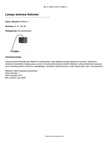 Lampa stołowa Delicate http://www.futurefurniture.pl/pl/offer/meble/lampa-stolowa-delicate.html/ Cena: 369.00 zł 339.00 zł Wymiary: S: 51 | W: 55 Dostępność: Na zamówienie Charakterystyka: Lampa stołowa Delicate jest idealnym rozwiązaniem, gdy spędzasz długie godziny przy biurku. Zapewnia właściwe oświetlenie miejsca pracy, przez co dłużej zachowujesz ostrość widzenia. Lampa doskonale wpasuje się w aranżację salonu lub biura, współgrając z wnętrzem wykończonym w stylu klasycznym, jak i nowoczesnym. Materiał: metal malowany proszkowo Ilość żarówek: 1 Gwint żarówki: E27 Moc żarówki max: 60W http://www.futurefurniture.pl Dostępne wersje produktu: nazwa produktu Lampa stołowa Delicate warianty kolor brązowy cena 369.00zł 339.00zł http://www.futurefurniture.pl dostępne Na zamówienie Zdjęcia produktu: http://www.futurefurniture.pl Powered by TCPDF (www.tcpdf.org)