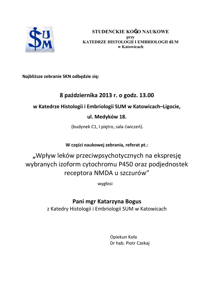 STUDENCKIE KOŁO NAUKOWE przy KATEDRZE HISTOLOGII I EMBRIOLOGII ŚUM w Katowicach Najbliższe zebranie SKN odbędzie się: 8 października 2013 r. o godz. 13.00 w Katedrze Histologii i Embriologii SUM w Katowicach–Ligocie, ul. Medyków 18. (budynek C1, I piętro, sala ćwiczeń). W części naukowej zebrania, referat pt.: „Wpływ leków przeciwpsychotycznych na ekspresję wybranych izoform cytochromu P450 oraz podjednostek receptora NMDA u szczurów” wygłosi Pani mgr Katarzyna Bogus z Katedry Histologii i Embriologii SUM w Katowicach Opiekun Koła Dr hab. Piotr Czekaj
