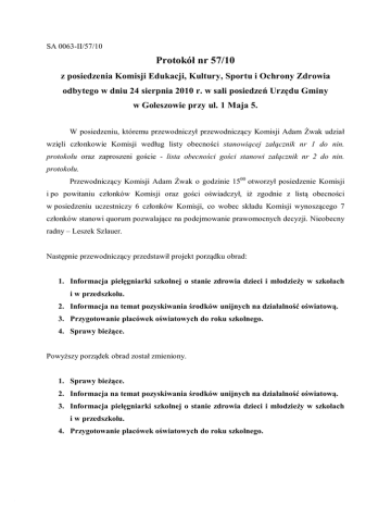 SA 0063-II/57/10 Protokół nr 57/10 z posiedzenia Komisji Edukacji, Kultury, Sportu i Ochrony Zdrowia odbytego w dniu 24 sierpnia 2010 r. w sali posiedzeń Urzędu Gminy w Goleszowie przy ul. 1 Maja 5. W posiedzeniu, któremu przewodniczył przewodniczący Komisji Adam Żwak udział wzięli członkowie Komisji według listy obecności stanowiącej załącznik nr 1 do nin. protokołu oraz zaproszeni goście - lista obecności gości stanowi załącznik nr 2 do nin. protokołu. Przewodniczący Komisji Adam Żwak o godzinie 1500 otworzył posiedzenie Komisji i po powitaniu członków Komisji oraz gości oświadczył, iż zgodnie z listą obecności w posiedzeniu uczestniczy 6 członków Komisji, co wobec składu Komisji wynoszącego 7 członków stanowi quorum pozwalające na podejmowanie prawomocnych decyzji. Nieobecny radny – Leszek Szlauer. Następnie przewodniczący przedstawił projekt porządku obrad: 1. Informacja pielęgniarki szkolnej o stanie zdrowia dzieci i młodzieży w szkołach i w przedszkolu. 2. Informacja na temat pozyskiwania środków unijnych na działalność oświatową. 3. Przygotowanie placówek oświatowych do roku szkolnego. 4. Sprawy bieżące. Powyższy porządek obrad został zmieniony. 1. Sprawy bieżące. 2. Informacja na temat pozyskiwania środków unijnych na działalność oświatową. 3. Informacja pielęgniarki szkolnej o stanie zdrowia dzieci i młodzieży w szkołach i w przedszkolu. 4. Przygotowanie placówek oświatowych do roku szkolnego. Protokół nr57/10 z posiedzenia Komisji Edukacji, Kultury, Sportu i Ochrony Zdrowia odbytego w dniu 24 sierpnia 2010 r. strona 2 Przewodniczący Komisji Adam Żwak poinformował, że jako pierwszy informacje na temat działalności LKS Wiki przedstawi prezes LKS Wiki Stanisław Bojda. Zmieniony porządek obrad został jednogłośnie przyjęty. Ad.1. Sprawy bieżące. Prezes LKS Wiki Stanisław Bojda przedstawił Komisji szczegółowe informacje na temat działalności klubu sportowego Wiki. Klub musiał wycofać drużynę ze względu na brak środków finansowych. Dofinansowanie – 2500 zł jakie klub otrzymał, nie wystarcza na utrzymanie drużyny. Aby utrzymać jedną drużynę trzeba posiadać kwotę 4000 zł tylko na same opłaty sędziowskie. Aby reaktywować klub potrzebne są środki finansowe rzędu 17.000- 23.000 zł. Klub ze swoich funduszy zainwestował ostatnio w piłkochwyty. Nad betonowym płotem zostanie rozwieszona dwumetrowa siatka. Dochody Klubu to 8.0009.000 zł, ale to i tak za mało aby pokryć wszystkie koszty związane z działalnością klubu. Badania lekarskie muszą być wykonywane dwa razy w roku – koszt jednego badania to 50 zł. Radny Czesław Joniec zapytał ilu juniorów mógłby klub zebrać, aby stworzyć drużynę. Prezes Klubu Stanisław Bojda odpowiedział, że na dzień dzisiejszy może zebrać 15 juniorów i 15 trampkarzy. Radny Dariusz Orawiec zapytał Prezesa Klubu, czy zdaje sobie sprawę z tego, dlaczego dotacje na klub zmalały. Prezes Klubu Stanisław Bojda odpowiedział, że jak trenerem był pan Przemysław Misiarz, klub posiadał 2 dobre drużyny. Niestety z nadmiaru obowiązków pan Przemysław Misiarz zrezygnował z posady trenera, klubu nie było stać na zatrudnienie drugiego trenera. Przewodniczący Komisji Adam Żwak poinformował, że bardzo ważny jest efekt sportowy, ale jeśli go nie ma pomimo tego, że klub otrzymywał dofinansowanie na utrzymanie działalności klubu, nie ma sensu aby dalej dofinansowywać klub w taka kwotę. Prezes Klubu Stanisław Bojda poinformował, że pomimo trudnej sytuacji finansowej klub nie zostanie rozwiązany. Informacja na temat funkcjonowania LKS Wiki została przyjęta przez Komisję. Prezes Klubu Stanisław Bojda opuścił posiedzenie Komisji. Ad.2. Informacja na temat pozyskiwania środków unijnych na działalność oświatową. Podinspektor ds. funduszy zewnętrznych Zbigniew Kohut przekazał szczegółowe informacje na temat pozyskiwania środków unijnych na działalność oświatową. W okresie programowania określonym na lata 2007-2013 istnieją dwa programy operacyjne. Pierwszy to Protokół nr57/10 z posiedzenia Komisji Edukacji, Kultury, Sportu i Ochrony Zdrowia odbytego w dniu 24 sierpnia 2010 r. strona 3 Regionalny Program Operacyjny Województwa Śląskiego , drugi to Kapitał Ludzki. Do konkursu pierwszego programu Gmina przygotowała 4 projekty. 1. Modernizacja i wyposażenie szkoły w Cisownicy. 2. Modernizacja i doposażenie przedszkola w Goleszowie. 3. Budowa boiska przyszkolnego przy szkole w Dzięgielowie. 4. Program związany z informatycznym wspomaganiem zarządzania oświatą. Udało się dostać dofinansowanie na jeden projekt : Modernizacja i wyposażenie szkoły w Cisownicy. Jeśli chodzi o program Kapitał Ludzki, Gmina trzykrotnie przystępowała do tego konkursu. Niestety wnioski nie zostały pozytywnie ocenione i nie zostało przyznane dofinansowanie. Gmina starała się także o dofinansowanie z funduszy krajowych - Program „Radosna Szkoła”. W tym momencie na salę wszedł radny Leszek Szlauer. W tym roku zostało przyznane dofinansowanie dla trzech szkół na zakup pomocy dydaktycznych (SP w Goleszowie 18.000 zł, SP w Cisownicy i SP w Bażanowicach po 6.000 zł). Zostały także pozytywnie ocenione wnioski na zakup placów zabaw i przyznane dofinansowanie w wysokości 50% kosztów kwalifikowanych. Powstaną one przy szkołach podstawowych w Goleszowie, Dzięgielowie i Puńcowie. Program „Radosna Szkoła” będzie kontynuowany jeszcze przez dwa lata i kolejne szkoły wezmą w nim udział. Ad.3. Informacja pielęgniarki szkolnej o stanie zdrowia dzieci i młodzieży w szkołach i w przedszkolu. Pisemną informację o stanie zdrowia dzieci i młodzieży w szkołach i przedszkolu przekazała pielęgniarka szkolna Jolanta Twardowska. Pismo stanowi załącznik nr 3 do nin. protokołu. Po przeanalizowaniu członkowie komisji stwierdzili, że nie uzyskali odpowiedzi na wszystkie pyta