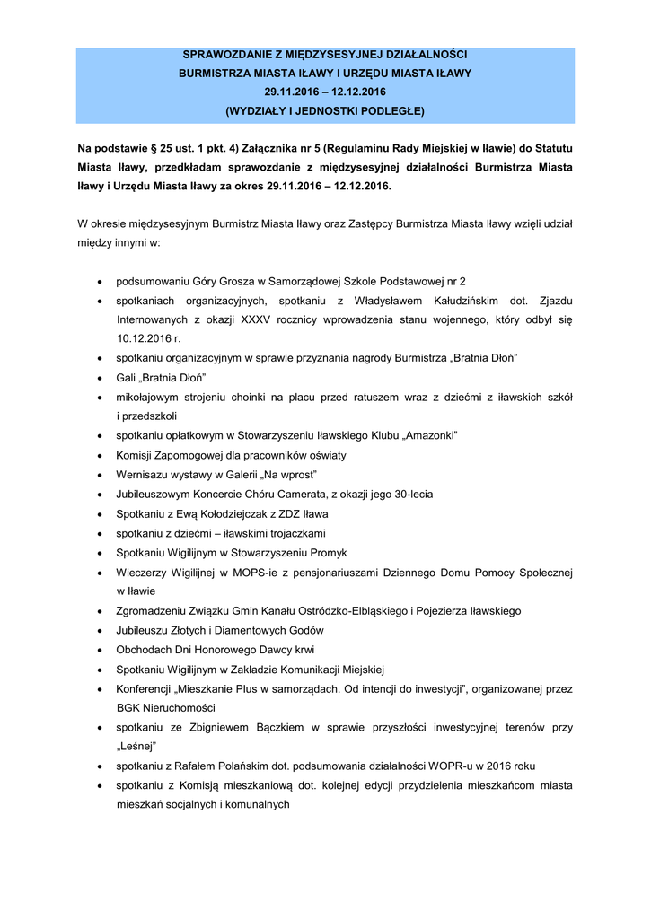 SPRAWOZDANIE Z MIĘDZYSESYJNEJ DZIAŁALNOŚCI BURMISTRZA MIASTA IŁAWY I URZĘDU MIASTA IŁAWY 29.11.2016 – 12.12.2016 (WYDZIAŁY I JEDNOSTKI PODLEGŁE) Na podstawie § 25 ust. 1 pkt. 4) Załącznika nr 5 (Regulaminu Rady Miejskiej w Iławie) do Statutu Miasta Iławy, przedkładam sprawozdanie z międzysesyjnej działalności Burmistrza Miasta Iławy i Urzędu Miasta Iławy za okres 29.11.2016 – 12.12.2016. W okresie międzysesyjnym Burmistrz Miasta Iławy oraz Zastępcy Burmistrza Miasta Iławy wzięli udział między innymi w: podsumowaniu Góry Grosza w Samorządowej Szkole Podstawowej nr 2 spotkaniach organizacyjnych, spotkaniu z Władysławem Kałudzińskim dot. Zjazdu Internowanych z okazji XXXV rocznicy wprowadzenia stanu wojennego, który odbył się 10.12.2016 r. spotkaniu organizacyjnym w sprawie przyznania nagrody Burmistrza „Bratnia Dłoń” Gali „Bratnia Dłoń” mikołajowym strojeniu choinki na placu przed ratuszem wraz z dziećmi z iławskich szkół i przedszkoli spotkaniu opłatkowym w Stowarzyszeniu Iławskiego Klubu „Amazonki” Komisji Zapomogowej dla pracowników oświaty Wernisazu wystawy w Galerii „Na wprost” Jubileuszowym Koncercie Chóru Camerata, z okazji jego 30-lecia Spotkaniu z Ewą Kołodziejczak z ZDZ Iława spotkaniu z dziećmi – iławskimi trojaczkami Spotkaniu Wigilijnym w Stowarzyszeniu Promyk Wieczerzy Wigilijnej w MOPS-ie z pensjonariuszami Dziennego Domu Pomocy Społecznej w Iławie Zgromadzeniu Związku Gmin Kanału Ostródzko-Elbląskiego i Pojezierza Iławskiego Jubileuszu Złotych i Diamentowych Godów Obchodach Dni Honorowego Dawcy krwi Spotkaniu Wigilijnym w Zakładzie Komunikacji Miejskiej Konferencji „Mieszkanie Plus w samorządach. Od intencji do inwestycji”, organizowanej przez BGK Nieruchomości spotkaniu ze Zbigniewem Bączkiem w sprawie przyszłości inwestycyjnej terenów przy „Leśnej” spotkaniu z Rafałem Polańskim dot. podsumowania działalności WOPR-u w 2016 roku spotkaniu z Komisją mieszkaniową dot. kolejnej edycji przydzielenia mieszkańcom miasta mieszkań socjalnych i komunalnych wyjeździe do WFOŚiGW w Olsztynie w sprawie uzgodnień dot. projektów konkursowych z RPO spotkaniu z Eugeniuszem Dębińskim dot. umówienia bieżącej działalności Związku Inwalidów Wojennych spotkaniu z Krzysztofem Słowińskim, Dyrektorem Parku Krajobrazowego Pojezierza Iławskiego i Wzgórz Dylewskich w Jerzwałdzie oraz Ewą Wiśniewską, Dyrektor Iławskiego Centrum Kultury w sprawie organizacji Festiwalu Filmu Przyrodniczego spotkaniu z Andrzejem Prus w sprawie cywilizacji pruskiej, Grodziska, a także ewentualnej konferencji spotkaniu z Anetą Sakowską z firmy Nord Partner, a także pracownikami jednostek podległych urzędowi w sprawie ubezpieczenia na życie spotkaniu z biurem projektowym z Gdańska w sprawie negocjacji dot. wykonania dokumentacji na skwer Żeromskiego wyjeździe studyjnym z Ostródzko-Iławskiego Obszaru Funkcjonalnego obejmującego Lublin, Piaski, Ożarów Mazowiecki oraz Milanówek seminarium Biblioteka Nowa IV „Otwarta, demokratyczna przestrzeń usługowa – czyli o architekturze bibliotek, które odbyło się w Bibliotece Narodowej w Warszawie Wydział Komunikacji Społecznej 1. W dniach 01-05.12.2016 r. trwały przygotowania do Gali ”Bratnia Dłoń”, która odbyła się w dn. 05.12.2016 r. w Kinoteatrze „Pasja”. Podczas uroczystości Burmistrz Miasta przyznał Złote Statuetki oraz nagrody za szczególne osiągnięcia na rzecz pracy z osobami z niepełnosprawnościami. Nagrodami Burmistrza Miasta zostały odznaczone: Anna Caban, Tomasz Sławiński i Stowarzyszenie „Promyk”. Złote Statuetki otrzymali: Lech Żendarski, Czesława Jussel oraz Stanisław Piasek. 2. W dniach 06., 09. i 10.12.2016 r. zorganizowane zostały grudniowe wycieczki z przewodnikiem Dariuszem Paczkowskim. 06.12. – Mikołajkowo po Iławie – legendy i historie związane z Św. Mikołajem, 09.12. – Historia Iławy dla najmłodszych, 10.12. – Przedświąteczne spotkanie z przewodnikiem. 3. Wydział Komunikacji Społecznej ze współpracy z Dariuszem Paczkowskim przygotowuje dla dzieci z Iławy, spotkania w okresie międzyświątecznym pt. „Świąteczne kreatywne inspiracje LEGO” . W programie spotkań zajęcia takie jak: kreatywna gra z Lego, lepienie Lego Bałwana, Lego Historie o tym jak powstał Ratusz i Czerwony Kościół oraz „Do you speak Lego” - lekcja angielskiego wykorzystaniem Lego klocków. Zajęcia odbywać się będą w dniach 28.12 – 29.12.2016 w Sali konferencyjnej ICK. 4. Trwają także przygotowania do okresu świątecznego. Wysyłane są kartki świąteczne, nagrywane życzenia w radiu oraz wysyłane do publikacji w lokalnej prasie. Wydział Planowania, Inwestycji i Monitoringu 1. W dn. 30.11.2016 r. podpisany został protokół przekazania dokumentacji dla przedsięwzięcia polegającego na: „ Budowie ścieżek rowerowych łączących miasto Iława i gminę Iława – Iława-Kamień”. Dokumentację wykonała Pracownia projektowa BIN inż. Bogdan Motyliński. Koszt opracowania dokumentacji wyniósł 17 220,00 zł. 2. W dn. 30.11.2016 r. Wojewoda Warmińsko – Mazurski wydał decyzję, pozwolenie na budowę dla zadania polegającego na: „ zagospodarowaniu turystycznym brzegów rzeki Iławki i jeziora Iławskiego”. Decyzja obejmuje budowę instalacji elektrycznych, oświetleniowych i telekomunikacyjnych leżących w obrębie mostu kolejowego na działkach należących do PKP. 3. W dn. 30.11.2016 r. Wojewoda Warmińsko – Mazurski, wydał pozwolenie na budowę w ramach zadania: „Rewitalizacja lasu komunalnego przy ulicy Sienkiewicza”, obejmujące budowę ciągu pieszego i pieszo-rowerowego, sieci elektroenergetycznej w zakresie oświetlenia terenu, zasilania szafek monitoringu w pasie drogi krajowej nr 16 - ul. Sienkiewicza w Iławie. 4. W dn. 05.12.2016 r. podpisano protokół przekazania dokumentacji dla zadania: „ Zagospodarowanie terenu ogródków dz