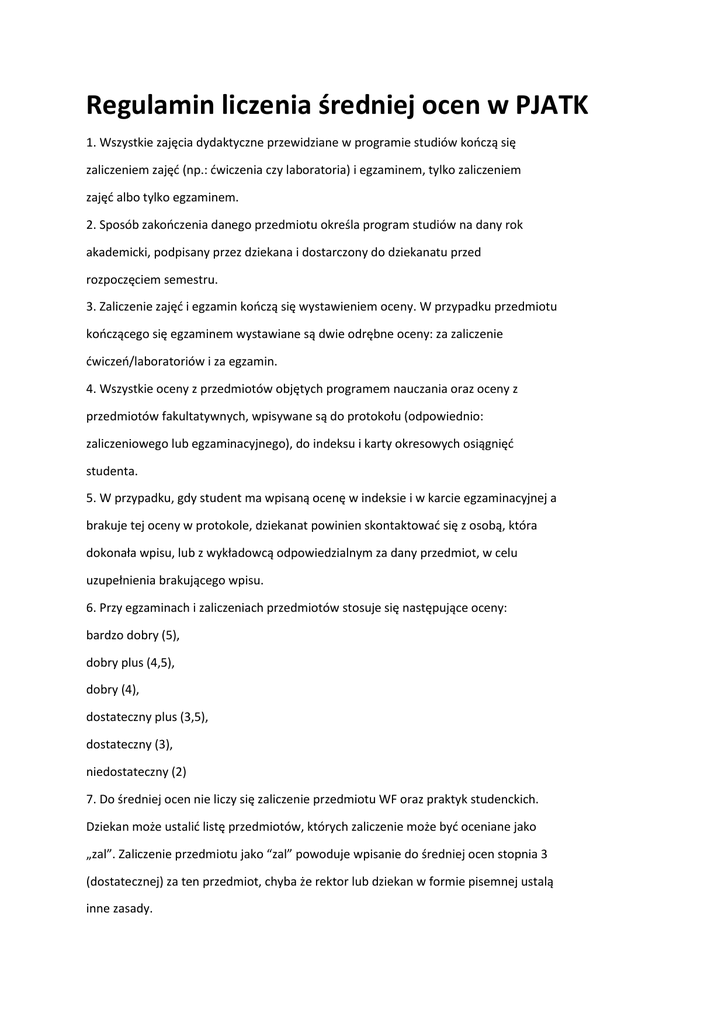 Regulamin liczenia średniej ocen w PJATK 1. Wszystkie zajęcia dydaktyczne przewidziane w programie studiów kończą się zaliczeniem zajęć (np.: ćwiczenia czy laboratoria) i egzaminem, tylko zaliczeniem zajęć albo tylko egzaminem. 2. Sposób zakończenia danego przedmiotu określa program studiów na dany rok akademicki, podpisany przez dziekana i dostarczony do dziekanatu przed rozpoczęciem semestru. 3. Zaliczenie zajęć i egzamin kończą się wystawieniem oceny. W przypadku przedmiotu kończącego się egzaminem wystawiane są dwie odrębne oceny: za zaliczenie ćwiczeń/laboratoriów i za egzamin. 4. Wszystkie oceny z przedmiotów objętych programem nauczania oraz oceny z przedmiotów fakultatywnych, wpisywane są do protokołu (odpowiednio: zaliczeniowego lub egzaminacyjnego), do indeksu i karty okresowych osiągnięć studenta. 5. W przypadku, gdy student ma wpisaną ocenę w indeksie i w karcie egzaminacyjnej a brakuje tej oceny w protokole, dziekanat powinien skontaktować się z osobą, która dokonała wpisu, lub z wykładowcą odpowiedzialnym za dany przedmiot, w celu uzupełnienia brakującego wpisu. 6. Przy egzaminach i zaliczeniach przedmiotów stosuje się następujące oceny: bardzo dobry (5), dobry plus (4,5), dobry (4), dostateczny plus (3,5), dostateczny (3), niedostateczny (2) 7. Do średniej ocen nie liczy się zaliczenie przedmiotu WF oraz praktyk studenckich. Dziekan może ustalić listę przedmiotów, których zaliczenie może być oceniane jako „zal”. Zaliczenie przedmiotu jako “zal” powoduje wpisanie do średniej ocen stopnia 3 (dostatecznej) za ten przedmiot, chyba że rektor lub dziekan w formie pisemnej ustalą inne zasady. 8. Średnia ocen jest średnią arytmetyczną liczoną ze wszystkich ocen uzyskanych z przedmiotów objętych programem nauczania (z wyłączeniem przedmiotów wymienionych w pkt. 7) oraz z przedmiotów fakultatywnych. Średnia ocen liczona może być za określony semestr, rok studiów albo za cały okres studiów. W przypadku uzyskania za dany przedmiot więcej niż jednej oceny pozytywnej, do średniej ocen liczona będzie ocena wyższa, chyba, że prowadzący przedmiot postanowi inaczej. W przypadku uzyskania za dany przedmiot więcej niż jednej oceny niedostatecznej, do średniej ocen liczy się tylko jedna z nich. 9. Średnią ocen, z zastrzeżeniem pkt. 9, za dany okres liczy się w sposób następujący: wszystkie uzyskane oceny są sumowane, a następnie wynik dzielony jest przez liczbę ocen uzyskanych przez studenta. 10. Średnia ocen liczona jest oddzielnie dla każdego kierunku studiów. 11. Pozytywna ocena z przedmiotów niezaliczonych powtarzanych w następnych semestrach w trybie ITN, wliczana będzie do średniej za semestr, w którym dany przedmiot objęty jest programem nauczania. 12. Student może uzyskać zgodę dziekana na studiowanie według Indywidualnego Program Studiów. Zgoda jest udzielana w trybie rozpatrzenia podania. Lista przedmiotów realizowanych w danym semestrze powinna być określona przed początkiem semestru i średnia ocen za ten semestr jest średnią ocen z tych przedmiotów. Dziekan w porozumieniu z promotorem określi minimalną liczbę jednostek do zrealizowania w semestrze. 13. Dziekan może wyrazić zgodę na studiowanie według Indywidualnego Programu Studiów, pod warunkiem, że propozycja takiego programu zostanie przedstawiona dziekanowi z zachowaniem terminów określonych w pkt. 12. 14. Oceny „transferowane” z innych uczelni (wydziałów, studiów) wliczane są do średniej tego semestru, w którym dany przedmiot występuje w programie nauczania w PJWSTK 15. Dla celów stypendialnych pod uwagę będzie brana średnia ocen wg. stanu na ostatni dzień danego semestru. Przypadki osób przebywających na wymianie zagranicznej będą rozpatrywane indywidualnie po otrzymaniu potwierdzonych wyników nauczania. 16. Niniejszy regulamin wchodzi w życie z dniem 01.09.2009 r.