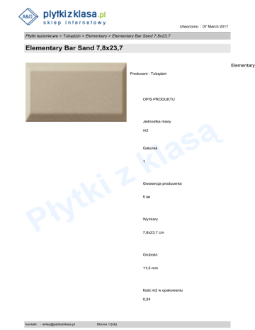 Utworzono : 07 March 2017 Płytki łazienkowe > Tubądzin > Elementary > Elementary Bar Sand 7,8x23,7 Elementary Bar Sand 7,8x23,7 Elementary Producent : Tubądzin OPIS PRODUKTU ą s la Jednostka miary m2 Gatunek k z 1 i tk y ł P Gwarancja producenta 5 lat Wymiary 7,8x23,7 cm Grubość 11,5 mm Ilość m2 w opakowaniu 0,24 kontakt : - [email protected] Strona 1/{nb} Utworzono : 07 March 2017 Płytki łazienkowe > Tubądzin > Elementary > Elementary Bar Sand 7,8x23,7 Elementary Bar Sand 7,8x23,7 Ilość sztuk w opakowaniu 13 Rodzaj Płytka ścienna ą s la Zastosowanie Wewnątrz k z Pomieszczenia i tk y ł P Łazienka, salon Powierzchnia Półmat Produkt rektyfikowany Nie Produkt tonalny Nie Klasa ścieralności PEI / liczba obrotów Ne dotyczy Antypoślizgowość Nie dotyczy Mrozoodporoność Nie kontakt : - [email protected] Strona 2/{nb} Utworzono : 07 March 2017 Płytki łazienkowe > Tubądzin > Elementary > Elementary Bar Sand 7,8x23,7 Elementary Bar Sand 7,8x23,7 Waga opakowania / 1m2 4,62 kg / 19,3 kg Podana cena dotyczy 1 m2 Spsosób sprzedaży produktu Produkt sprzedawany na opakowania ą s la Cena : 82,29 zł Brutto ( 66,90 zł Netto) k z Dostępność: Produkt dostępny w naszym sklepie od 11 September 2016 i tk y ł P kontakt : - [email protected] Strona 3/{nb}
