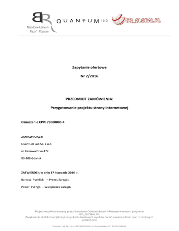 Zapytanie ofertowe Nr 2/2016 PRZEDMIOT ZAMÓWIENIA: Przygotowanie projektu strony internetowej Oznaczenie CPV: 79000000-4 ZAMAWIAJĄCY: Quantum Lab Sp. z o.o. al. Grunwaldzka 472 80-309 Gdańsk ZATWIERDZIŁ w dniu 17 listopada 2016 r. Bartosz Rychlicki – Prezes Zarządu Paweł Tylingo – Wiceprezes Zarządu Projekt współfinansowany przez Narodowe Centrum Badań i Rozwoju w ramach programu GO_GLOBAL.PL Zwiększenie skali komercjalizacji na rynkach światowych wyników badań naukowych lub prac rozwojowych polskich firm Quantum Lab Sp. z o.o. NIP 5842746441 al. Grunwaldzka 472, 80-309 Gdańsk 1. Opis sposobu przygotowania oferty. Oferta powinna być sporządzona w języku polskim lub angielskim oraz podpisana (lub parafowana) przez osobę (osoby) upoważnione do występowania w imieniu Wykonawcy. Oferta przekazywana w formie papierowej musi być trwale zespolona. W przypadku przekazywania oferty w formie elektronicznej, formularz ofertowy wraz ze wszystkimi załącznikami musi zostać przesłany w jednej wiadomości mailowej. Każdy wykonawca może złożyć wyłącznie jedną ofertę, w której musi być zaoferowana tylko jedna ostateczna cena. Ofertę należy złożyć na formularzu stanowiącym załącznik do niniejszego zapytania. W przypadku niespełnienia powyższych warunków, nadesłana oferta zostanie uznana za nieważną. 2. Dokumenty wymagane od wykonawców. ▪ Aktualny odpis z KRS lub innego właściwego rejestru, lub kopia aktualnego zaświadczenia o wpisie do ewidencji działalności gospodarczej (akceptowany wydruk z właściwej strony www). ▪ Jeżeli upoważnienie do podpisania oferty nie wynika z załączonego dokumentu rejestrowego do oferty należy dołączyć pełnomocnictwo osoby podpisującej ofertę. ▪ Oferta sporządzona na formularzu stanowiącym część A załącznika nr 1 do niniejszego zapytania ofertowego. ▪ Oświadczenie Oferenta o spełnianiu kryteriów uczestnictwa w postępowaniu na formularzu stanowiącym część B załącznika nr 1 do niniejszego zapytania ofertowego. ▪ Oświadczenie Oferenta o braku powiązań kapitałowych lub osobowych z Zamawiającym na formularzu stanowiącym część C załącznika nr 1 do niniejszego zapytania ofertowego. Zamawiający dopuszcza złożenie dodatkowych dokumentów, niewymienionych powyżej. Projekt współfinansowany przez Narodowe Centrum Badań i Rozwoju w ramach programu GO_GLOBAL.PL Zwiększenie skali komercjalizacji na rynkach światowych wyników badań naukowych lub prac rozwojowych polskich firm Quantum Lab Sp. z o.o. NIP 5842746441 al. Grunwaldzka 472, 80-309 Gdańsk 3. Podmioty uprawnione do udziału w postępowaniu. W postępowaniu mogą wziąć udział Oferenci, którzy: ▪ Posiadają uprawnienia do wykonywania określonej działalności lub czynności, jeżeli ustawy nakładają obowiązek posiadania takich uprawnień. ▪ Posiadają niezbędną wiedzę i doświadczenie oraz dysponują potencjałem technicznym i osobami zdolnymi do wykonania zamówienia. ▪ Znajdują się w sytuacji ekonomicznej i finansowej zapewniającej wykonanie zamówienia. ▪ Nie otwarto wobec nich likwidacji, ani nie ogłoszono upadłości ▪ Nie zalegają z uiszczeniem podatków, opłat lub składek na ubezpieczenia społeczne lub zdrowotne. ▪ Nie zostali prawomocnie skazani za przestępstwo popełnione w związku z postępowaniem o udzielenie zamówienia, przestępstwo przekupstwa, przestępstwo przeciwko obrotowi gospodarczemu lub inne przestępstwo popełnione w celu osiągnięcia korzyści majątkowych. ▪ W przypadku, w którym wspólnik spółki jawnej, partner lub członek zarządu spółki partnerskiej, komplementariusz spółki komandytowej oraz spółki komandytowo-akcyjnej członek organu zarządzającego osoby prawnej nie został prawomocnie skazany za przestępstwo popełnione w związku z postępowaniem o udzielenie zamówienia, przestępstwo przekupstwa, przestępstwo przeciwko obrotowi gospodarczemu lub inne przestępstwo popełnione w celu osiągnięcia korzyści majątkowych. ▪ Wobec których, sąd nie orzekł zakazu ubiegania się o zamówienia, na podstawie przepisów o odpowiedzialności podmiotów zbiorowych za czyny zabronione pod groźbą kary. ▪ Nie są podmiotami powiązanymi osobowo lub kapitałowo z Zamawiającym. Przez powiązania kapitałowe lub osobowe rozumie się wzajemne powiązania pomiędzy Zamawiającym, osobą upoważnioną do zaciągania zobowiązań w imieniu Zamawiającego, osobami wykonującymi czynności związane z przygotowaniem i przeprowadzeniem procedury wyboru wykonawcy oraz wykonawcą. Ofertę może złożyć tylko Wykonawca: Projekt współfinansowany przez Narodowe Centrum Badań i Rozwoju w ramach programu GO_GLOBAL.PL Zwiększenie skali komercjalizacji na rynkach światowych wyników badań naukowych lub prac rozwojowych polskich firm Quantum Lab Sp. z o.o. NIP 5842746441 al. Grunwaldzka 472, 80-309 Gdańsk o niepowiązany lub niebędący jednostką zależną, współzależną lub dominującą w relacji z Zamawiającym w rozumieniu ustawy z dnia 29 września 1994 r. o rachunkowości (Dz. U. z 2013 r., poz. 330, ze zm.); o niebędący podmiotem pozostającym z Zamawiającym lub członkami ich organów w takim stosunku faktycznym lub prawnym, który może budzić uzasadnione wątpliwości co do bezstronności w wyborze dostawcy towaru lub usługi, w szczególności pozostającym w związku małżeńskim, stosunku pokrewieństwa lub powinowactwa do drugiego stopnia włącznie, stosunku przysposobienia, opieki lub kurateli, także poprzez członkostwo w organach dostawcy towaru lub usługi; o niebędący podmiotem powiązanym ani podmiotem partnerskim w stosunku do Zamawiającego w rozumieniu Rozporządzenia Komisji (UE) Nr 651/2014 z dnia 17 czerwca 2014 r. uznającego niektóre rodzaje pomocy za zgodne ze wspólnym rynkiem w zastosowaniu art. 107 i 108 Traktatu; o niebędący podmiotem powiązanym osobowo z Zamawiającym w rozumieniu art. 32 ust. 2 ust