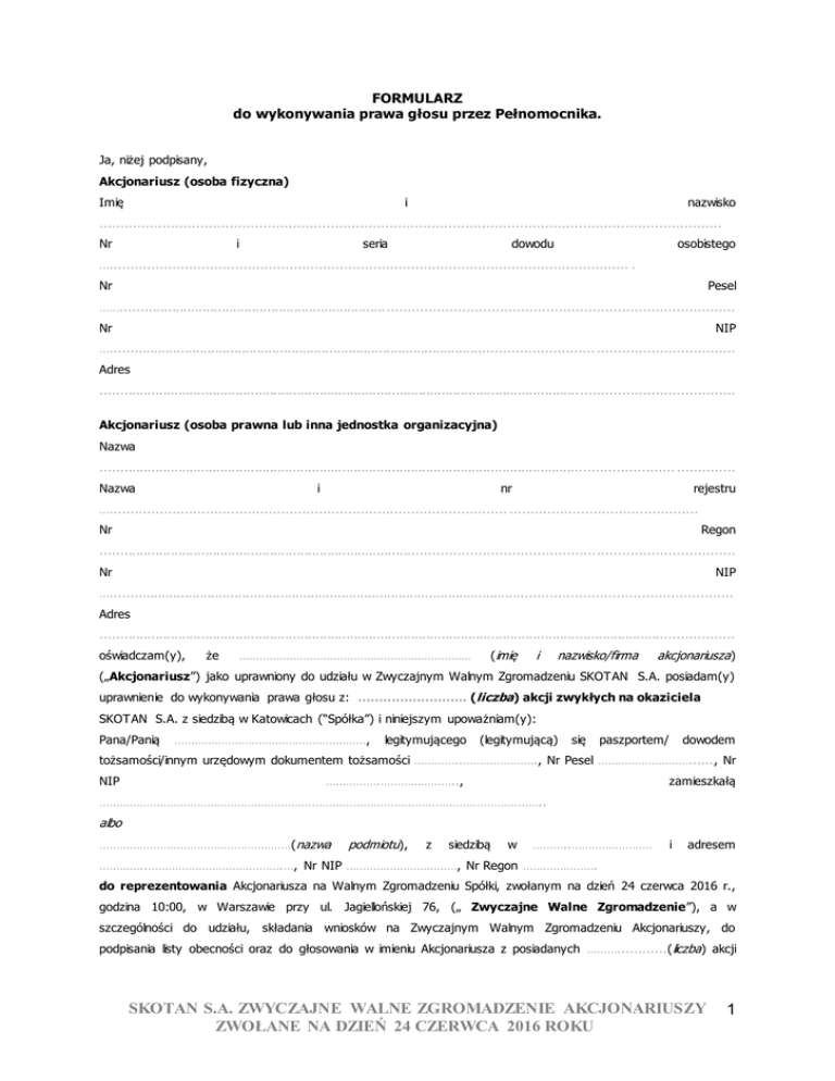 Formularz do wykonywania prawa głosu przez pełnomocnika