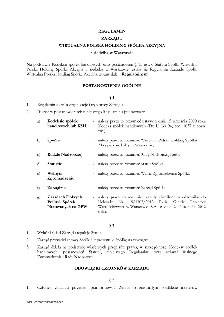 REGULAMIN ZARZĄDU WIRTUALNA POLSKA HOLDING SPÓŁKA AKCYJNA z siedzibą w Warszawie Na podstawie Kodeksu spółek handlowych oraz postanowień § 15 ust. 6 Statutu Spółki Wirtualna Polska Holding Spółka Akcyjna z siedzibą w Warszawie, ustala się Regulamin Zarządu Spółki Wirtualna Polska Holding Spółka Akcyjna, zwany dalej „Regulaminem”. POSTANOWIENIA OGÓLNE §1 1. Regulamin określa organizację i tryb pracy Zarządu. 2. Ilekroć w postanowieniach niniejszego Regulaminu jest mowa o: a) Kodeksie spółek handlowych lub KSH - należy przez to rozumieć ustawę z dnia 15 września 2000 roku Kodeks spółek handlowych (Dz. U. Nr 94, poz. 1037 z późn. zm.), b) Spółce - należy przez to rozumieć Wirtualna Polska Holding Spółka Akcyjna z siedzibą w Warszawie, c) Radzie Nadzorczej - należy przez to rozumieć Radę Nadzorczą Spółki, d) Statucie - należy przez to rozumieć Statut Spółki, e) Walnym Zgromadzeniu - należy przez to rozumieć Walne Zgromadzenie Spółki, f) Zarządzie - należy przez to rozumieć Zarząd Spółki, g) Zasadach Dobrych Praktyk Spółek Notowanych na GPW - należy przez to rozumieć zasady określone w załączniku do Uchwały Nr 19/1307/2012 Rady Giełdy Papierów Wartościowych w Warszawie S.A. z dnia 21 listopada 2012 roku. §2 1. Wybór i skład Zarządu reguluje Statut. 2. Zarząd prowadzi sprawy Spółki i reprezentuje Spółkę na zewnątrz. 3. Zarząd działa na podstawie właściwych przepisów prawa, w szczególności Kodeksu spółek handlowych, postanowień Statutu, niniejszego Regulaminu oraz uchwał Walnego Zgromadzenia i Rady Nadzorczej. OBOWIĄZKI CZŁONKÓW ZARZĄDU §3 1. Członek Zarządu powinien poinformować Zarząd o zaistniałym konflikcie interesów WEIL:\95290676\7\81379.0007 lub możliwości jego powstania oraz powstrzymać się od zabierania głosu w dyskusji oraz od głosowania nad uchwałą w sprawie, w której zaistniał konflikt interesów. 2. Członkowie Zarządu są obowiązani informować również Radę Nadzorczą o każdym konflikcie interesów w związku z pełnioną funkcją lub o możliwości jego powstania. 3. Członek Zarządu powinien zachować pełną lojalność wobec Spółki i uchylać się od działań, które mogłyby prowadzić wyłącznie do realizacji własnych korzyści materialnych. 4. Członkowie Zarządu powinni uczestniczyć w obradach Walnego Zgromadzenia w składzie umożliwiającym udzielenie merytorycznej odpowiedzi na pytania zadawane w trakcie Walnego Zgromadzenia. §4 Podejmowanie przez członka Zarządu działalności konkurencyjnej wobec działalności Spółki, uczestnictwo w spółce konkurencyjnej jako wspólnik spółki cywilnej, spółki osobowej lub sprawowanie funkcji w organach nadzorczych i zarządzających innych podmiotów (wyłączając sprawowanie powyższych funkcji w jednostkach grupy kapitałowej Spółki w rozumieniu obowiązujących przepisów ustawy o rachunkowości) wymaga uprzedniego zezwolenia Rady Nadzorczej. §5 1. Nowo powołani członkowie Zarządu, przejmują protokolarnie od ustępujących członków Zarządu prowadzenie Spółki. Protokół sporządza ustępujący Zarząd bądź członek Zarządu. 2. Protokół winien obejmować opis stanu faktycznego poszczególnych dziedzin działalności Spółki, na dzień przekazania. 3. Protokół podpisują wszyscy ustępujący i nowo powołani członkowie Zarządu. 4. Protokół winien być sporządzony w ilości odpowiedniej do liczby ustępujących i nowo powołanych członków Zarządu, a także dla celów dowodowych. 5. W przypadku niemożności przekazania spraw przez ustępujący Zarząd bądź członka Zarządu, protokół sporządza komisja powołana przez Radę Nadzorczą. 6. Ustępujący Zarząd lub członek Zarządu są zobowiązani złożyć wyjaśnienia w toku przygotowywania sprawozdania Zarządu i sprawozdania finansowego, obejmującego okres pełnienia przez niego funkcji członka Zarządu oraz do udziału w Walnym Zgromadzeniu, zatwierdzającym wymienione wyżej sprawozdania. §6 1. Zarząd gromadzi i archiwizuje dokumenty związane ze swoją działalnością przez okres co najmniej 5 (pięciu) lat. 2. Udostępnianie dokumentów Zarządu osobom trzecim wymaga zgody jednego Zarządu, udzielonej w formie pisemnej, z zastrzeżeniem, że ograniczenie to doradców prawnych ani udostępnienia biegłym rewidentom do wglądu z posiedzeń Zarządu, w związku z przeprowadzanym przez nich badaniem finansowych Spółki. 2 z Członków nie dotyczy protokołów sprawozdań ZAKRES KOMPETENCJI ZARZĄDU §7 1. W ramach swoich kompetencji Zarząd wykonuje czynności konieczne do realizacji zadań Spółki określonych w Statucie, uchwałach Walnego Zgromadzenia i Rady Nadzorczej, a także reprezentuje Spółkę we wszystkich czynnościach sądowych i pozasądowych oraz zarządza majątkiem Spółki, z wyłączeniem uprawnień zastrzeżonych dla innych organów Spółki. 2. W szczególności do zakresu kompetencji Zarządu należy: a) występowanie w imieniu Spółki i reprezentowanie jej wobec osób trzecich, b) sporządzanie informacji okresowych Spółki (w tym jednostkowych i skonsolidowanych sprawozdań finansowych Spółki) oraz sprawozdania Zarządu z działalności Spółki w terminach umożliwiających ich publikację zgodnie z właściwymi przepisami prawa, c) poddawanie sprawozdań finansowych badaniu lub przeglądowi przez biegłego rewidenta, d) składanie do oceny Rady Nadzorczej dokumentów wymienionych w pkt b) wraz z opinią i raportem biegłego rewidenta (jeżeli są wymagane przez przepisy prawa), e) terminowe zwoływanie Walnych Zgromadzeń, składanie wniosków na Walne Zgromadzenie oraz przygotowywanie projektów uchwał tego organu, f) przedstawianie Walnemu Zgromadzeniu do rozpatrzenia i zatwierdzenia sprawozdania Zarządu z działalności Spółki oraz sprawozdania finansowego za ostatni rok obrotowy wraz z opinią i raportem biegłego rewidenta, g) opracowywanie i uchwalanie regul