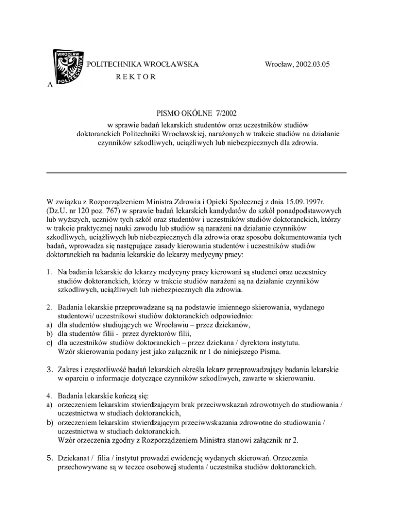 POLITECHNIKA WROCŁAWSKA A Wrocław, 2002.03.05 REKTOR PISMO OKÓLNE 7/2002 w sprawie badań lekarskich studentów oraz uczestników studiów doktoranckich Politechniki Wrocławskiej, narażonych w trakcie studiów na działanie czynników szkodliwych, uciążliwych lub niebezpiecznych dla zdrowia. W związku z Rozporządzeniem Ministra Zdrowia i Opieki Społecznej z dnia 15.09.1997r. (Dz.U. nr 120 poz. 767) w sprawie badań lekarskich kandydatów do szkół ponadpodstawowych lub wyższych, uczniów tych szkół oraz studentów i uczestników studiów doktoranckich, którzy w trakcie praktycznej nauki zawodu lub studiów są narażeni na działanie czynników szkodliwych, uciążliwych lub niebezpiecznych dla zdrowia oraz sposobu dokumentowania tych badań, wprowadza się następujące zasady kierowania studentów i uczestników studiów doktoranckich na badania lekarskie do lekarzy medycyny pracy: 1. Na badania lekarskie do lekarzy medycyny pracy kierowani są studenci oraz uczestnicy studiów doktoranckich, którzy w trakcie studiów narażeni są na działanie czynników szkodliwych, uciążliwych lub niebezpiecznych dla zdrowia. 2. Badania lekarskie przeprowadzane są na podstawie imiennego skierowania, wydanego studentowi/ uczestnikowi studiów doktoranckich odpowiednio: a) dla studentów studiujących we Wrocławiu – przez dziekanów, b) dla studentów filii - przez dyrektorów filii, c) dla uczestników studiów doktoranckich – przez dziekana / dyrektora instytutu. Wzór skierowania podany jest jako załącznik nr 1 do niniejszego Pisma. 3. Zakres i częstotliwość badań lekarskich określa lekarz przeprowadzający badania lekarskie w oparciu o informacje dotyczące czynników szkodliwych, zawarte w skierowaniu. 4. Badania lekarskie kończą się: a) orzeczeniem lekarskim stwierdzającym brak przeciwwskazań zdrowotnych do studiowania / uczestnictwa w studiach doktoranckich, b) orzeczeniem lekarskim stwierdzającym przeciwwskazania zdrowotne do studiowania / uczestnictwa w studiach doktoranckich. Wzór orzeczenia zgodny z Rozporządzeniem Ministra stanowi załącznik nr 2. 5. Dziekanat / filia / instytut prowadzi ewidencję wydanych skierowań. Orzeczenia przechowywane są w teczce osobowej studenta / uczestnika studiów doktoranckich. 6. Dziekan / dyrektor filii / dyrektor instytutu kieruje studenta / uczestnika studiów doktoranckich na badania: a) na wniosek zainteresowanego, b) na wniosek kierownika jednostki prowadzącej zajęcia dydaktyczne, gdzie student / uczestnik studiów doktoranckich realizuje kursy, w których występują czynniki wymienione w p. 3, c) z własnej inicjatywy, jeśli czynniki, o których mowa w p. 3 występują w wielu jednostkach i wielu kursach na wydziale / filii, bądź w trakcie pracy wykonywanej przez uczestnika studiów doktoranckich. 7. Student / uczestnik studiów doktoranckich ma obowiązek dostarczenia orzeczenia, o którym mowa w p. 4 odpowiednio: dziekanowi / dyrektorowi filii / dyrektorowi instytutu w terminie do 30 dni od daty otrzymania skierowania. 8. Jeżeli student otrzymał orzeczenie o przeciwwskazaniach do studiowania (p. 4b), dziekan / dyrektor filii odmawia wpisu na kursy, w których występują czynniki szkodliwe dla zdrowia. Decyzję o zastąpieniu tych kursów innymi lub o zmianie kierunku studiów / specjalności, dziekan / dyrektor filii podejmuje na wniosek studenta, zgodnie z Regulaminem studiów. 9. Jeżeli uczestnik studiów doktoranckich otrzymał orzeczenie o przeciwwskazaniach do uczestnictwa w studiach doktoranckich z uwagi na narażenie na działanie czynników szkodliwych, dziekan / dyrektor instytutu odsuwa od go zajęć / pracy, w których takie narażenie występuje i przekazuje informację do Samodzielnej Sekcji Kształcenia Kadry Naukowej. 10. Badania lekarskie studentów studiów dziennych / uczestników studiów doktoranckich prowadzonych w trybie dziennym, przeprowadzane są na koszt Urzędu Marszałkowskiego Województwa Dolnośląskiego. 11. Badania lekarskie wykonuje się w publicznych ZOZ-ach, niepublicznych ZOZ-ach oraz praktykach indywidualnych lekarzy wyłanianych przez Urząd Marszałkowski Województwa Dolnośląskiego na drodze przetargu. Wykaz placówek ogłaszany jest corocznie przez Urząd Marszałkowski, a do wglądu znajduje się w dziekanacie / sekretariacie filii / sekretariacie instytutu. 12. Traci moc Pismo Okólne 25/2001 z dnia 27 listopada 2001 r. w sprawie badań lekarskich studentów oraz uczestników studiów doktoranckich Politechniki Wrocławskiej, narażonych w trakcie studiów na działanie czynników szkodliwych, uciążliwych lub niebezpiecznych dla zdrowia. 13. Pismo Okólne wchodzi w życie z dniem ogłoszenia. Prof. Andrzej Mulak