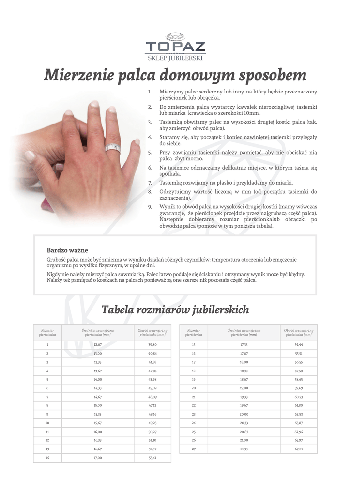 Mierzenie palca domowym sposobem 1. Mierzymy palec serdeczny lub inny, na który będzie przeznaczony pierścionek lub obrączka. 2. Do zmierzenia palca wystarczy kawałek nierozciągliwej tasiemki lub miarka krawiecka o szerokości 10mm. 3. Tasiemką obwijamy palec na wysokości drugiej kostki palca (tak, aby zmierzyć obwód palca). 4. Staramy się, aby początek i koniec nawiniętej tasiemki przylegały do siebie. 5. Przy zawijaniu tasiemki należy pamiętać, aby nie obciskać nią palca zbyt mocno. 6. Na tasiemce odznaczamy delikatnie miejsce, w którym taśma się spotkała. 7. Tasiemkę rozwijamy na płasko i przykładamy do miarki. 8. Odczytujemy wartość liczoną w mm (od początku tasiemki do zaznaczenia). 9. Wynik to obwód palca na wysokości drugiej kostki (mamy wówczas gwarancję, że pierścionek przejdzie przez najgrubszą część palca). Następnie dobieramy rozmiar pierścionkalub obrączki po obwodzie palca (pomoże w tym poniższa tabela). Bardzo ważne Grubość palca może być zmienna w wyniku działań różnych czynników: temperatura otoczenia lub zmęczenie organizmu po wysiłku fizycznym, w upalne dni. Nigdy nie należy mierzyć palca suwmiarką. Palec łatwo poddaje się ściskaniu i otrzymany wynik może być błędny. Należy też pamiętać o kostkach na palcach ponieważ są one szersze niż pozostała część palca. Tabela rozmiarów jubilerskich Rozmiar pierścionka Średnica wewnętrzna pierścionka [mm] Obwód wewnętrzny pierścionka [mm] Rozmiar pierścionka Średnica wewnętrzna pierścionka [mm] Obwód wewnętrzny pierścionka [mm] 1 12,67 39,80 15 17,33 54,44 2 13,00 40,84 16 17,67 55,51 3 13,33 41,88 17 18,00 56,55 4 13,67 42,95 18 18,33 57,59 5 14,00 43,98 19 18,67 58,65 6 14,33 45,02 20 19,00 59,69 7 14,67 46,09 21 19,33 60,73 8 15,00 47,12 22 19,67 61,80 9 15,33 48,16 23 20,00 62,83 10 15,67 49,23 24 20,33 63,87 11 16,00 50,27 25 20,67 64,94 12 16,33 51,30 26 21,00 65,97 13 16,67 52,37 27 21,33 67,01 14 17,00 53,41