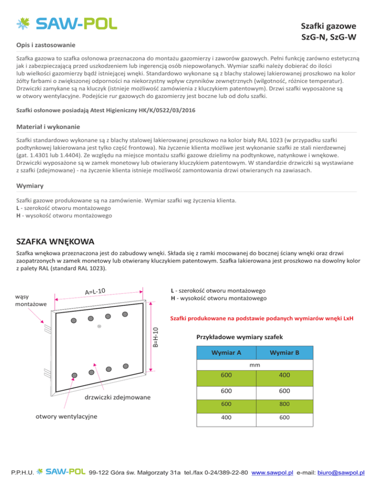 Szafki gazowe SzG-N, SzG-W Opis i zastosowanie Szafka gazowa to szafka osłonowa przeznaczona do montażu gazomierzy i zaworów gazowych. Pełni funkcję zarówno estetyczną jak i zabezpieczającą przed uszkodzeniem lub ingerencją osób niepowołanych. Wymiar szafki należy dobierać do ilości lub wielkości gazomierzy bądź istniejącej wnęki. Standardowo wykonane są z blachy stalowej lakierowanej proszkowo na kolor żółty farbami o zwiększonej odporności na niekorzystny wpływ czynników zewnętrznych (wilgotność, różnice temperatur). Drzwiczki zamykane są na kluczyk (istnieje możliwość zamówienia z kluczykiem patentowym). Drzwi szafki wyposażone są w otwory wentylacyjne. Podejście rur gazowych do gazomierzy jest boczne lub od dołu szafki. Szafki osłonowe posiadają Atest Higieniczny HK/K/0522/03/2016 Materiał i wykonanie Szafki standardowo wykonane są z blachy stalowej lakierowanej proszkowo na kolor biały RAL 1023 (w przypadku szafki podtynkowej lakierowana jest tylko część frontowa). Na życzenie klienta możliwe jest wykonanie szafki ze stali nierdzewnej (gat. 1.4301 lub 1.4404). Ze względu na miejsce montażu szafki gazowe dzielimy na podtynkowe, natynkowe i wnękowe. Drzwiczki wyposażone są w zamek monetowy lub otwierany kluczykiem patentowym. W standardzie drzwiczki są wystawiane z szafki (zdejmowane) - na życzenie klienta istnieje możliwość zamontowania drzwi otwieranych na zawiasach. Wymiary Szafki gazowe produkowane są na zamówienie. Wymiar szafki wg życzenia klienta. L - szerokość otworu montażowego H - wysokość otworu montażowego SZAFKA WNĘKOWA Szafka wnękowa przeznaczona jest do zabudowy wnęki. Składa się z ramki mocowanej do bocznej ściany wnęki oraz drzwi zaopatrzonych w zamek monetowy lub otwierany kluczykiem patentowym. Szafka lakierowana jest proszkowo na dowolny kolor z palety RAL (standard RAL 1023). wąsy montażowe A=L-10 L - szerokość otworu montażowego H - wysokość otworu montażowego B=H-10 Szafki produkowane na podstawie podanych wymiarów wnęki LxH Przykładowe wymiary szafek Wymiar A Wymiar B mm drzwiczki zdejmowane otwory wentylacyjne P.P.H.U. 600 400 600 600 600 800 400 600 99-122 Góra św. Małgorzaty 31a tel./fax 0-24/389-22-80 www.sawpol.pl e-mail: [email protected] Szafki gazowe SzG-N, SzG-W Wymiary - c.d. szafka wykonana ze stali ocynkowanej lakierowanej proszkowo na kolor żółty RAL1023 SZAFKA NATYNKOWA Szafka natynkowa ma zastosowanie w przypadku gdy nie jest możliwe wykonanie wnęki w ścianie. ść A oko r e z s szafki natynkowe w standardzie nie posiadają pleców montaż szafki do ściany Wysokość B otwory wentylacyjne Przykładowe wymiary szafek Wymiar A Wymiar B Wymiar C mm gł ęb drzwiczki zdejmowane ok oś ć C 600 400 250 600 600 250 600 800 250 400 600 250 Sposób złożenia zamówienia Zamówienia prosimy składać wg poniższego wzoru: SzG- 'R' / 'LxH' / 'G' / 'RAL' / 'M' 'R' 'LxH' 'G' 'RAL' 'M' - rodzaj szafki: P - podtynkowa N - natynkowa W - wnękowa - wymiar otworu montażowego (szerokość x wysokość) w mm - głębokość szafki - kolor szafki wg palety RAL (standard RAL1023*) - materiał: OC - stal ocynkowana* AL - aluminium KO - stal nierdzewna (gat. 1.4301 lub 1.4404) * - w przypadku nie podania informacji zostaną zastosowane standardowe parametry * - w przypadku szczególnych warunków na miejscu montażu prosimy o podanie takich informacji (np. bez tylnej lub dolnej ściany) P.P.H.U. 99-122 Góra św. Małgorzaty 31a tel./fax 0-24/389-22-80 www.sawpol.pl e-mail: [email protected]