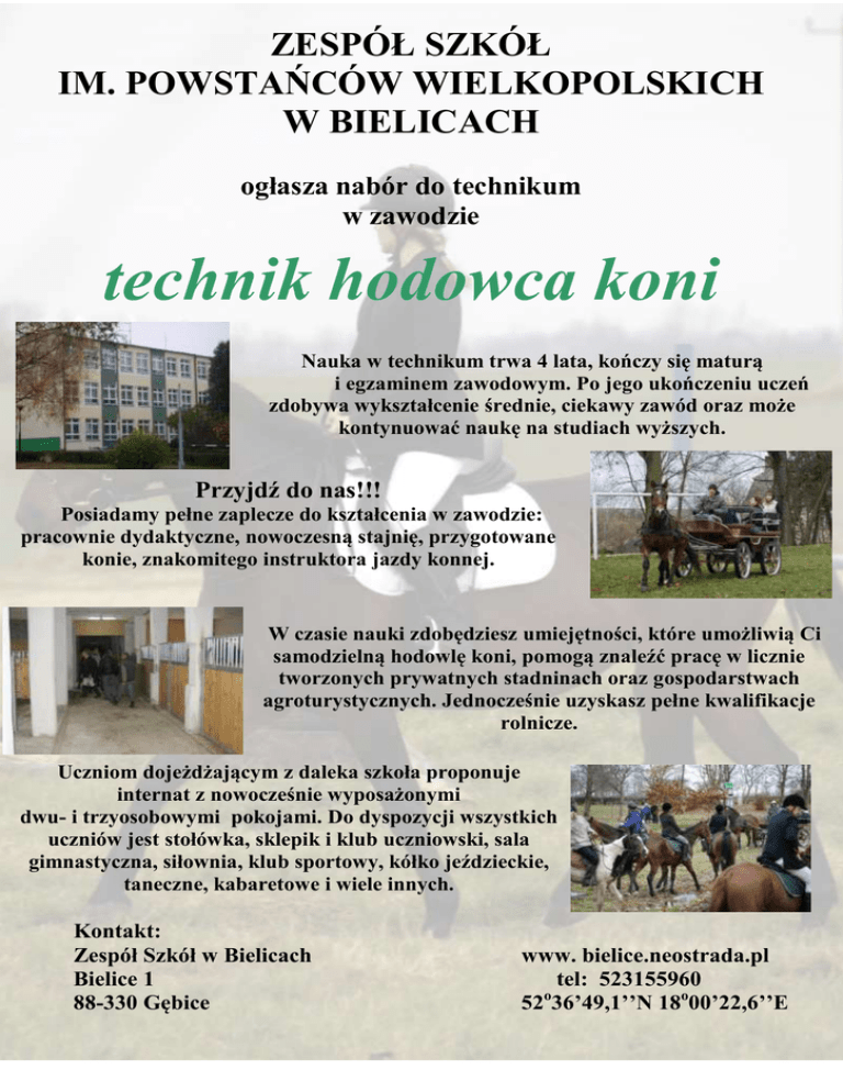 ZESPÓŁ SZKÓŁ IM. POWSTAŃCÓW WIELKOPOLSKICH W BIELICACH ogłasza nabór do technikum w zawodzie technik hodowca koni Nauka w technikum trwa 4 lata, kończy się maturą i egzaminem zawodowym. Po jego ukończeniu uczeń zdobywa wykształcenie średnie, ciekawy zawód oraz może kontynuować naukę na studiach wyższych. Przyjdź do nas!!! Posiadamy pełne zaplecze do kształcenia w zawodzie: pracownie dydaktyczne, nowoczesną stajnię, przygotowane konie, znakomitego instruktora jazdy konnej. W czasie nauki zdobędziesz umiejętności, które umożliwią Ci samodzielną hodowlę koni, pomogą znaleźć pracę w licznie tworzonych prywatnych stadninach oraz gospodarstwach agroturystycznych. Jednocześnie uzyskasz pełne kwalifikacje rolnicze. Uczniom dojeżdżającym z daleka szkoła proponuje internat z nowocześnie wyposażonymi dwu- i trzyosobowymi pokojami. Do dyspozycji wszystkich uczniów jest stołówka, sklepik i klub uczniowski, sala gimnastyczna, siłownia, klub sportowy, kółko jeździeckie, taneczne, kabaretowe i wiele innych. Kontakt: Zespół Szkół w Bielicach Bielice 1 88-330 Gębice www. bielice.neostrada.pl tel: 523155960 o 52 36’49,1’’N 18o00’22,6’’E