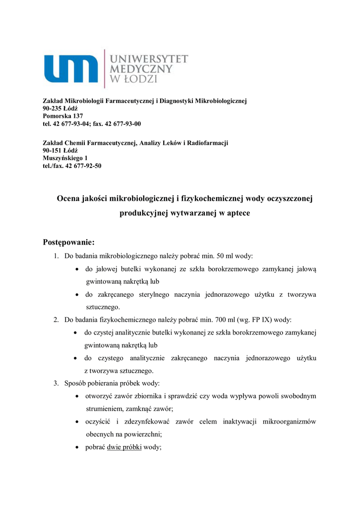 Zakład Mikrobiologii Farmaceutycznej i Diagnostyki Mikrobiologicznej 90-235 Łódź Pomorska 137 tel. 42 677-93-04; fax. 42 677-93-00 Zakład Chemii Farmaceutycznej, Analizy Leków i Radiofarmacji 90-151 Łódź Muszyńskiego 1 tel./fax. 42 677-92-50 Ocena jakości mikrobiologicznej i fizykochemicznej wody oczyszczonej produkcyjnej wytwarzanej w aptece Postępowanie: 1. Do badania mikrobiologicznego należy pobrać min. 50 ml wody: do jałowej butelki wykonanej ze szkła borokrzemowego zamykanej jałową gwintowaną nakrętką lub do zakręcanego sterylnego naczynia jednorazowego użytku z tworzywa sztucznego. 2. Do badania fizykochemicznego należy pobrać min. 700 ml (wg. FP IX) wody: do czystej analitycznie butelki wykonanej ze szkła borokrzemowego zamykanej gwintowaną nakrętką lub do czystego analitycznie zakręcanego naczynia jednorazowego użytku z tworzywa sztucznego. 3. Sposób pobierania próbek wody: otworzyć zawór zbiornika i sprawdzić czy woda wypływa powoli swobodnym strumieniem, zamknąć zawór; oczyścić i zdezynfekować zawór celem inaktywacji mikroorganizmów obecnych na powierzchni; pobrać dwie próbki wody; butelki niezwłocznie szczelnie zamknąć unikając kontaminacji nakrętki i oznakować naczynia. 4. Oznakowanie naczyń: butelki zaopatrzyć w trwałe etykiety, zawierające następujące informacje: rodzaj badania (badanie mikrobiologiczne, badanie fizykochemiczne), data i godzina pobrania, miejsce pobrania, nazwa i adres zleceniodawcy (pieczątka apteki), imię i nazwisko osoby pobierającej. 5. Naczynia zabezpieczyć z zewnątrz opakowaniem chroniącym przed zanieczyszczeniem. 6. Aby zminimalizować zmiany w próbkach zaleca się ich pobieranie, przechowywanie i transportowanie w możliwie najkrótszym czasie. 7. Próbki wody wraz z wypełnionym zleceniem należy dostarczyć jak najszybciej do laboratorium Zakładu Mikrobiologii Farmaceutycznej i Diagnostyki Mikrobiologicznej. Jakość wody oczyszczonej produkcyjnej wytwarzanej w aptece przez jedno urządzenie powinna być kontrolowana z częstotliwością zależną od wytwarzanej objętości: do 25 l dziennie – nie rzadziej niż co 90 dni od 25 l do 150 l dziennie - nie rzadziej niż co 30 dni Piśmiennictwo: Farmakopea Polska IX PN-EN 25667-2, wrzesień 1999, Jakość wody. Pobieranie próbek. Wytyczne dotyczące technik pobierania próbek. PN-ISO 5667-5, lipiec 2003, Jakość wody. Pobieranie próbek. Część 5: Wytyczne dotyczące pobierania próbek wody do picia i wody używanej do produkcji żywności i napojów.