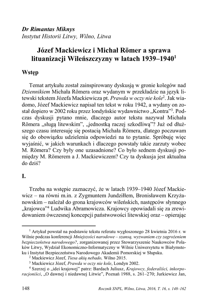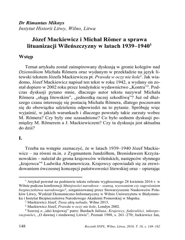 Dr Rimantas Miknys Instytut Historii Litwy, Wilno, Litwa Józef Mackiewicz i Michał Römer a sprawa lituanizacji Wileńszczyzny w latach 1939–19401 Wstęp Temat artykułu został zainspirowany dyskusją w gronie kolegów nad Dziennikiem Michała Römera oraz wydanym w przekładzie na język litewski tekstem Józefa Mackiewicza pt. Prawda w oczy nie kole2. Jak wiadomo, Józef Mackiewicz napisał ten tekst w roku 1942, a wydany on został dopiero w 2002 roku przez londyńskie wydawnictwo „Kontra”3. Podczas dyskusji pytano mnie, dlaczego autor tekstu nazywał Michała Römera „sługą litewskim”, „jednostką raczej szkodliwą”? Już od dłuższego czasu interesuję się postacią Michała Römera, dlatego poczuwam się do obowiązku udzielenia odpowiedzi na to pytanie. Spróbuję więc wyjaśnić, w jakich warunkach i dlaczego powstały takie zarzuty wobec M. Römera? Czy były one uzasadnione? Co było sednem dyskusji pomiędzy M. Römerem a J. Mackiewiczem? Czy ta dyskusja jest aktualna do dziś? I. Trzeba na wstępie zaznaczyć, że w latach 1939–1940 Józef Mackiewicz – na równi m.in. z Zygmuntem Jundziłłem, Bronisławem Krzyżanowskim – należał do grona krajowców wileńskich, następców słynnego „krajowca”4 Ludwika Abramowicza. Krajowcy opowiadali się za zrewidowaniem ówczesnej koncepcji państwowości litewskiej oraz – opierając Artykuł powstał na podstawie tekstu referatu wygłoszonego 28 kwietnia 2016 r. w Wilnie podczas konferencji Mniejszości narodowe – szansą, wyzwaniem czy zagrożeniem bezpieczeństwa narodowego?, zorganizowanej przez Stowarzyszenie Naukowców Polaków Litwy, Wydział Ekonomiczno-Informatyczny w Wilnie Uniwersytetu w Białymstoku i Instytut Bezpieczeństwa Narodowego Akademii Pomorskiej w Słupsku. 2 Mackiewicz Józef, Tiesa akių nebado, Wilno 2015. 3 Mackiewicz Józef, Prawda w oczy nie kole, Londyn 2002. 4 Szerzej o „idei krajowej” patrz: Bardach Juliusz, Krajowcy, federaliści, inkorporacjoniści, „O dawnej i niedawnej Litwie”, Poznań 1988, s. 261–270; Jurkiewicz Jan, 1 148 Rocznik SNPL, Wilno, Litwa, 2016, T. 16, s. 148–162 Rocznik Stowarzyszenia Naukowców Polaków Litwy, T. 16 się na fakcie odzyskania Wilna i Wileńszczyzny w listopadzie 1939 r. – przekształceniem jej w koncepcję państwowości Litwy historycznej. J. Mackiewicz w swojej książce wspominał: „Krajowcem stałem się przed wojną, z głębokiego przekonania. (…) Jeżeli chodzi o „ideę krajową” przeze mnie, a może dotychczas raczej tylko we mnie, reprezentowaną (nie miałem możności jej rozwinąć ze wzglądów cenzuralno-politycznych), pozostaję jej wierny, gdyż przekonany jestem nadal o jej słuszności”5. Według niego „idea krajowa” jest ścisłe powiązana z odrodzeniem państwa na terenach byłego Wielkiego Księstwa Litewskiego: „To idealizowane przeze mnie współczesne Wielkie Księstwo Litewskie miałoby charakter państwa trójjęzycznego, trójnarodowego: Białorusini, Litwini, Polacy. (…) wszyscy mogą być zadowoleni i mam wrażenie, iż łącznie z bogatym, silnym i niezależnym państwem, byliby zadowoleni w istocie, gdyby językowe równouprawnienie przewidywało pierwszeństwo litewskiej mowy w Kownie, polskiej w Wilnie, białoruskiej w Mińsku”6. Niestety, zdaniem J. Mackiewicza, wszystkie szanse zostały zaprzepaszczone z winy Litwinów. W swoim traktacie on konstatuje ze smutkiem: „(…) Po wejściu do Wilna Litwini nie okazali ani taktu politycznego, ani rozumu politycznego. (…) Litwin w Wilnie stał się bezkarnym. Nauka języka litewskiego zaczęła się od tych metod policyjnych (…). Odtąd Demokraci wileńscy w latach 1905–1914 (Zarys działalności politycznej), „Acta Baltico-Slavica”, t. 18, Poznań, 1983, s. 157–173; Krajowość – tradycje zgody narodów w dobie nacjonalizmów. Materiały z międzynarodowej konferencji naukowej w Instytucie Historii UAM w Poznaniu (11–12 maja 1998), pod red. J. Jurkiewicza, Poznań 1999; Szpoper Dariusz, Gente Lithuana, Natione Lithuana. Myśl polityczna i działalność Konstancji Skirmunt (1851–1934), Gdańsk 2009; Смалянчук Алесь, „Краёвасць” у беларускай и літоўскай гісторыі, Беларускі гістарычны агляд (Belarusian Historical Review), t. 4, Менск 1997, с. 19–31; Tegoż, Krajovaść vis-à-vis Belarusian and Lithuanian National Movements in the Early 20th Century, „Belarus and its Neighbors: Historical Perceptions and Political Constructs”, edited by A. Łahwiniec, T. Czulickaja, Warszawa 2013, s. 69–80; Miknys Rimantas, Vilniaus autonomistai ir jų 1904–1905 m. Lietuvos politinės autonomijos projektai, „Lietuvių atgimimo istorijos studijos” (dalej – LAIS), t. 3, Vilnius 1991, s. 173–198; Solak Zbigniew, Niedokończona autobiografia Michała Römera, „Rocznik biblioteki PAN w Krakowie, Rok XLI (1996)”, s. 92–122; Tegoż, Między Polską a Litwą. Życie i działalność Michała Römera 1880– 1920, Kraków 2004, s. 59–235. 5 Mackiewicz Józef, Prawda w oczy nie kole, s. 7–8. 6 Tamże, s. 14. 149 Artykuły naukowe dwustutysięczne miasto, w którym język litewski znało nie więcej jak dwa procent, musiało się już tylko domyślać, co zawierają do sprzedaży sklepy nie mogąc się połapać, gdzie jest szewc, a gdzie krawiec, że „kirpykla” to fryzjer, a „kepykla” to piekarnia, a „skalbykla” to pralnia. Potem nastąpiło litewszczenie miejscowości. (…) W ten sposób zainteresowana osoba mogła zapoznać się z nowym rozporządzeniem, ale nie wiedziała często rzeczy najważniejszej, gdzie ono obowiązuje. (…) Na przykład miejscowość „Czarny Bór” nazywa się nagle „Juodšiliai”, albo „Porubanek” – „Kirtimai”, albo „Nowa Wilejka” - „Naujoji Vilnia”. (…) W ten sposób zaczęła się akcja litewszczenia kraju, jak się okazało się – jedyna państwowa 