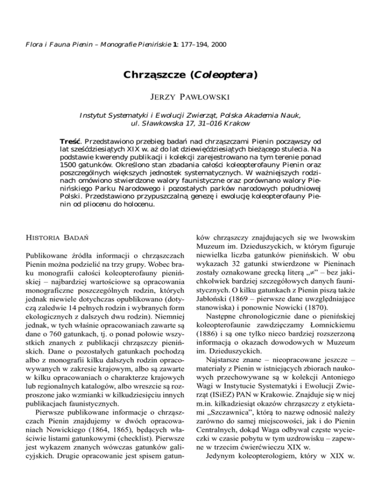 Flora i Fauna Pienin – Monografie Pienińskie 1: 177–194, 2000 Chrza˛szcze (Coleoptera) JERZY PAWŁOWSKI Instytut Systematyki i Ewolucji Zwierza˛t, Polska Akademia Nauk, ul. Sławkowska 17, 31–016 Krakow Treść. Przedstawiono przebieg badań nad chrza˛szczami Pienin pocza˛wszy od lat sześćdziesia˛tych XIX w. aż do lat dziewie˛ćdziesia˛tych bieża˛cego stulecia. Na podstawie kwerendy publikacji i kolekcji zarejestrowano na tym terenie ponad 1500 gatunków. Określono stan zbadania całości koleopterofauny Pienin oraz poszczególnych wie˛kszych jednostek systematycznych. W ważniejszych rodzinach omówiono stwierdzone walory faunistyczne oraz porównano walory Pienińskiego Parku Narodowego i pozostałych parków narodowych południowej Polski. Przedstawiono przypuszczalna˛ geneze˛ i ewolucje˛ koleopterofauny Pienin od pliocenu do holocenu. HISTORIA BADAŃ Publikowane źródła informacji o chrza˛szczach Pienin można podzielić na trzy grupy. Wobec braku monografii całości koleopterofauny pienińskiej – najbardziej wartościowe sa˛ opracowania monograficzne poszczególnych rodzin, których jednak niewiele dotychczas opublikowano (dotycza˛ zaledwie 14 pełnych rodzin i wybranych form ekologicznych z dalszych dwu rodzin). Niemniej jednak, w tych właśnie opracowaniach zawarte sa˛ dane o 760 gatunkach, tj. o ponad połowie wszystkich znanych z publikacji chrza˛szczy pienińskich. Dane o pozostałych gatunkach pochodza˛ albo z monografii kilku dalszych rodzin opracowywanych w zakresie krajowym, albo sa˛ zawarte w kilku opracowaniach o charakterze krajowych lub regionalnych katalogów, albo wreszcie sa˛ rozproszone jako wzmianki w kilkudziesie˛ciu innych publikacjach faunistycznych. Pierwsze publikowane informacje o chrza˛szczach Pienin znajdujemy w dwóch opracowaniach Nowickiego (1864, 1865), be˛da˛cych właściwie listami gatunkowymi (checklist). Pierwsze jest wykazem znanych wówczas gatunków galicyjskich. Drugie opracowanie jest spisem gatun- ków chrza˛szczy znajduja˛cych sie˛ we lwowskim Muzeum im. Dzieduszyckich, w którym figuruje niewielka liczba gatunków pienińskich. W obu wykazach 32 gatunki stwierdzone w Pieninach zostały oznakowane grecka˛ litera˛ „π” – bez jakichkolwiek bardziej szczegółowych danych faunistycznych. O kilku gatunkach z Pienin pisza˛ także Jabłoński (1869 – pierwsze dane uwzgle˛dniaja˛ce stanowiska) i ponownie Nowicki (1870). Naste˛pne chronologicznie dane o pienińskiej koleopterofaunie zawdzie˛czamy Łomnickiemu (1886) i sa˛ one tylko nieco bardziej rozszerzona˛ informacja˛ o okazach dowodowych w Muzeum im. Dzieduszyckich. Najstarsze znane – nieopracowane jeszcze – materiały z Pienin w istnieja˛cych zbiorach naukowych przechowywane sa˛ w kolekcji Antoniego Wagi w Instytucie Systematyki i Ewolucji Zwierza˛t (ISiEZ) PAN w Krakowie. Znajduje sie˛ w niej m.in. kilkadziesia˛t okazów chrza˛szczy z etykietami „Szczawnica”, która˛ to nazwe˛ odnosić należy zarówno do samej miejscowości, jak i do Pienin Centralnych, doka˛d Waga odbywał cze˛ste wycieczki w czasie pobytu w tym uzdrowisku – zapewne w trzecim ćwierćwieczu XIX w. Jedynym koleopterologiem, który w XIX w. 178 FLORA I FAUNA P IENIN – Monografie Pienińskie, t.1 zebrał wie˛kszy materiał chrza˛szczy w Pieninach był Stefan Stobiecki. Dwukrotnie przeprowadził on na tym terenie kilkudniowe odłowy: w sierpniu 1880 r. i w lipcu 1892 r. Badał zarówno środowiska podnóżowe nad Dunajcem (mie˛dzy Czorsztynem a Szczawnica˛) oraz w Krościenku, jak i partie grzbietowe (od Sokolicy do Trzech Koron). W jego bogatej kolekcji chrza˛szczy galicyjskich, przechowywanej w zbiorach ISiEZ PAN w Krakowie, okazy z Pienin (kilkaset gatunków) sa˛ umieszczone w seriach z „Podkarpacia” z zielonym oznakowaniem barwnym i przez to łatwe do odszukania. Niestety materiały Stobieckiego nie doczekały sie˛ dotychczas całościowego opracowania, a tylko niewielki procent gatunków z jego kolekcji figuruje w kilku publikacjach innych autorów, opracowuja˛cych różne grupy chrza˛szczy. Dotyczy to także okazów zebranych w Pieninach. W drugiej i trzeciej dekadzie XX w. cze˛sto odwiedzał Pieniny znany koleopterolog warszawski Szymon Tenenbaum. Wiadomo, iż zbierał on tu materiały w maju 1912 r., a naste˛pnie w okresie mie˛dzywojennym: od kwietnia do sierpnia 1924 r., w maju i miesia˛cach wakacyjnych 1925 r., a także w lipcu 1927 i 1928 oraz w maju i czerwcu 1929 r. Ostatni jego pobyt w Pieninach miał miejsce w sierpniu 1939 r. Niestety w publikacjach Tenenbauma (1925, 1926, 1929, 1931) znajdujemy informacje tylko o kilkudziesie˛ciu najbardziej interesuja˛cych gatunkach pienińskich – głównie o taksonach nowych dla Polski. Dane o innych pienińskich gatunkach z tej kolekcji zostały zamieszczone w publikacjach innych autorów, np.: Siemaszkowie 1928 (Carabidae), 1932 (Staphylinidae), 1934 (głównie Haliplidae), Szymczakowski 1959 (Catopidae), Petryszak 1980 (Rhinomaceridae, Attelabidae, Apionidae, Curculionidae), Kuśka 1995 (Cantharinae) i in. W lipcu 1934 r. badał entomofaune˛ Pienin (ze szczególnym uwzgle˛dnieniem form kserotermofilnych okolic Niedzicy i Czorsztyna) Roman Kuntze – wówczas kustosz Muzeum im. Dzieduszyckich we Lwowie. Najbardziej znanym owocem tych badań była rozprawa „Problemy zoogeograficzne Pienin” (Kuntze 1934), a kilkanaście bardziej interesuja˛cych gatunków chrza˛szczy z Pienin wymienił także w swoich późniejszych publikacjach (Kuntze 1936; Kuntze, Noskiewicz 1938). Wiadomo także, iż w ostatnich latach przedwojennych Kuntze wraz z Tenenbaumem – jako najlepsi znawcy koleopterofauny kserotermicznych obszarów II Rzeczypospolitej – przygotowywali wspólne porównawcze opracowanie chrza˛szczy Podola i Pienin, którego re˛kopis zagina˛ł w okresie okupacji1. Najwcześniej inwentaryzowana˛ przez specjaliste˛ grupa˛ chrza˛szczy w Pieninach była rodzina korni