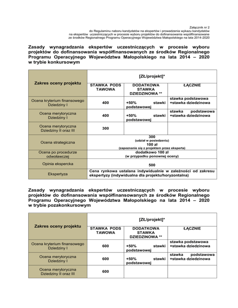 Załącznik nr 2 do Regulaminu naboru kandydatów na ekspertów i prowadzenia wykazu kandydatów na ekspertów uczestniczących w procesie wyboru projektów do dofinansowania współfinansowane ze środków Regionalnego Programu Operacyjnego Województwa Małopolskiego na lata 2014-2020 Zasady wynagradzania ekspertów uczestniczących w procesie wyboru projektów do dofinansowania współfinansowanych ze środków Regionalnego Programu Operacyjnego Województwa Małopolskiego na lata 2014 – 2020 w trybie konkursowym [ZŁ/projekt]* Zakres oceny projektu STAWKA PODS TAWOWA DODATKOWA STAWKA DZIEDZINOWA ** Ocena kryterium finansowego Dziedziny I 400 +50% stawki podstawowej Ocena merytoryczna Dziedziny I 400 +50% stawki podstawowej Ocena merytoryczna Dziedziny II oraz III 300 ŁĄCZNIE stawka podstawowa +stawka dziedzinowa stawka podstawowa +stawka dziedzinowa 300 (udział w posiedzeniu) Ocena strategiczna 100 zł (zapoznanie się z projektem przez eksperta) dodatkowo 100 zł Ocena po procedurze odwoławczej (w przypadku ponownej oceny) Opinia ekspercka 500 Ekspertyza Cena rynkowa ustalana indywidualnie w zależności od zakresu ekspertyzy (indywidualna dla projektu/horyzontalna) Zasady wynagradzania ekspertów uczestniczących w procesie wyboru projektów do dofinansowania współfinansowanych ze środków Regionalnego Programu Operacyjnego Województwa Małopolskiego na lata 2014 – 2020 w trybie pozakonkursowym [ZŁ/projekt]* Zakres oceny projektu STAWKA PODS TAWOWA DODATKOWA STAWKA DZIEDZINOWA ** Ocena kryterium finansowego Dziedziny I 600 +50% stawki podstawowej Ocena merytoryczna Dziedziny I 600 +50% stawki podstawowej Ocena merytoryczna Dziedziny II oraz III 600 ŁĄCZNIE stawka podstawowa +stawka dziedzinowa stawka podstawowa +stawka dziedzinowa Opinia ekspercka 500 Ekspertyza Cena rynkowa ustalana indywidualnie w zależności od zakresu ekspertyzy (indywidualna dla projektu/horyzontalna) * W przypadku ekspertów, którzy są podatnikami VAT, do ww. kwot doliczany jest podatek VAT (stawka + VAT). ** STAWKA DZIEDZINOWA – z uwagi na wielobranżowość i złożoność projektów oraz konieczność oceny powiązań pomiędzy poszczególnymi inwestycjami w poniżej wskazanych dziedzinach przyznawane będzie dodatkowe wynagrodzenie w postaci stawki dziedzinowej. DZIEDZINY: 1. Społeczeństwo informacyjne. 2. Przygotowanie terenów inwestycyjnych. 3. Poprawa efektywności energetycznej i energia ze źródeł odnawialnych. 4. Infrastruktura turystyczna. 5. Rewitalizacja obszarów miejskich i wiejskich (dodatkowa stawka dziedzinowa będzie przyznawana wyłącznie w zakresie oceny projektów dot. rewitalizacji miast i obszarów poprzemysłowych). 6. Infrastruktura ochrony zdrowia (uwzględnienie dodatkowego wynagrodzenia w ramach przedmiotowej dziedziny w zależności od zakresu działania Komitetu Ochrony Zdrowia, tj. kwestia weryfikacji analizy potrzeb inwestycyjnych w danym obszarze ochrony zdrowia).