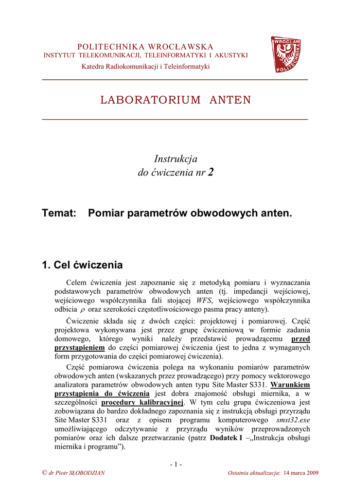 POLITECHNIKA WROCŁAWSKA INSTYTUT TELEKOMUNIKACJI, TELEINFORMATYKI I AKUSTYKI Katedra Radiokomunikacji i Teleinformatyki LABORATORIUM ANTEN Instrukcja do ćwiczenia nr 2 Temat: Pomiar parametrów obwodowych anten. 1. Cel ćwiczenia Celem ćwiczenia jest zapoznanie się z metodyką pomiaru i wyznaczania podstawowych parametrów obwodowych anten (tj. impedancji wejściowej, wejściowego współczynnika fali stojącej WFS, wejściowego współczynnika odbicia ρ oraz szerokości częstotliwościowego pasma pracy anteny). Ćwiczenie składa się z dwóch części: projektowej i pomiarowej. Część projektowa wykonywana jest przez grupę ćwiczeniową w formie zadania domowego, którego wyniki należy przedstawić prowadzącemu przed przystąpieniem do części pomiarowej ćwiczenia (jest to jedna z wymaganych form przygotowania do części pomiarowej ćwiczenia). Część pomiarowa ćwiczenia polega na wykonaniu pomiarów parametrów obwodowych anten (wskazanych przez prowadzącego) przy pomocy wektorowego analizatora parametrów obwodowych anten typu Site Master S331. Warunkiem przystąpienia do ćwiczenia jest dobra znajomość obsługi miernika, a w szczególności procedury kalibracyjnej. W tym celu grupa ćwiczeniowa jest zobowiązana do bardzo dokładnego zapoznania się z instrukcją obsługi przyrządu Site Master S331 oraz z opisem programu komputerowego smst32.exe umożliwiającego odczytywanie z przyrządu wyników przeprowadzonych pomiarów oraz ich dalsze przetwarzanie (patrz Dodatek I –„Instrukcja obsługi miernika i programu”). -1© dr Piotr SŁOBODZIAN Ostatnia aktualizacja: 14 marca 2009 2. Część projektowa ćwiczenia Grupa ćwiczeniowa wykonuje w ramach pracy domowej jedno lub dwa zadania projektowe. Oto przykłady: 1. Określić minimalny zysk anteny Yagi zapewniający bardzo dobrą jakość odbioru programu TV (X) w miejscowości (Y) (np. programu TVP–1 nadawanego ze Ślęży we Wrocławiu) [8]. 2. Zaprojektować i obliczyć parametry polowe i obwodowe n-elementowej anteny Yagi pracującej w zakresie częstotliwości (Z) i spełniającej odpowiednie normy (np. 11-elementowa antena na IV pasmo). Po dokładne dane do projektu (tj. X, Y i Z) należy zgłosić się do prowadzącego na zajęciach poprzedzających wykonanie ćwiczenia (dwa tygodnie przed terminem zajęć). 3. Część pomiarowa ćwiczenia Grupa ćwiczeniowa wykonuje pomiar parametrów obwodowych wskazanych przez prowadzącego ćwiczenie elementów, tj. wielowrotnika mikrofalowego i anteny. Celem pomiarów jest określenie (wyznaczenie) następujących parametrów: − impedancji wejściowej, − wejściowego współczynnika fali stojącej WFS, − wejściowego współczynnika odbicia ρ , − szerokości częstotliwościowego pasma pracy. Wyniki pomiarów zapisuje się w pamięci miernika Site Master, a po ich zakończeniu kopiuje się do komputera. Po częściowej ich obróbce za pomocą programu smst32.exe zapisuje się je na dyskietce 3,5”. 4. Zawartość sprawozdania Sprawozdanie należy przygotować zgodnie z zaleceniami przekazanymi przez prowadzącego na zajęciach wprowadzających (patrz również strona internetowa). Sprawozdanie powinno zawierać (oprócz elementów formalnych): - dołączony do sprawozdania autoryzowany przez prowadzącego protokół relacjonujący przebieg ćwiczenia (kolejność pomiarów), - dla każdego z badanych elementów wykresy WFS w funkcji częstotliwości (nie kopiowane z programu smst32.exe); oznaczyć szerokość częstotliwościowego pasma pracy badanego elementu, - przykładowe przeliczenie WFS na ρ [dB] (koniecznie wzory!), - dla każdego z badanych elementów wykresy ρ [dB] w funkcji częstotliwości (nie kopiowane z programu smst32.exe), oznaczyć szerokość częstotliwościowego pasma pracy badanego elementu dla WFS<1.5, -2© dr Piotr SŁOBODZIAN Ostatnia aktualizacja: 14 marca 2009 - przykładowe przeliczenie parametrów odbiciowych na Z we (koniecznie wzory!), - dla każdego z badanych elementów wykresy obliczonej impedancji wejściowej Z we (część rzeczywista i urojona na wspólnym wykresie), - dla każdego z badanych elementów przedstawić Z we na wykresie Smitha (nie kopiować z programu smst32.exe); na wykresie oznaczyć koła stałego WFS=1.5 oraz WFS=2 (lub określonego w normie dla danego typu anten), - jeżeli pomiary dotyczyły anteny o nominalnej impedancji wejściowej różnej od 50 Ω (taka jest impedancja odniesienia miernika), to należy dokonać przeliczenia zmierzonego WFS oraz ρ do impedancji odniesienia właściwej dla badanej anteny (np. dla anten TV Z o =75 Ω); w sprawozdaniu opisać kolejne kroki obliczeniowe i przykładowe obliczenia; obliczone (nowe) wartości WFS i ρ przedstawić na wykresach razem z wartościami zmierzonymi miernikiem (porównanie); przedstawić porównanie Z we na wspólnym wykresie Smitha przy założeniu Z o =50 Ω oraz 75 Ω (dwie krzywe). Uwaga: proszę nie zamieszczać w sprawozdaniu tabel ze wszystkimi wynikami pomiarów (skopiowanych za pomocą programu smst32.exe z miernika); zamieścić tylko wybrane punkty pomiarowe (10 – 15 pkt. z pokazanego wykresu). 5. Wymagane przygotowanie Każdy student w grupie ćwiczeniowej musi być przygotowany do zajęć i mieć opanowany zakres wiedzy teoretycznej związanej z realizowanym ćwiczeniem. W ćwiczeniu wymagana jest znajomość następujących zagadnień (patrz literatura w pkt.7): - definicje parametrów obwodowych ( Z we , WFS, ρ lub Γ ) [1,2], - związek pomiędzy poszczególnymi parametrami obwodowymi, - definicja szerokości częstotliwościowego pasma pracy anteny [1,2], - proste zależności do szacowania częstotliwości pracy anten (dipoli) [1,2], - dopasowanie impedancyjne anteny (po co i w jaki sposób), - reprezentacja Z we na wykresie Smitha (zwarcie, rozwarcie, dopasowanie, położenie obszaru dobrego dopasowania impedancyjnego). Uwaga: przynieść na zajęcia wykres Smitha (format A4) !!! 6. Pomoce do ćwiczenia Do realizacji