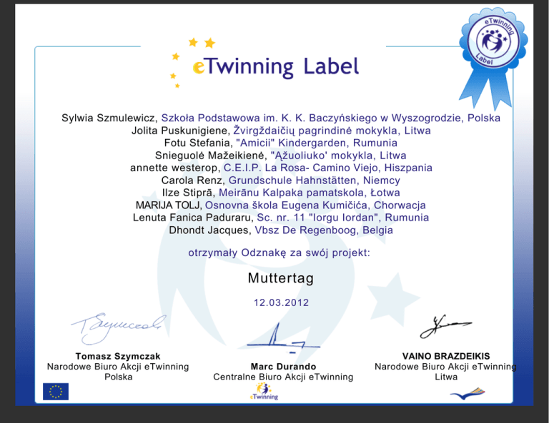 Sylwia Szmulewicz, Szkoła Podstawowa im. K. K. Baczyńskiego w Wyszogrodzie, Polska Jolita Puskunigiene, Žvirgždaičių pagrindinė mokykla, Litwa Fotu Stefania, "Amicii" Kindergarden, Rumunia Snieguolė Mažeikienė, "Ąžuoliuko' mokykla, Litwa annette westerop, C.E.I.P. La Rosa- Camino Viejo, Hiszpania Carola Renz, Grundschule Hahnstätten, Niemcy Ilze Stiprā, Meirānu Kalpaka pamatskola, Łotwa MARIJA TOLJ, Osnovna škola Eugena Kumičića, Chorwacja Lenuta Fanica Paduraru, Sc. nr. 11 "Iorgu Iordan", Rumunia Dhondt Jacques, Vbsz De Regenboog, Belgia otrzymały Odznakę za swój projekt: Muttertag 12.03.2012 Tomasz Szymczak Narodowe Biuro Akcji eTwinning Polska Marc Durando Centralne Biuro Akcji eTwinning VAINO BRAZDEIKIS Narodowe Biuro Akcji eTwinning Litwa