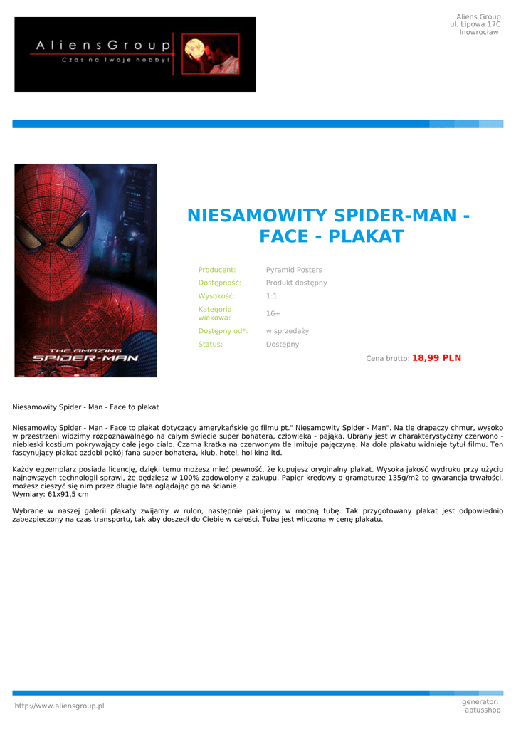 Aliens Group ul. Lipowa 17C Inowrocław NIESAMOWITY SPIDER-MAN FACE - PLAKAT Producent: Pyramid Posters Dostępność: Produkt dostępny Wysokość: 1:1 Kategoria wiekowa: 16+ Dostępny od*: w sprzedaży Status: Dostępny Cena brutto: 18,99 PLN Niesamowity Spider - Man - Face to plakat Niesamowity Spider - Man - Face to plakat dotyczący amerykańskie go filmu pt." Niesamowity Spider - Man". Na tle drapaczy chmur, wysoko w przestrzeni widzimy rozpoznawalnego na całym świecie super bohatera, człowieka - pająka. Ubrany jest w charakterystyczny czerwono niebieski kostium pokrywający całe jego ciało. Czarna kratka na czerwonym tle imituje pajęczynę. Na dole plakatu widnieje tytuł filmu. Ten fascynujący plakat ozdobi pokój fana super bohatera, klub, hotel, hol kina itd. Każdy egzemplarz posiada licencję, dzięki temu możesz mieć pewność, że kupujesz oryginalny plakat. Wysoka jakość wydruku przy użyciu najnowszych technologii sprawi, że będziesz w 100% zadowolony z zakupu. Papier kredowy o gramaturze 135g/m2 to gwarancja trwałości, możesz cieszyć się nim przez długie lata oglądając go na ścianie. Wymiary: 61x91,5 cm Wybrane w naszej galerii plakaty zwijamy w rulon, następnie pakujemy w mocną tubę. Tak przygotowany plakat jest odpowiednio zabezpieczony na czas transportu, tak aby doszedł do Ciebie w całości. Tuba jest wliczona w cenę plakatu. http://www.aliensgroup.pl generator: aptusshop